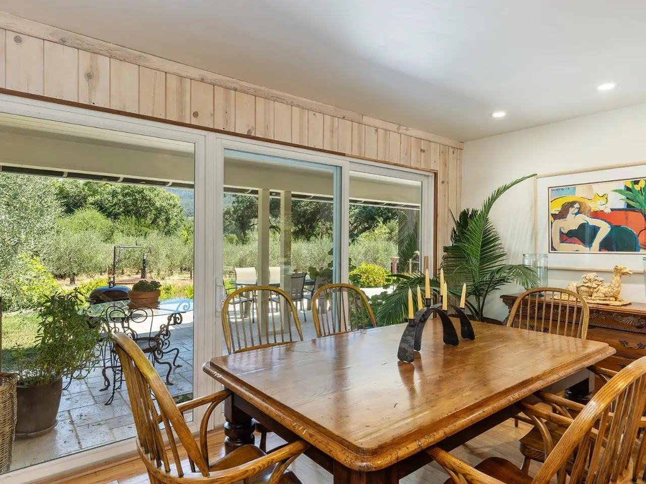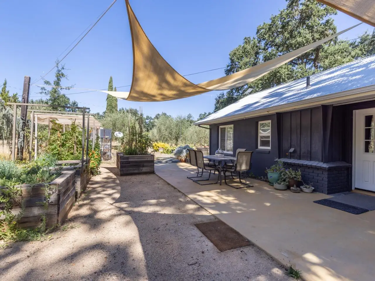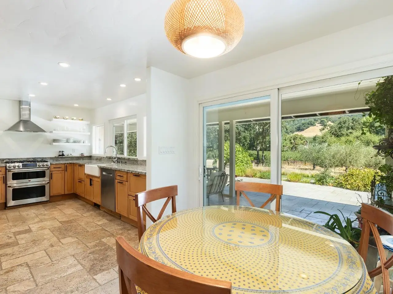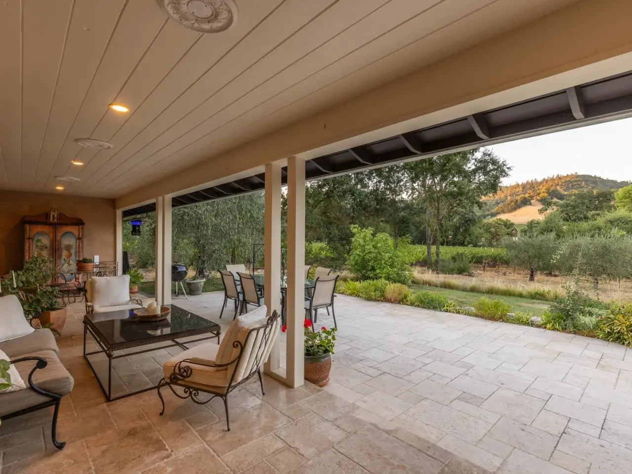 Nestled in a serene landscape featuring over 200 mature olive trees, this updated single-level main house plus additional single level 2nd dwelling and additional structures sit on a private 2.57 acre oasis. Just 4 miles from St. Helena and 2.5 miles to stunning Lake Hennessey, this Napa Valley compound exudes charm and tranquility. The main residence includes 2 bedrooms and 2.5 bathrooms within approximately 2,110 square feet, offering a spacious and inviting layout. Rustic hardwood and large-format stone floors enhance the interior, while expansive sliding patio doors seamlessly connect indoor and outdoor spaces. The kitchen features a quaint breakfast nook, granite countertops, high-end appliances, bar-top seating, and a large walk-in pantry, making it both functional and stylish. A private flex room with a separate entrance provides flexibility, ideal for a third bedroom, office, craft room, or gym. Step outside to discover a truly special outdoor space, complete with a covered back patio perfect for gatherings. Enjoy breathtaking views of the manicured olive orchard, neighboring vineyards and mountains beyond. Access the charming 910+/- square foot guest house and 805+/- sf storage building near the back of the property via a gravel pathway or a separate entrance off Rossi Rd.