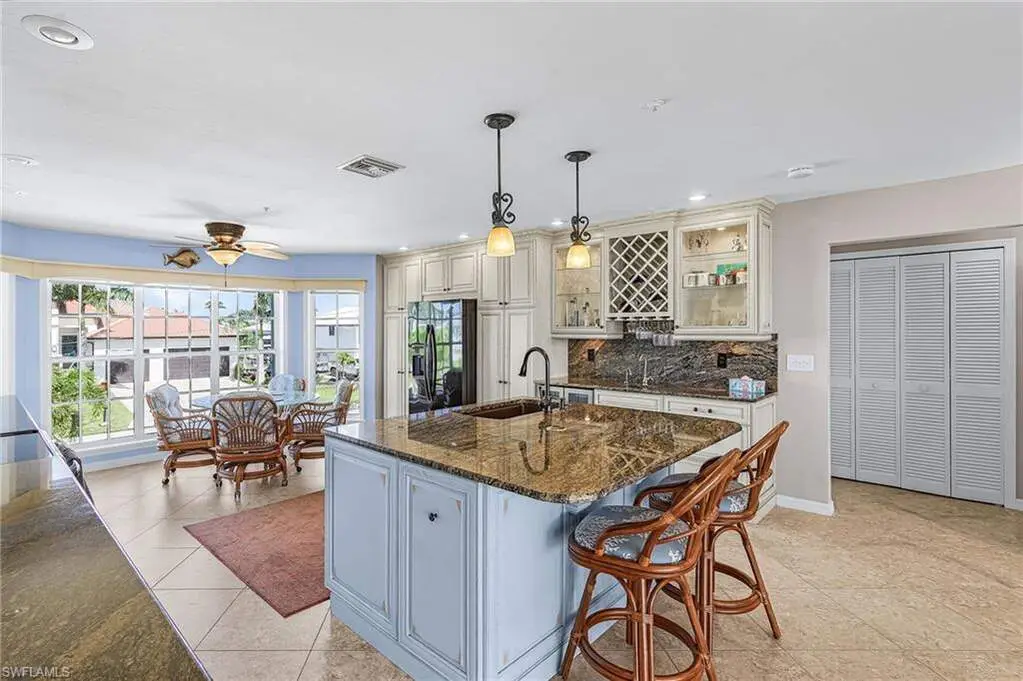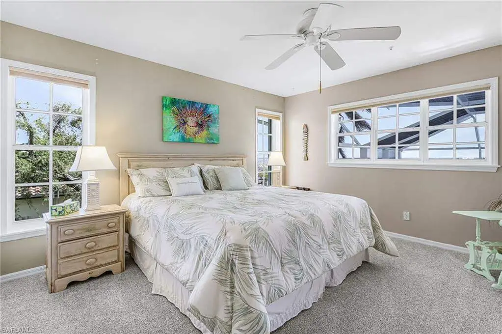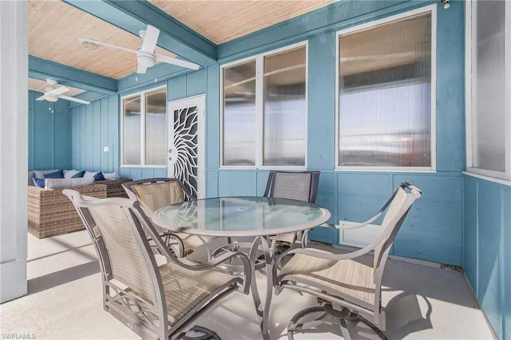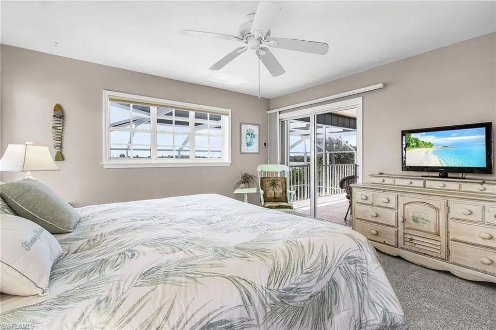 With the BEST view on Pine Island, this getaway stilt home has amazing amenities and upgrades including a wrap around composite boat dock with a 10,000# covered boat lift. Well constructed and maintained, this 4 bedroom, 3 bath home features one of the highest views of San Carlos Bay, Sanibel, and Pine Island Sound. Come and watch the dolphins and birds play. This home features a stone entry and an interior elevator that allows easy access to every floor. The first floor has a stunning open living area, kitchen, living room, and dining room with views of the bay. Impact pocket sliders lead to a large balcony and the two story pool cage allows for truly open living floor plan. The second floor has a spacious primary suite and luxurious bathroom with a sun porch overlooking the bay. The third floor is a den/4th bedroom and balcony looking out at the bay, with views of the Sanibel bridge and Punta Rasa. The ground floor has a paver driveway, an extra long and high 2 car garage, full bath, laundry, workshop, storage and a beautifully resurfaced in ground pool with cage, solar and electric pool heat, and a new pool pump. There is a fully automated AquaLink system to control pool functions. The backyard is aluminum fenced for a pet safe backyard. City water plus a well plumbed for Rainbird automated/zoned lawn irrigation. This home has optimum hurricane protection with cement board siding, accordion and roll down shutters, impact sliders on main level, closed cell spray foam insulation, shear walls, and upgraded hurricane strapping. It is fully wind mitigated. This home has new electric service panel and meter in 2022, retractable garage door automatic roll down screen in 2024, new composite front porch and rear stairs in 2024, and new washer and dryer in 2023. Two story pool cage was also new is 2023. Make your appointment to see this fantastic home.