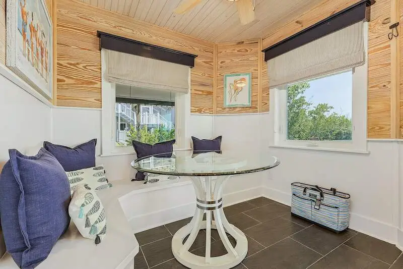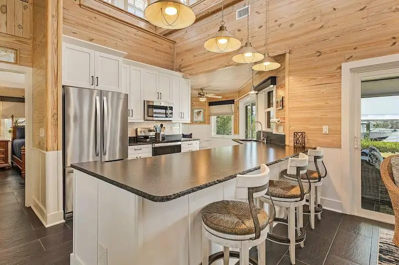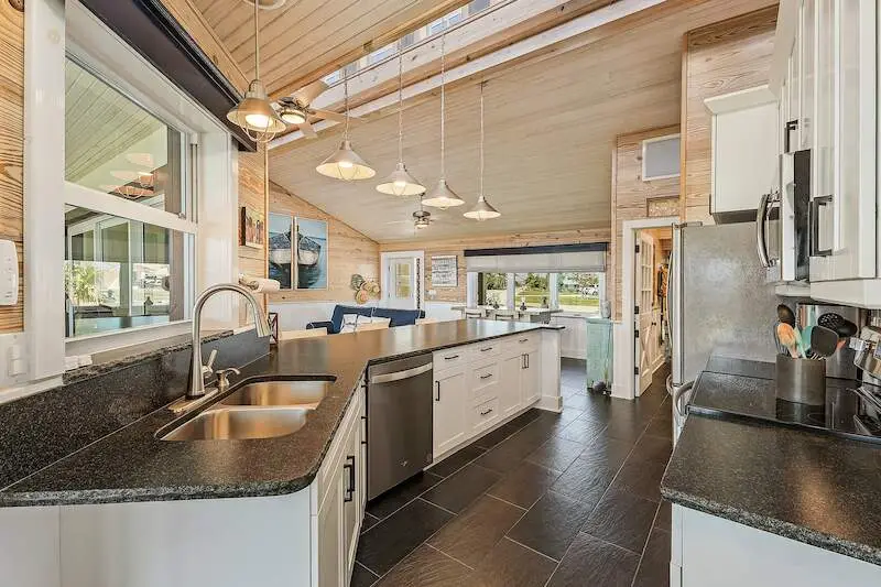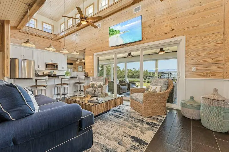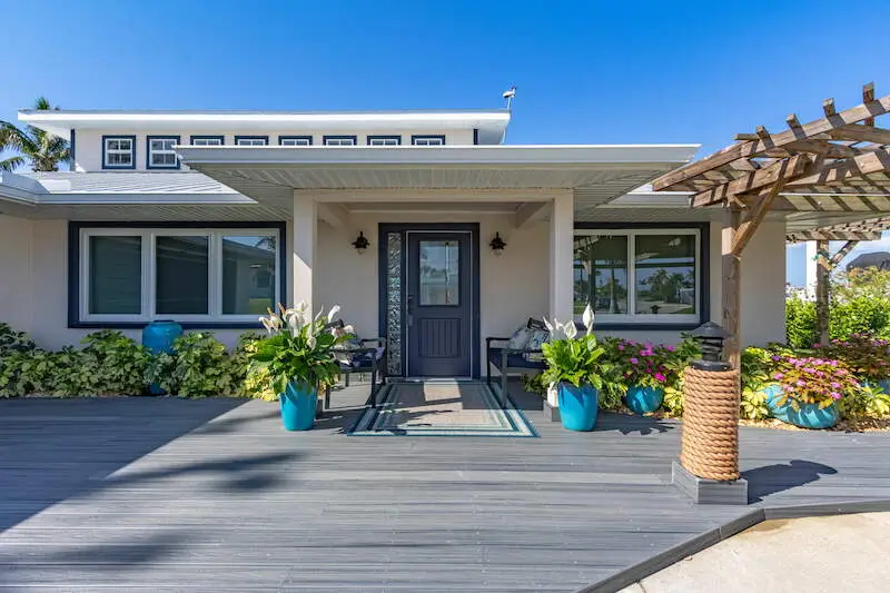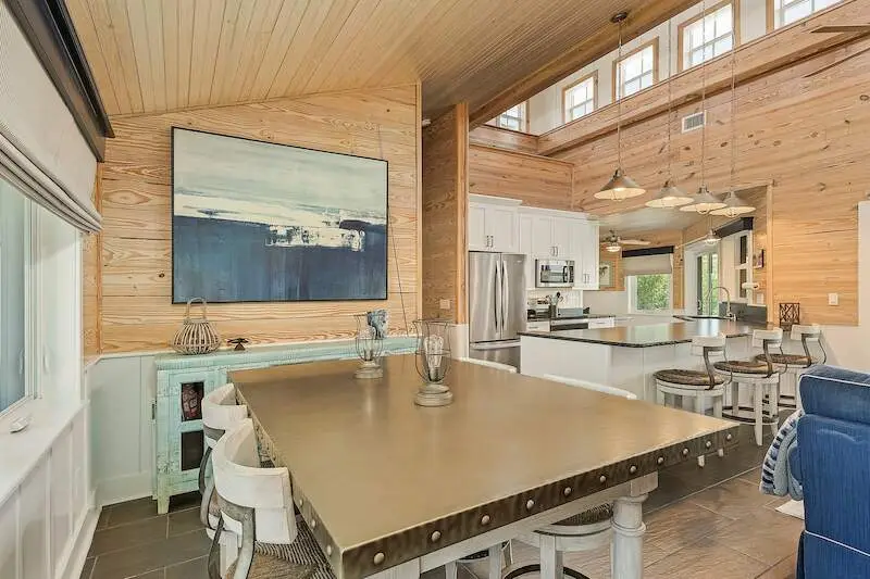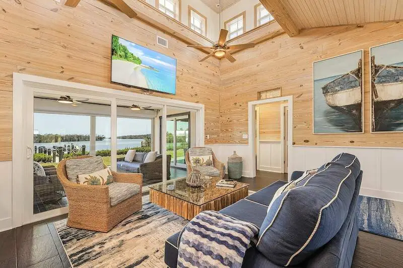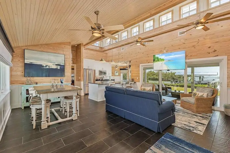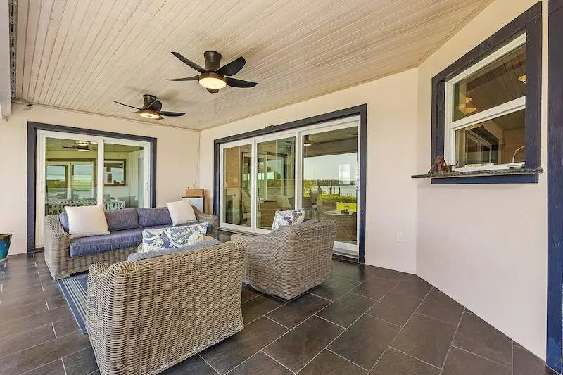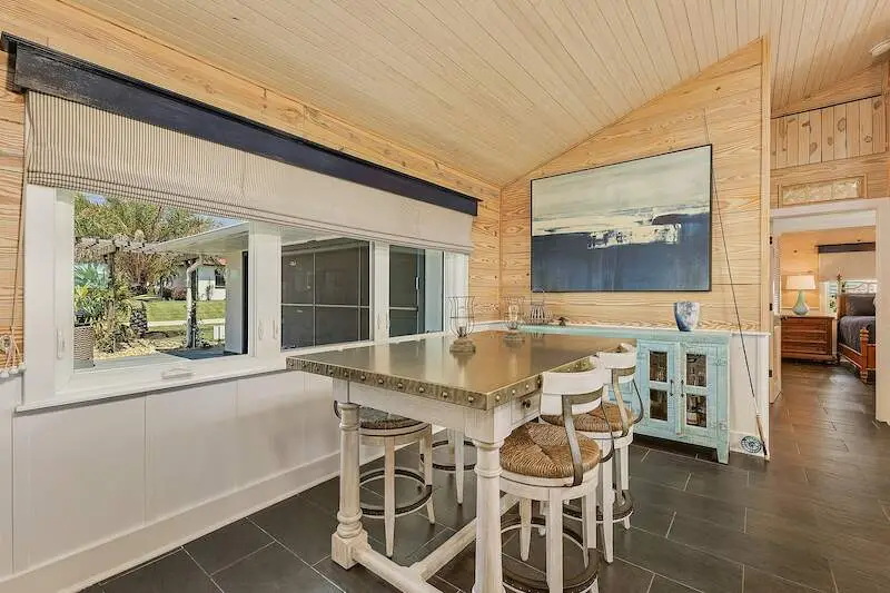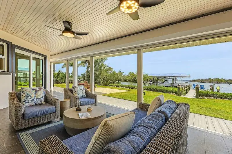 Enjoy life ON San Carlos Bay with stunning views and a uniquely designed coastal style home. Special touches abound in this completely remodeled home, creating the relaxed island lifestyle people dream of. Imagine sitting across from a submerged island, watching the birds, dolphins, and manatees on a regular basis. Outside feels like a private Caribbean resort as you walk through the mangroves toward a wrap-around deck that surrounds the entire home. Beautiful pergolas with flowering vines extend down from the metal roof. Unique design continues inside with amazing light from the vaulted ceiling clear story windows. The woodwork has whitewashed 8" yellow pine boards and wainscot ceiling. The 3bd/2ba home has new hurricane rated windows and sliding glass doors across the back so every room has lanai access and a view of the bay. Roll-down Hurricane Shutters make buttoning up a breeze without the need to drag your furniture inside. Tile floors throughout, including the finished garage which can be used as an office, fitness room or interior space. Immediate access to some of the world's best fishing and minutes away from SW Florida's most amazing islands. 10,000# Covered lift, Composite Dock, Room for a Pool and so much more. Welcome to Paradise.