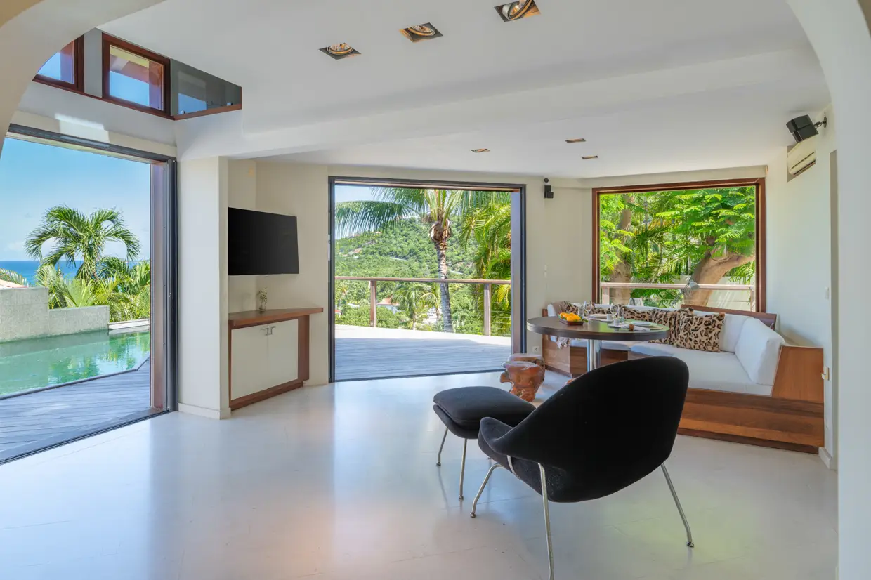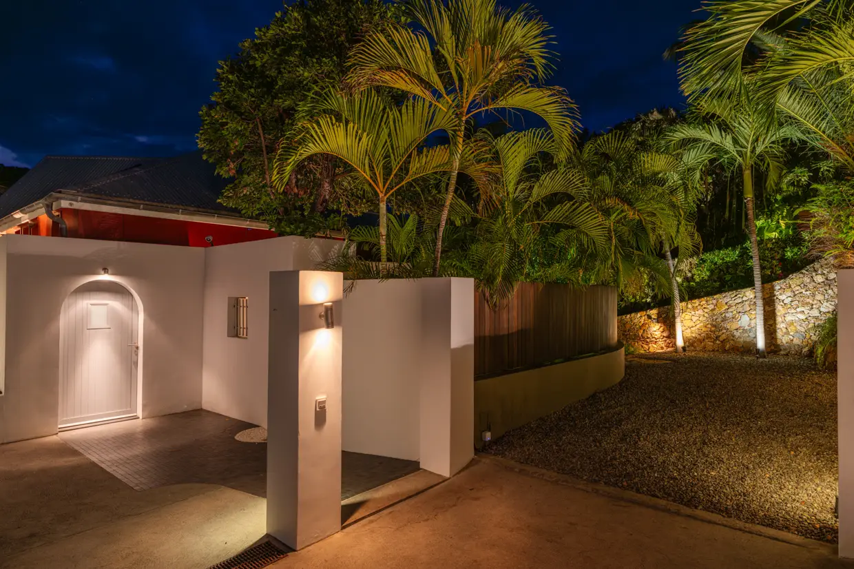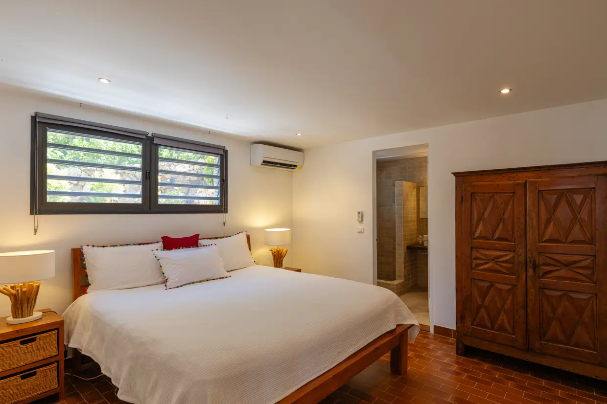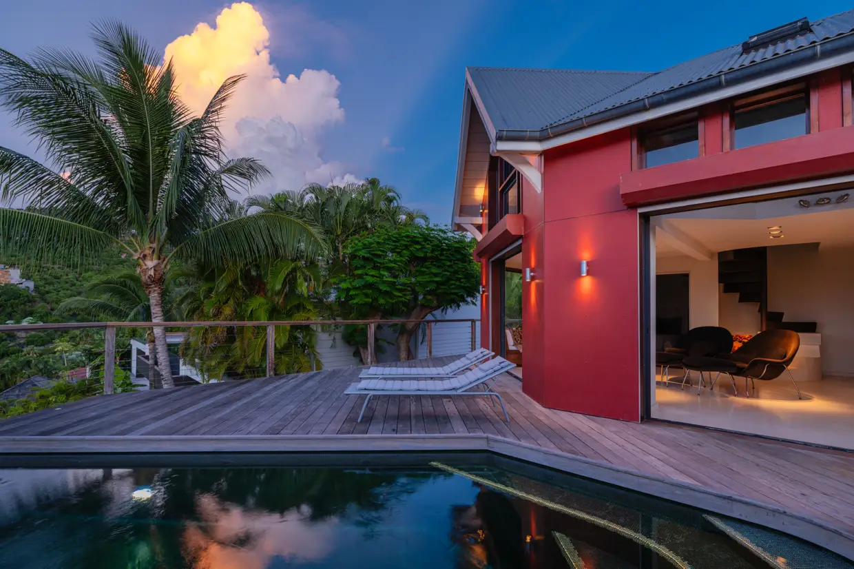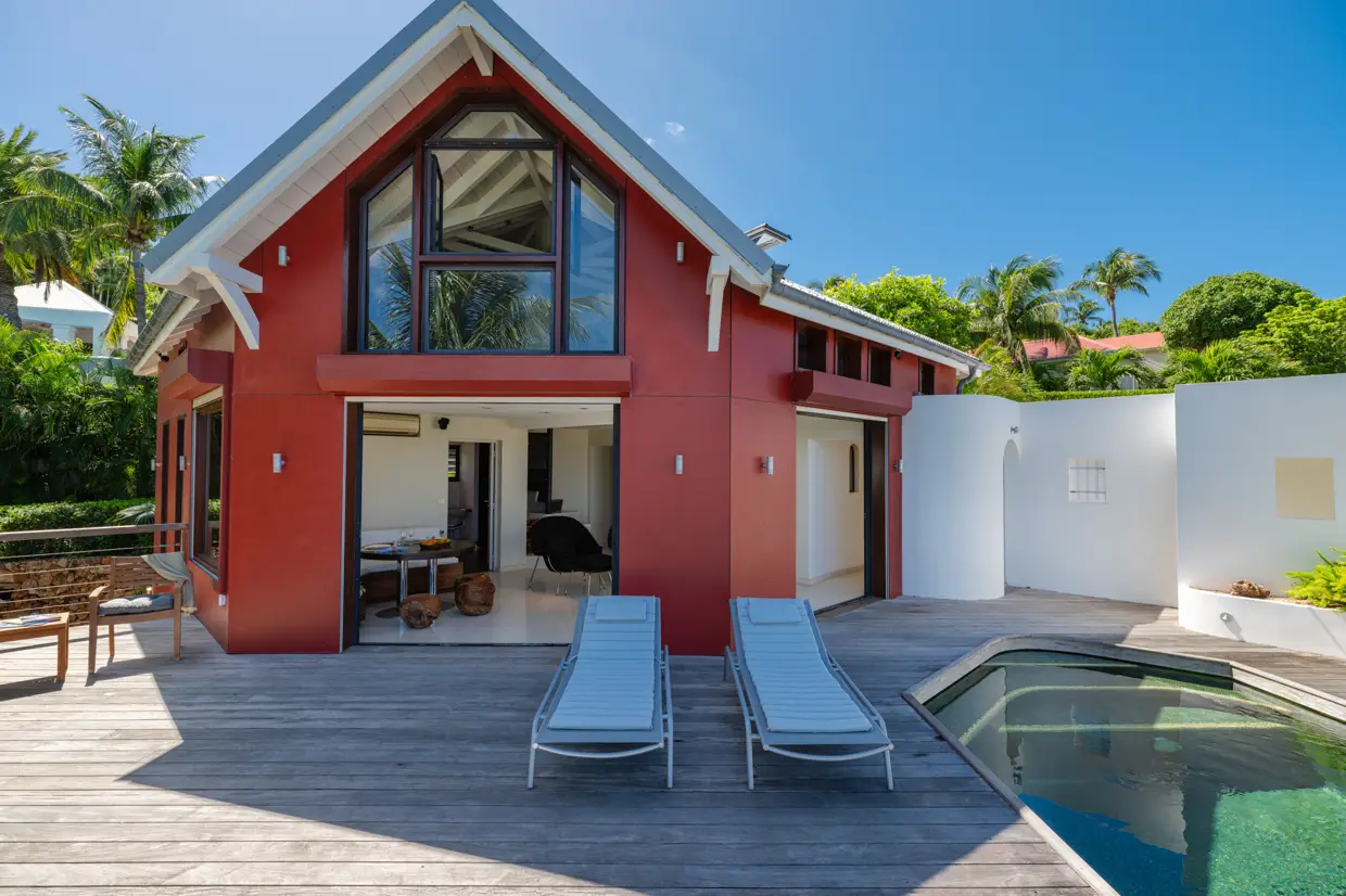 Casa Armor property enjoys a pleasant living environment, just steps away from the beach, restaurants, and amenities of Saint-Jean. It offers a stunning view of the turquoise waters of the bay and the islets that frame the scene beautifully. Spread over two levels with a functional layout, its design is highlighted by its striking red facade, adding a modern and unique touch. Currently divided into two independent apartments, the villa can be maintained as is or transformed into a four-bedroom home. The two sections are connected by a staircase while maintaining separate entrances. On the main level, the entrance leads to a bright living area, which includes a lounge and dining space as well as a fully equipped kitchen. The room opens onto a terrace, perfect for enjoying the view and relaxing by the pool. The sleeping area includes two comfortable bedrooms, each with its own private bathroom. One of the bedrooms opens onto a small garden, while the other is located on a mezzanine. On the lower level, the second apartment features its own kitchen and two equally sized bedrooms with en-suite bathrooms. A long terrace surrounded by tropical vegetation provides a peaceful setting for relaxation, while a stone-paved outdoor courtyard completes the ensemble. Casa Armor offers several possibilities for layout and renovation, allowing you to customize the space to suit your desires.