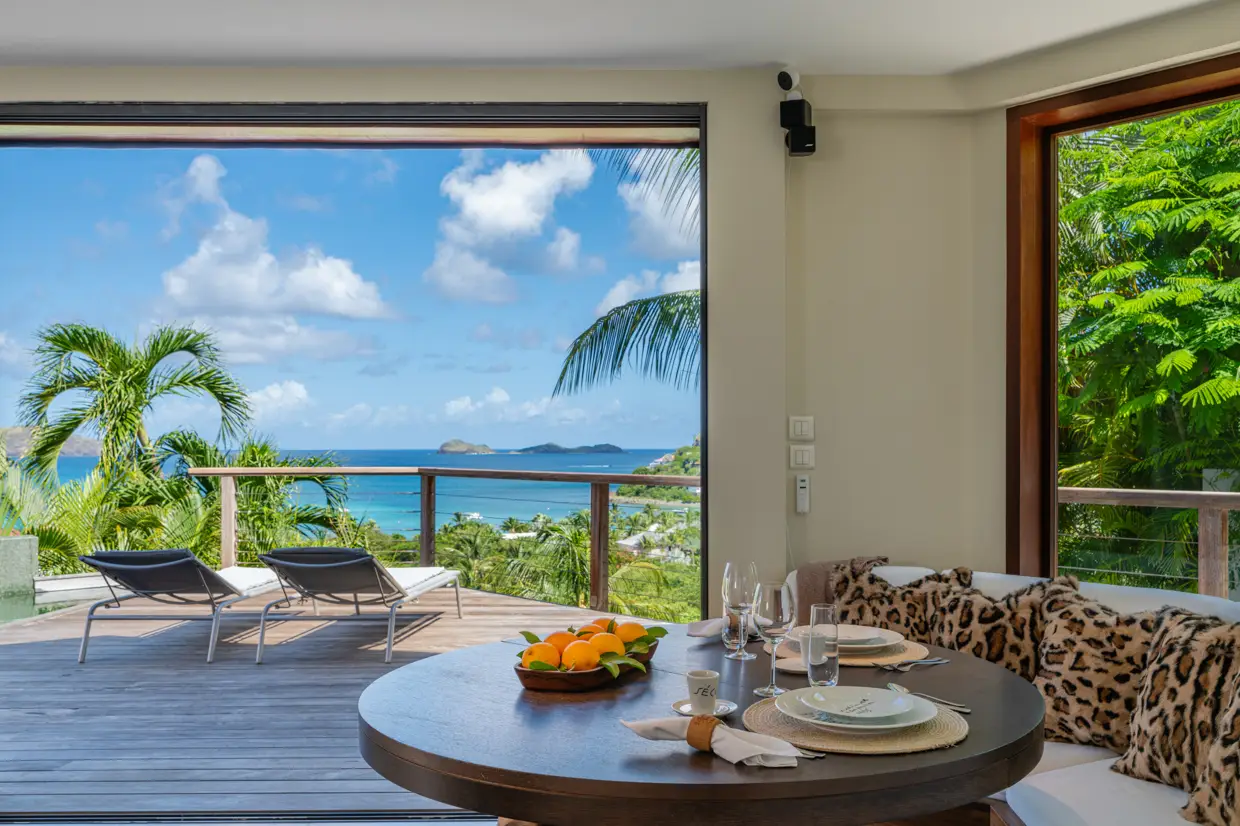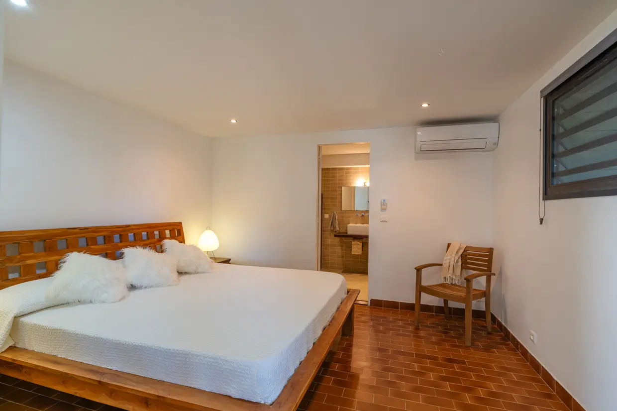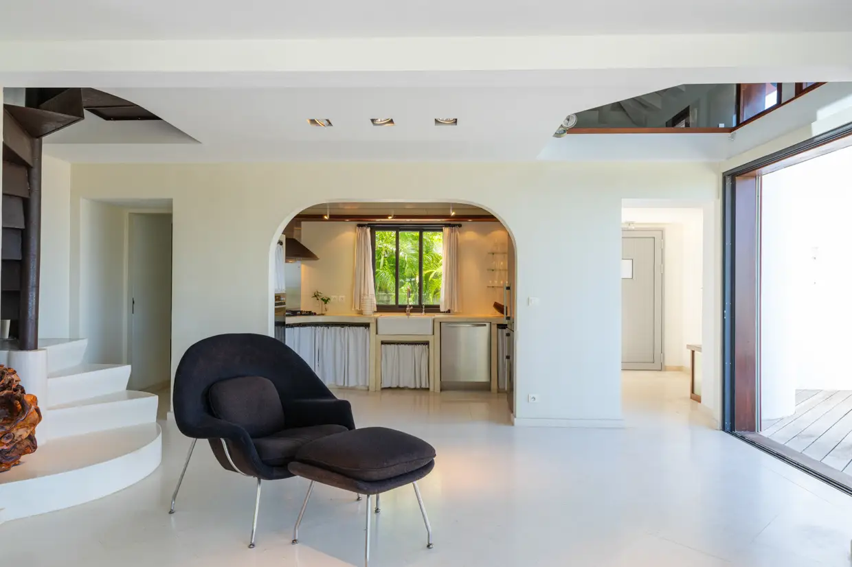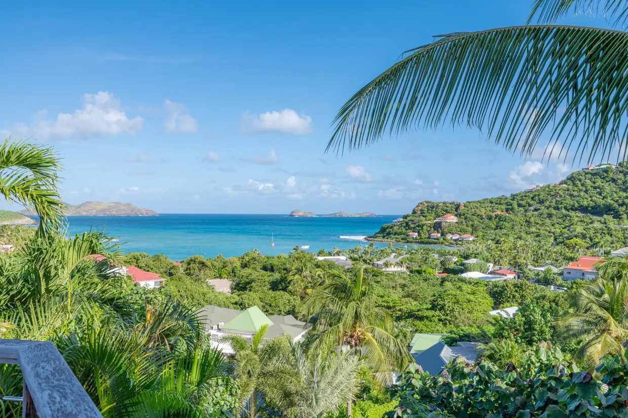 Casa Armor property enjoys a pleasant living environment, just steps away from the beach, restaurants, and amenities of Saint-Jean. It offers a stunning view of the turquoise waters of the bay and the islets that frame the scene beautifully. Spread over two levels with a functional layout, its design is highlighted by its striking red facade, adding a modern and unique touch. Currently divided into two independent apartments, the villa can be maintained as is or transformed into a four-bedroom home. The two sections are connected by a staircase while maintaining separate entrances. On the main level, the entrance leads to a bright living area, which includes a lounge and dining space as well as a fully equipped kitchen. The room opens onto a terrace, perfect for enjoying the view and relaxing by the pool. The sleeping area includes two comfortable bedrooms, each with its own private bathroom. One of the bedrooms opens onto a small garden, while the other is located on a mezzanine. On the lower level, the second apartment features its own kitchen and two equally sized bedrooms with en-suite bathrooms. A long terrace surrounded by tropical vegetation provides a peaceful setting for relaxation, while a stone-paved outdoor courtyard completes the ensemble. Casa Armor offers several possibilities for layout and renovation, allowing you to customize the space to suit your desires.
