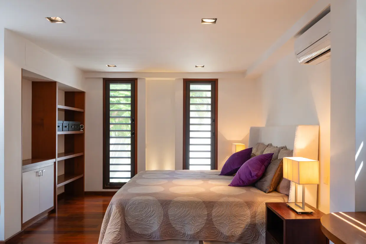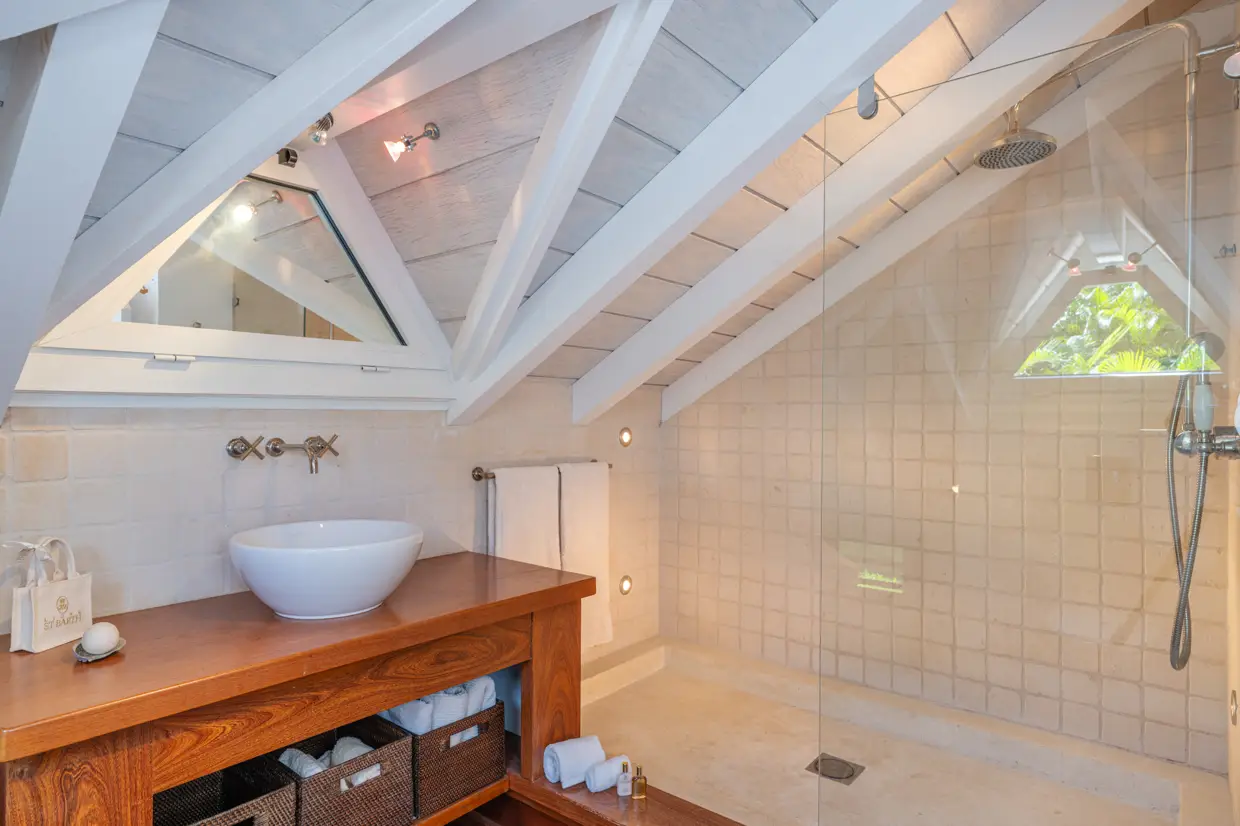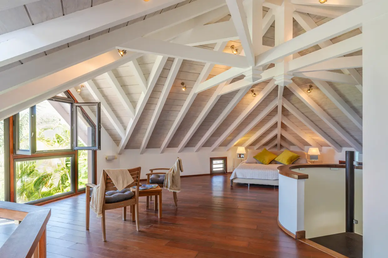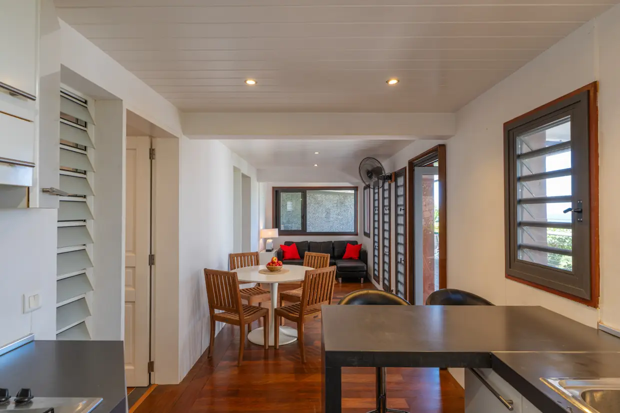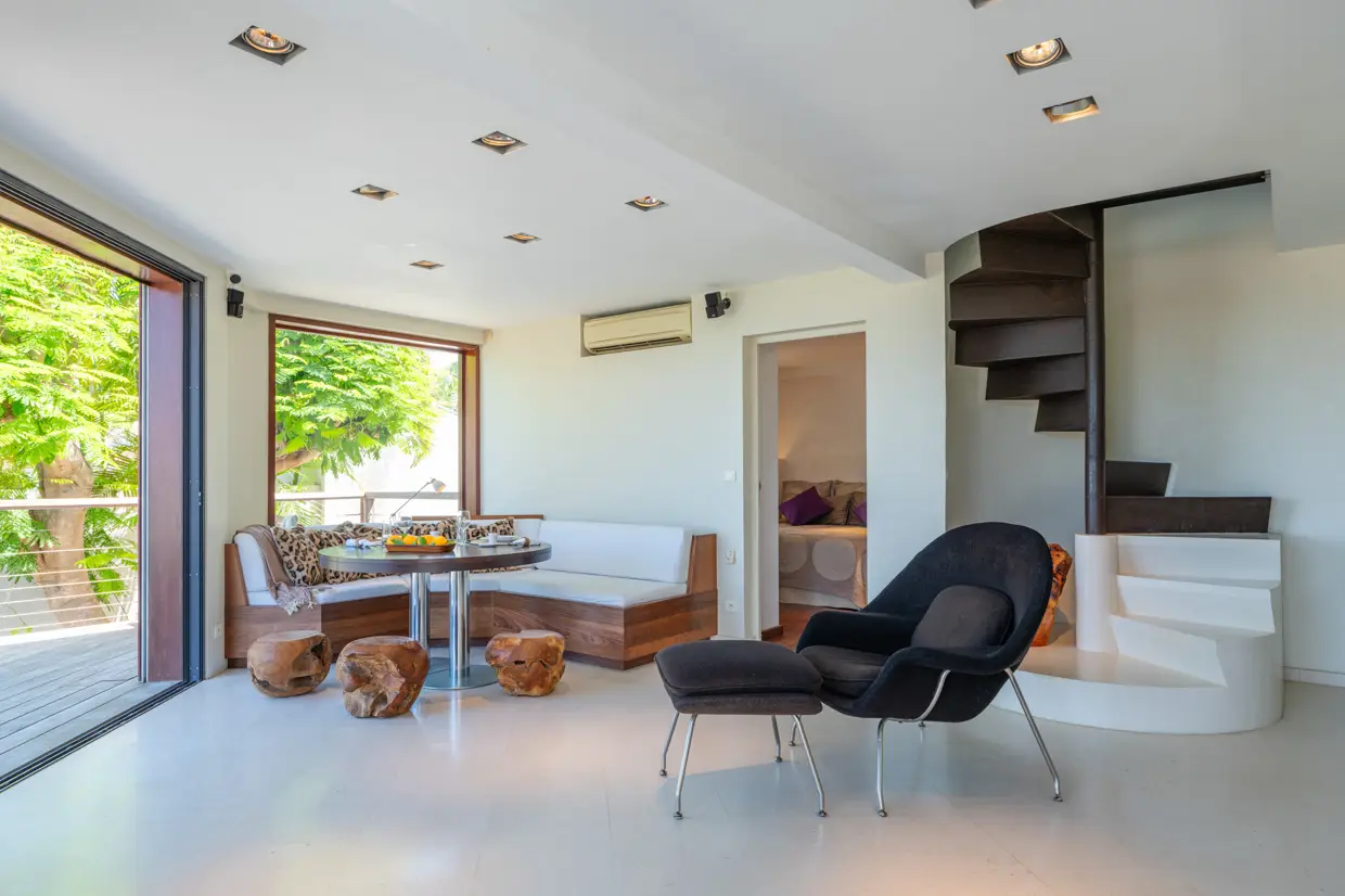 Casa Armor property enjoys a pleasant living environment, just steps away from the beach, restaurants, and amenities of Saint-Jean. It offers a stunning view of the turquoise waters of the bay and the islets that frame the scene beautifully. Spread over two levels with a functional layout, its design is highlighted by its striking red facade, adding a modern and unique touch. Currently divided into two independent apartments, the villa can be maintained as is or transformed into a four-bedroom home. The two sections are connected by a staircase while maintaining separate entrances. On the main level, the entrance leads to a bright living area, which includes a lounge and dining space as well as a fully equipped kitchen. The room opens onto a terrace, perfect for enjoying the view and relaxing by the pool. The sleeping area includes two comfortable bedrooms, each with its own private bathroom. One of the bedrooms opens onto a small garden, while the other is located on a mezzanine. On the lower level, the second apartment features its own kitchen and two equally sized bedrooms with en-suite bathrooms. A long terrace surrounded by tropical vegetation provides a peaceful setting for relaxation, while a stone-paved outdoor courtyard completes the ensemble. Casa Armor offers several possibilities for layout and renovation, allowing you to customize the space to suit your desires.