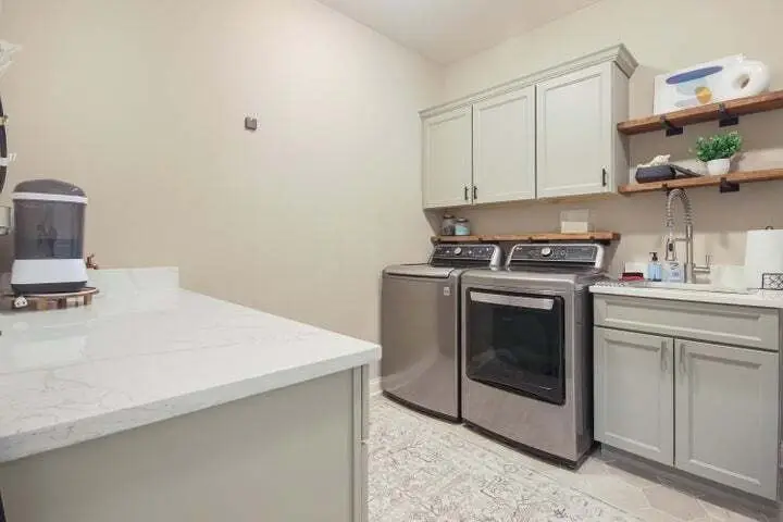 Welcome to Luxury Living in The Preserves of St. John! Discover this nearly 4,800 sq ft ranch in the desirable Preserves of St. John subdivision. Boasting an upgraded framing/thermal package, this home features 4 beds, 4 baths, and a finished three-car garage with 2 additional storage areas. The fully finished basement offers ample entertainment, living, and storage space, along with a large custom bar area! Enjoy white oak floors throughout the main level, a 14 ft vaulted ceiling, quartz counters/island, and stainless appliances. The dining area leads to your extended covered back porch, perfect for outdoor relaxation. House is upgraded with a whole house generator, tankless water heater, and the list of upgraded features goes on. Don't miss out on this better-than-new, custom ranch!