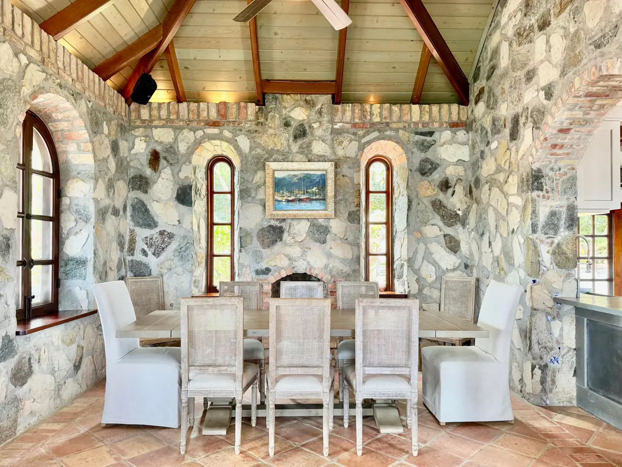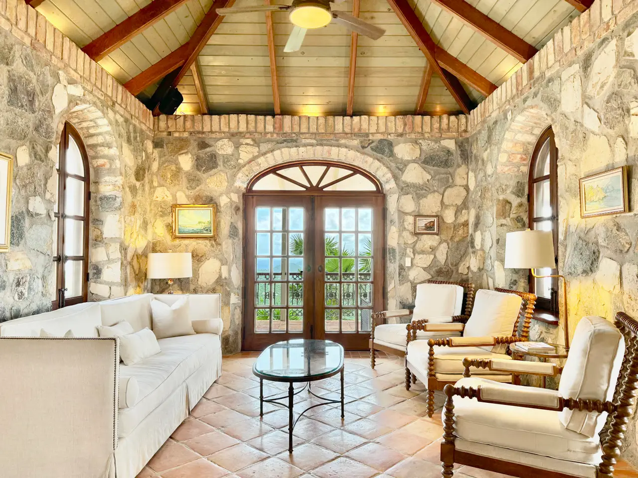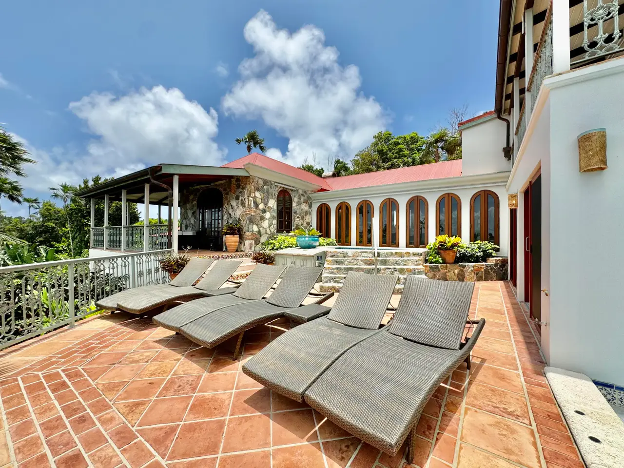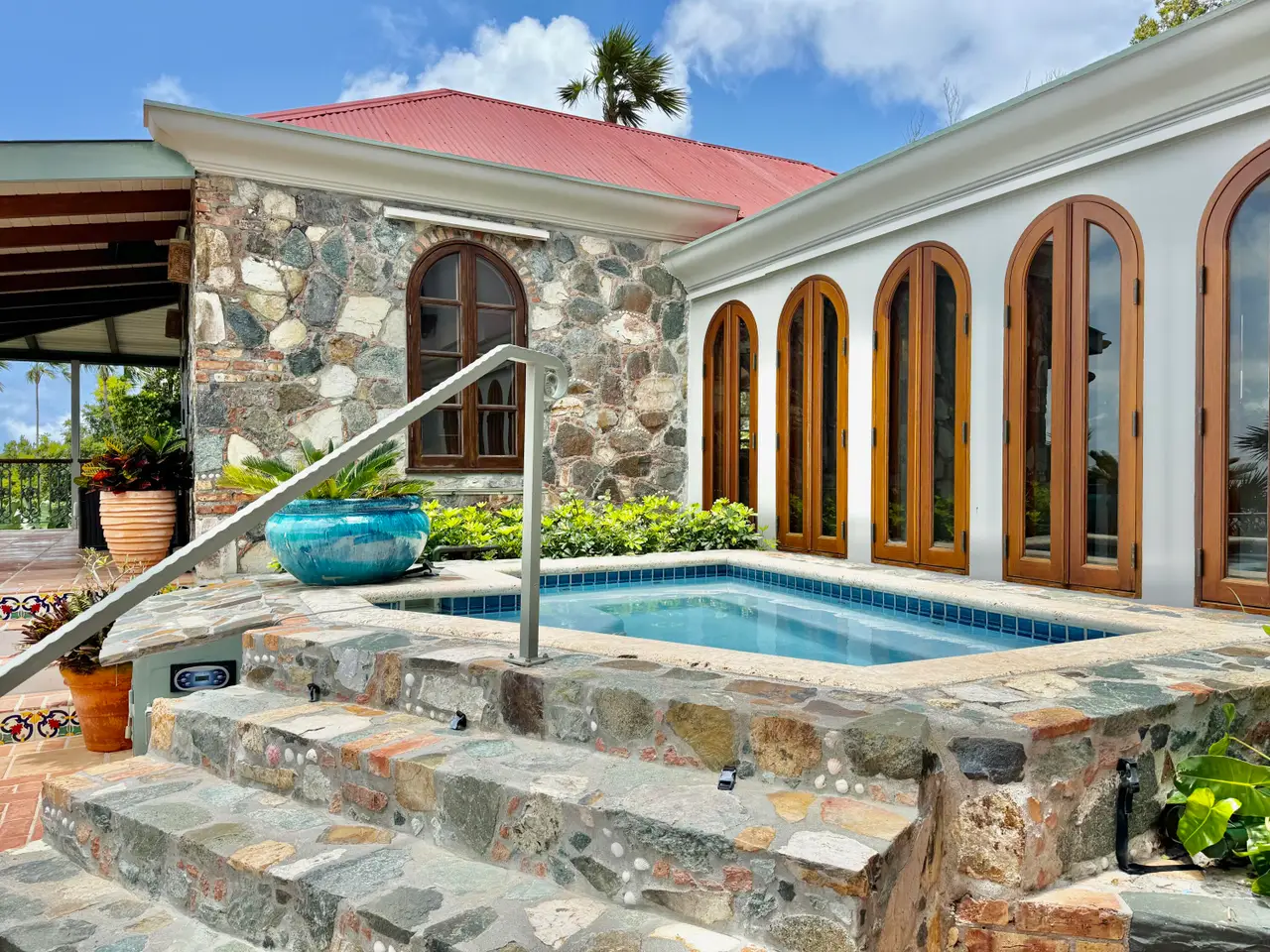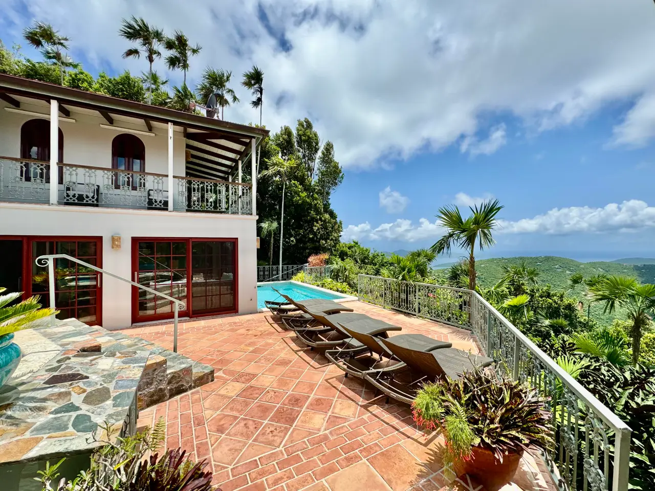 Prepare to be 'wow'ed by this magnificent Bordeaux Mountain villa. This expansive property encompasses a solid masonry home offering three bedrooms and three en suite bathrooms, and a three bedroom, two bathroom cottage. Perfect for large families, this home boasts a fully remodeled kitchen with top of the line stainless steel appliances, a jacuzzi, swimming pool, and a pool entertainment room. The stone work throughout the home is a work of art. The property's serene location offers beautiful views of Coral Bay and down island, while facing east to capture the cooling trade winds. This gated compound features two separate structures, ample parking, and is only seven minutes from Maho Bay, the North Shore Beaches, and the Virgin Islands National Park. Make this villa an investment property or family home!