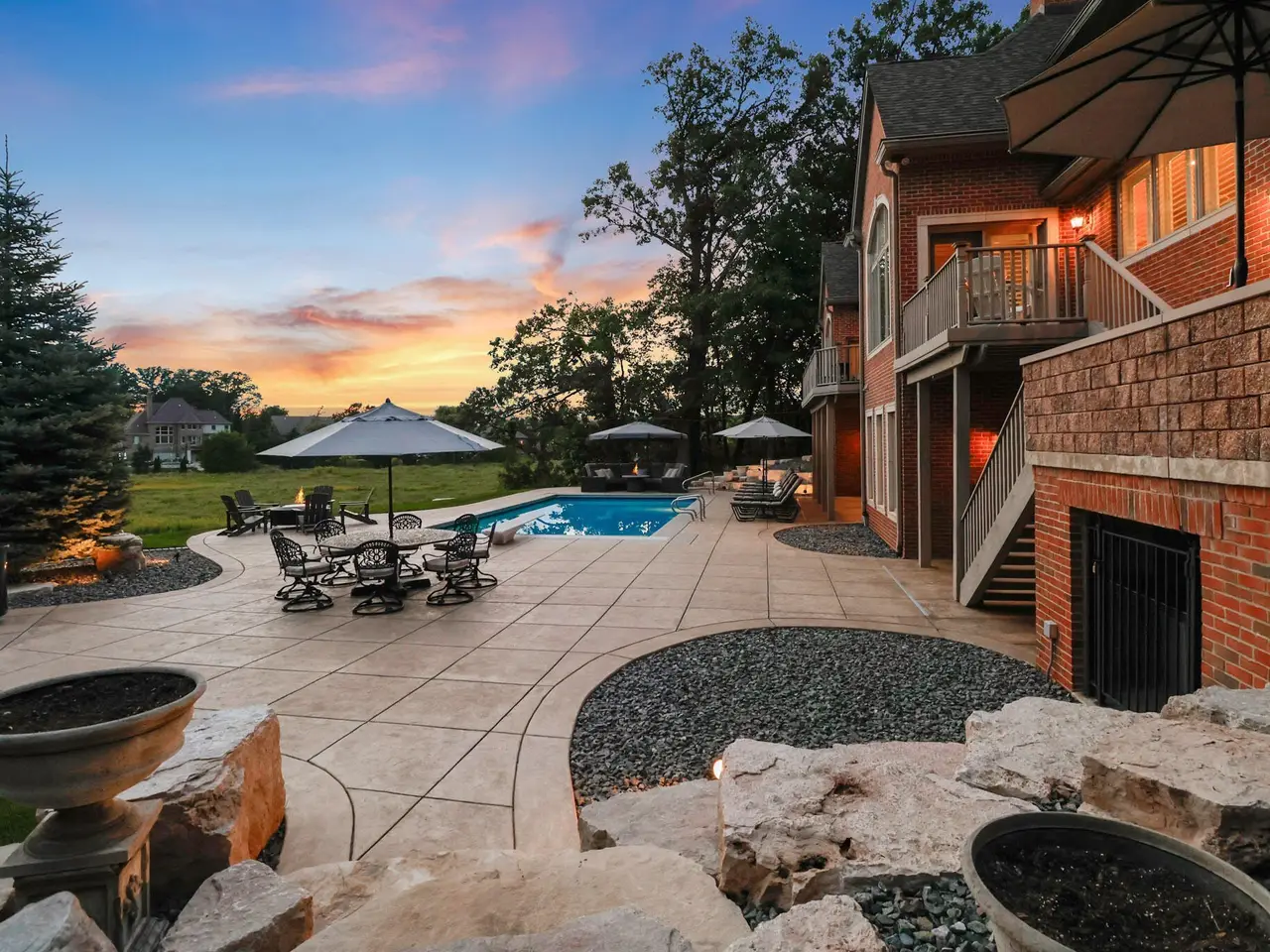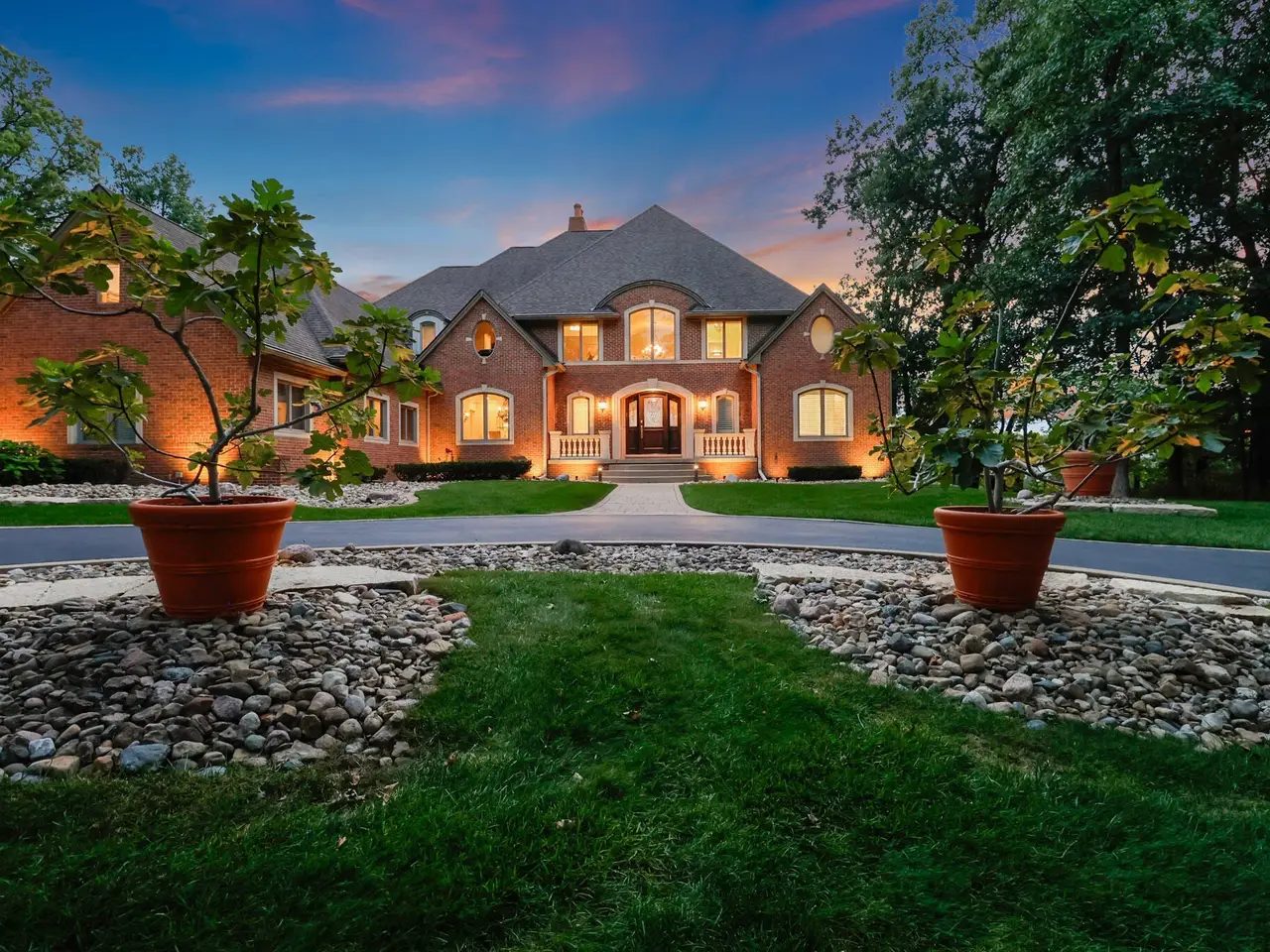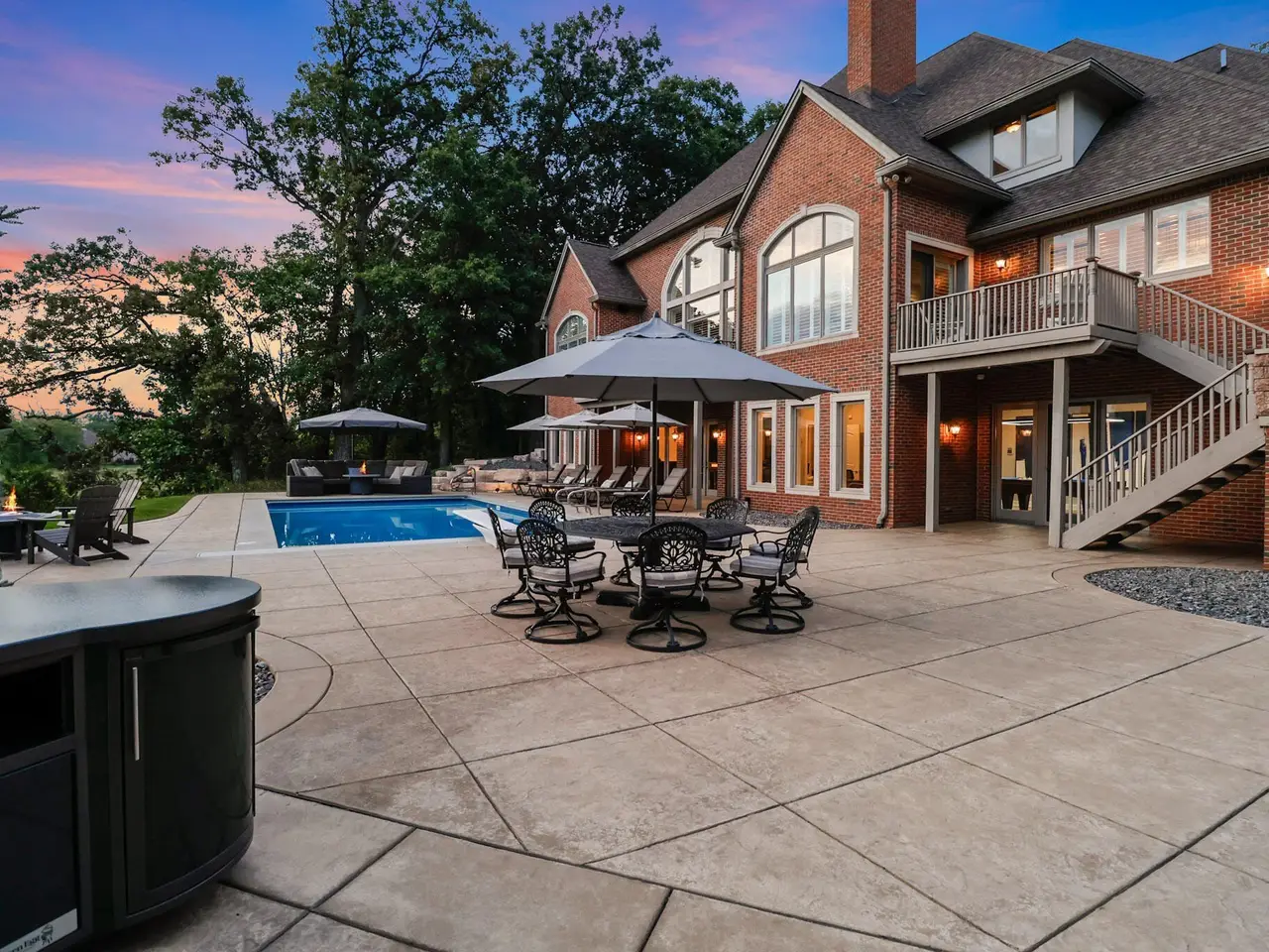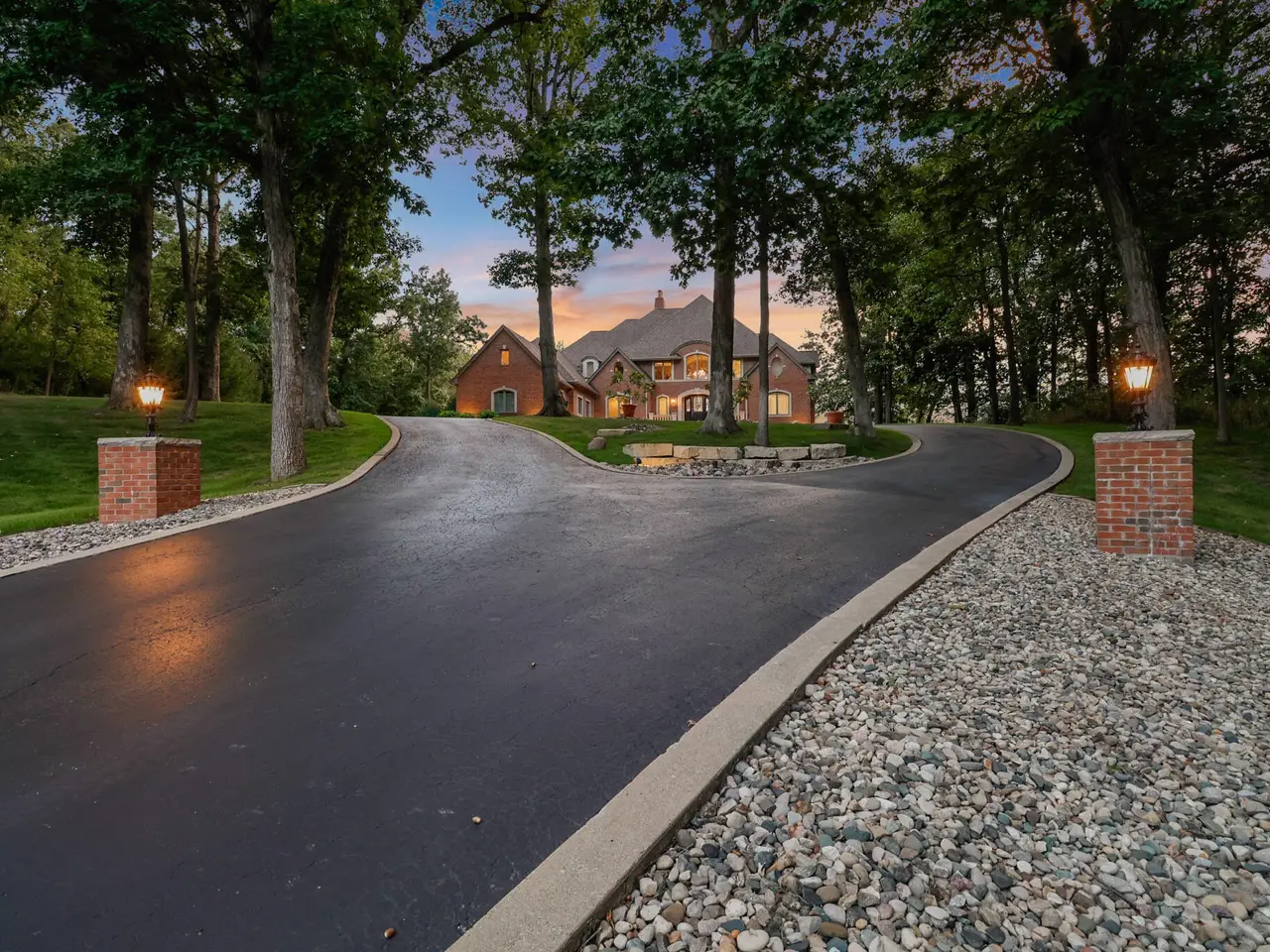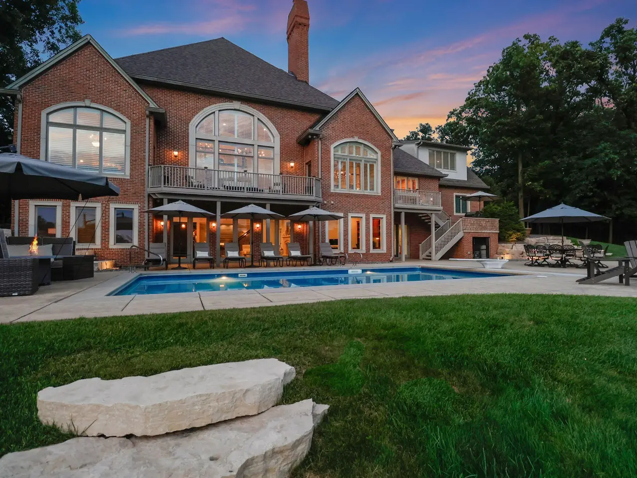 Welcome to this extraordinary estate where timeless luxury meets everyday comfort nestled on a private court in the prestigious Rosewood Estates community on 2.6 park-like acres. A gated circular drive leads you to an awe-inspiring entry setting the tone for the timeless elegance that follows. This custom-designed home boasts 6 spacious bedrooms and 7 bathrooms, each crafted for privacy and relaxation. The main living area is nothing short of breathtaking, with soaring vaulted ceilings, rich Restoration Hardware light fixtures, and the first of two stunning fireplaces that create a warm, welcoming ambiance. The show-stopping dining room flows effortlessly through a butler's pantry into the chef's kitchen, with an enormous center island, custom cabinetry, quartzite counters, walk-in pantry, while the wide-plank hickory wood flooring commands attention, the breakfast room allows access to the balcony or deck with built-in Wolf grill. The massive main level laundry room includes one of the 3 washers and 3 dryers. The main level primary suite is a serene retreat with his and her closets including the 2nd washer and dryer along with a luxury bath, and its own sitting room offering peaceful views of the grounds with balcony access perfect for morning coffee or quiet moments. Upstairs, a 2nd primary suite, 3 enormous bedrooms and a massive bonus room providing flexible space for a home office, playroom, studio, or guest suite. The finished walkout basement is an entertainer's dream, featuring a full wet bar, with a gorgeous backlit gathering island, dishwasher, beverage refrigerators, billiards room, workout room with 3rd laundry facility, a light filled office & even a 3rd primary suite. Step outside to enjoy a tranquil in-ground pool, pool house, sand volleyball court overlooking the 11 acre community preserve. Parking is a breeze in the spectacular heated 5.5 car garage. Top-rated schools, shopping, dining, & minutes from the Illinois border allowing an easy commute.