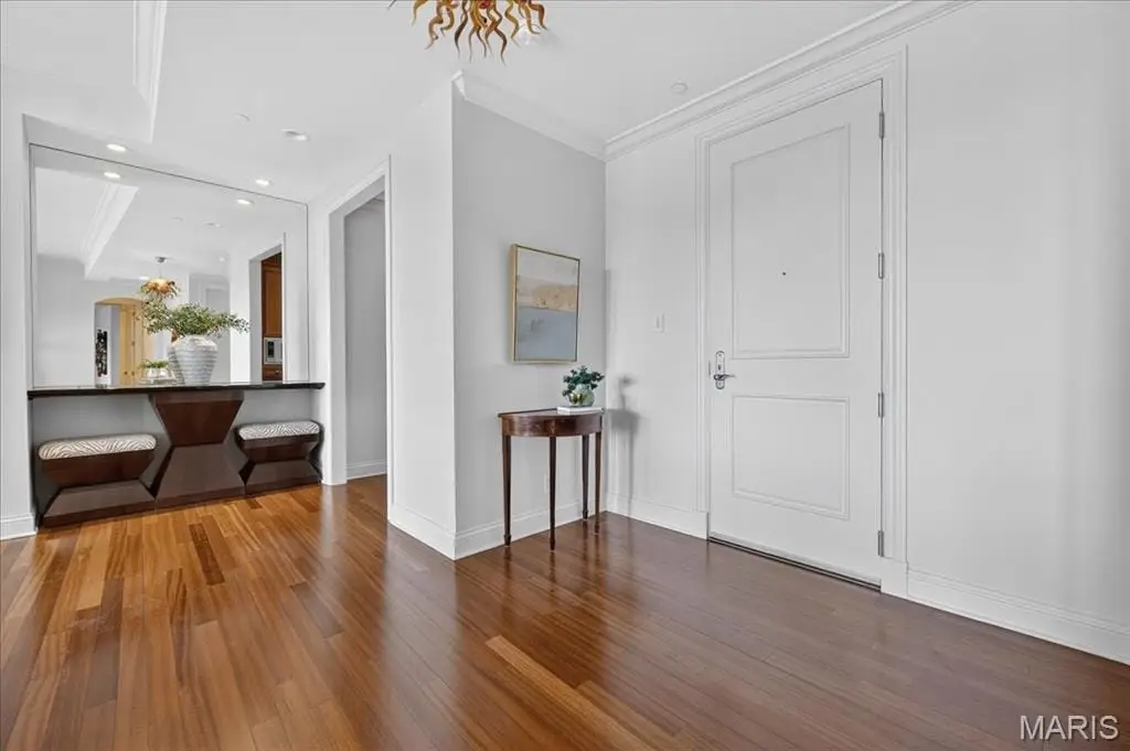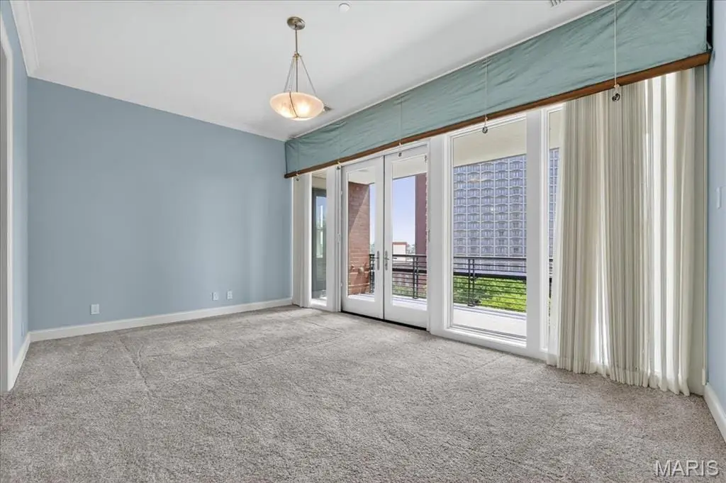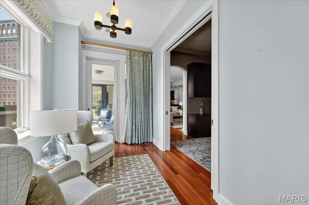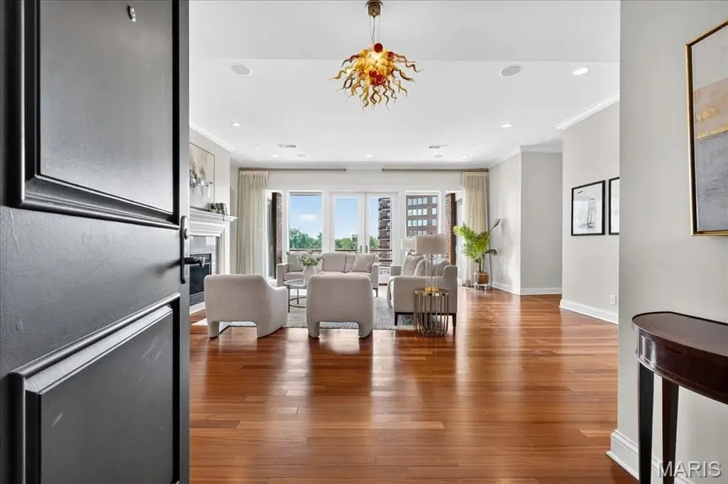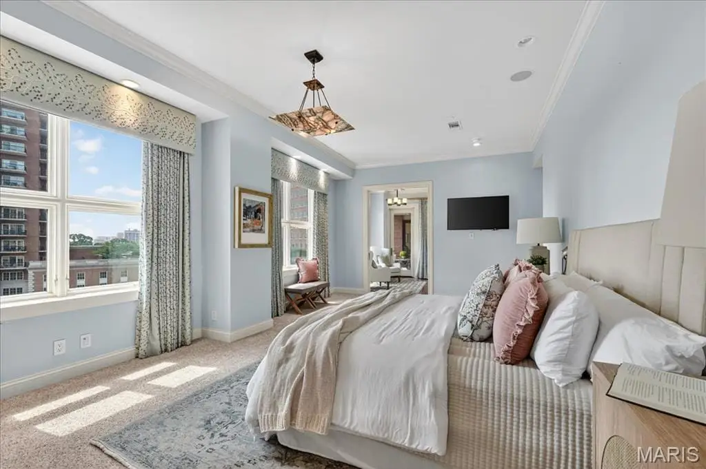 A rare opportunity to own a stunning 4-bed condo in the exclusive The Crescent, located in the heart of downtown Clayton. This 6th-fl residence offers sweeping views of Clayton and the St Louis skyline from 2 inset balconies. An expansive open floor plan with 9-10 foot ceilings, floor-to-ceiling windows, and high-end finishes throughout. Rich wood floors, custom built-ins, and gas fireplace create an inviting ambiance. The gourmet eat-in kitchen with Wolf and SubZero appliances flows into the spacious dining and family rooms, perfect for entertaining. The luxurious primary suite features 2 custom closets, remote operated shades, and a spa-like bath. 3 additional beds with ensuite baths provide ultimate comfort and privacy. Addtl. highlights include an office, sitting rm, 2 laundry rms, and 4 parking spaces. Enjoy world-class amenities such as a fitness center, concierge, dog park, secure heated garage, 24-hour doorman, valet, onsite manager, moments from fine dining and shopping. Location: Interior Unit
