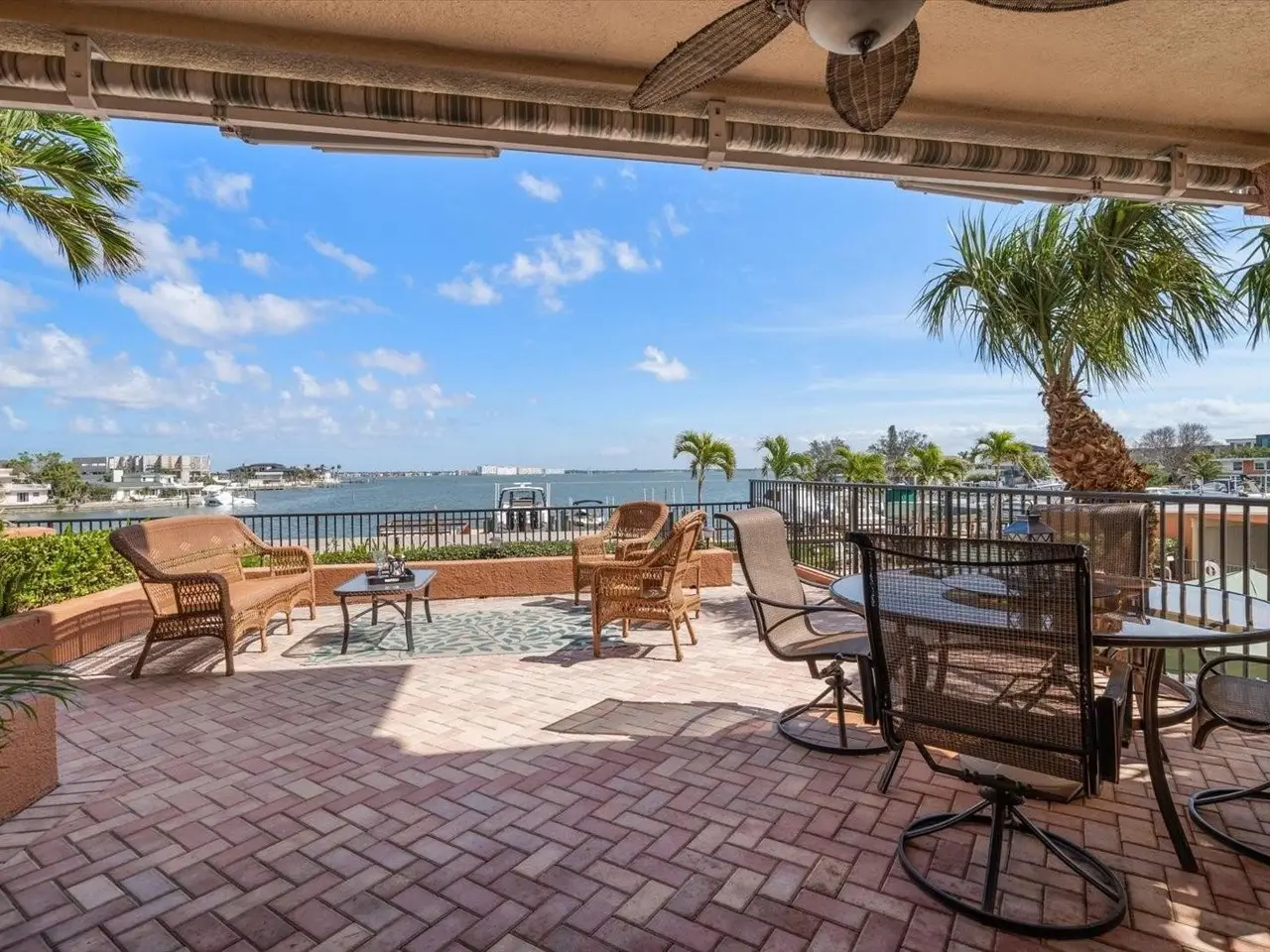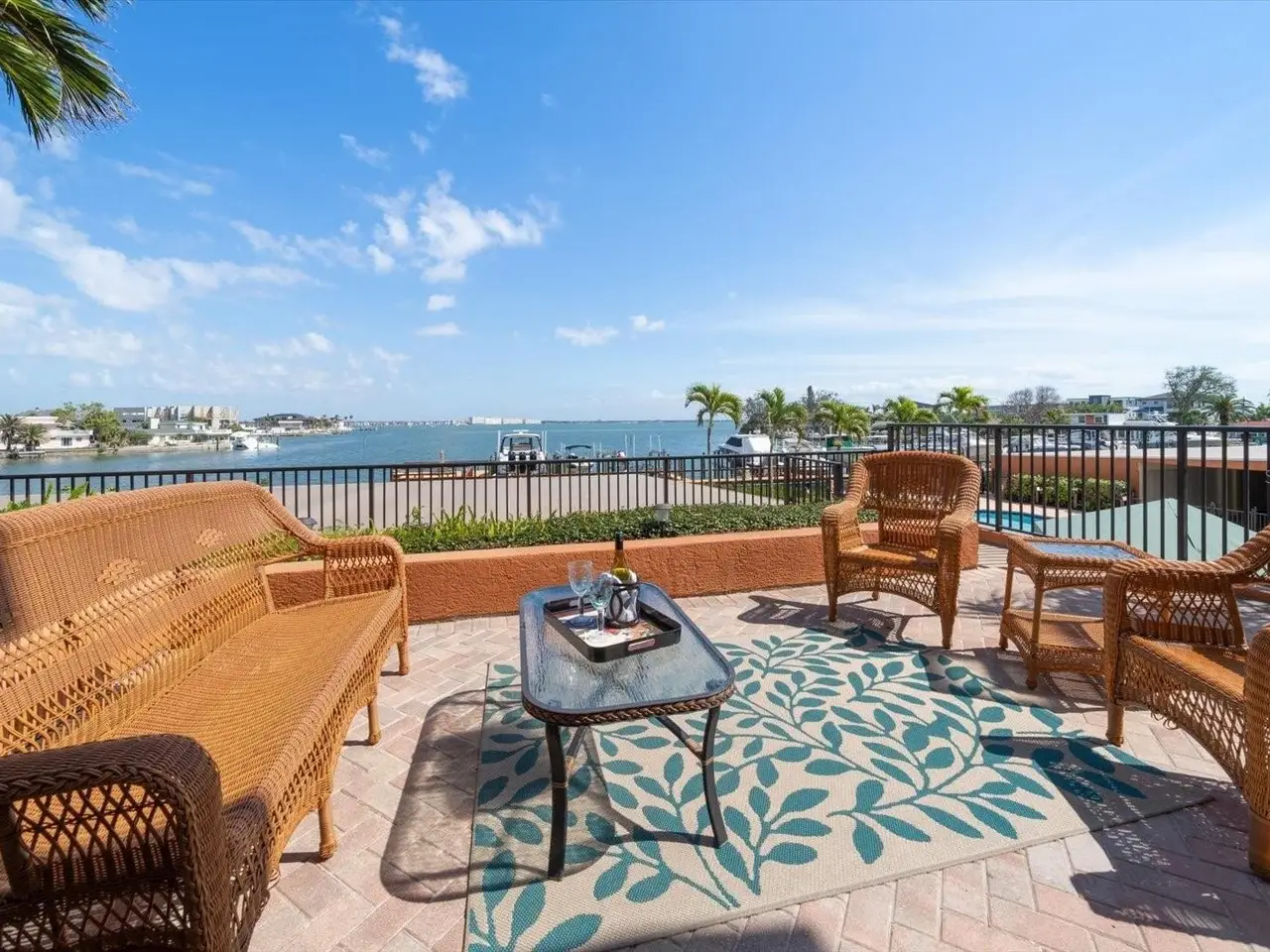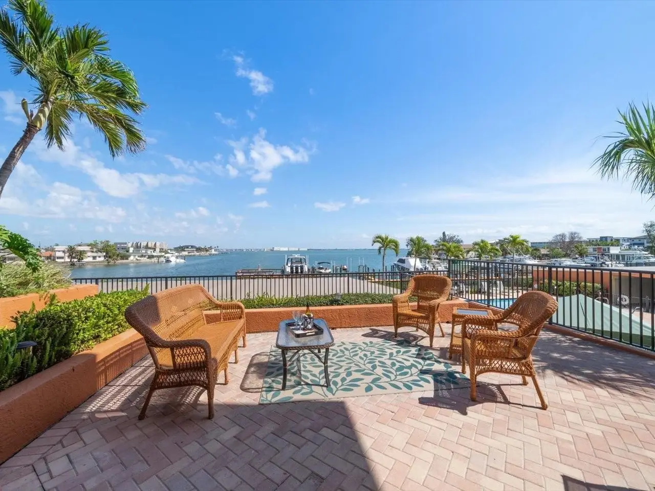 RARE OPPORTUNITY: 3 Bedrooms, 2.5 Bathrooms, 2-Car Garage CORNER UNIT with Breathtaking Water Views and a DEEDED BOAT SLIP in the exclusive, gated community of Boca Sands, St. Pete Beach. This stunning residence offers unobstructed views of Boca Ciega Bay and features a spacious, coveted GARDEN PATIO just steps from the pool—ideal for outdoor entertaining. Enter the unit through a private foyer with elevator access, leading directly into a bright, open layout. The well-appointed kitchen includes wood cabinetry, granite countertops, and a large breakfast bar. Adjacent to the kitchen is a versatile dining area or flex room, with tray ceilings, crown molding, and a granite bar perfect for entertaining. The generous great room is bathed in sunlight from the south-facing windows, with sliding doors that lead to the east-facing garden patio. Double doors from the great room lead to the elegant primary suite, featuring a California walk-in closet, a sitting area with beautiful bay views, including sunrise, and private access to the patio. The en-suite bath features dual sinks, granite counters, a soaking tub, an enclosed shower, and a separate water closet. The second bedroom also boasts an en-suite bathroom, with sliding glass doors leading to a west-facing balcony—perfect for sunset views. A third bedroom offers flexible living space, ideal for an office, exercise room, or even a fourth bedroom. Additional features include an interior laundry room with shelving and utility sink, a half bath, and a large walk-in pantry. The home also offers travertine tile and engineered wood flooring throughout. The private two-car side-by-side garage is conveniently located near the building entrance and the Community Pool & Spa area. Residents enjoy a heated pool in the winter and a cooled pool in the summer, a hot tub/spa, an outdoor shower, restrooms and private cabanas by the poolside, for the ultimate relaxation experience. The community also features a Dock for fishing, a cleaning station and a location for storage of Kayaks. Ideally situated with easy access to St. Pete Beach just across the street, downtown St. Petersburg (15 minutes away), and Tampa International Airport (35 minutes), this rare gem in Boca Sands offers a low-maintenance luxury lifestyle in a prime location. Don’t miss the opportunity to experience this exceptional home!