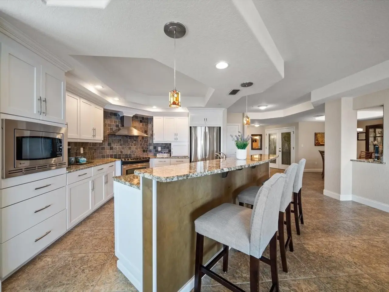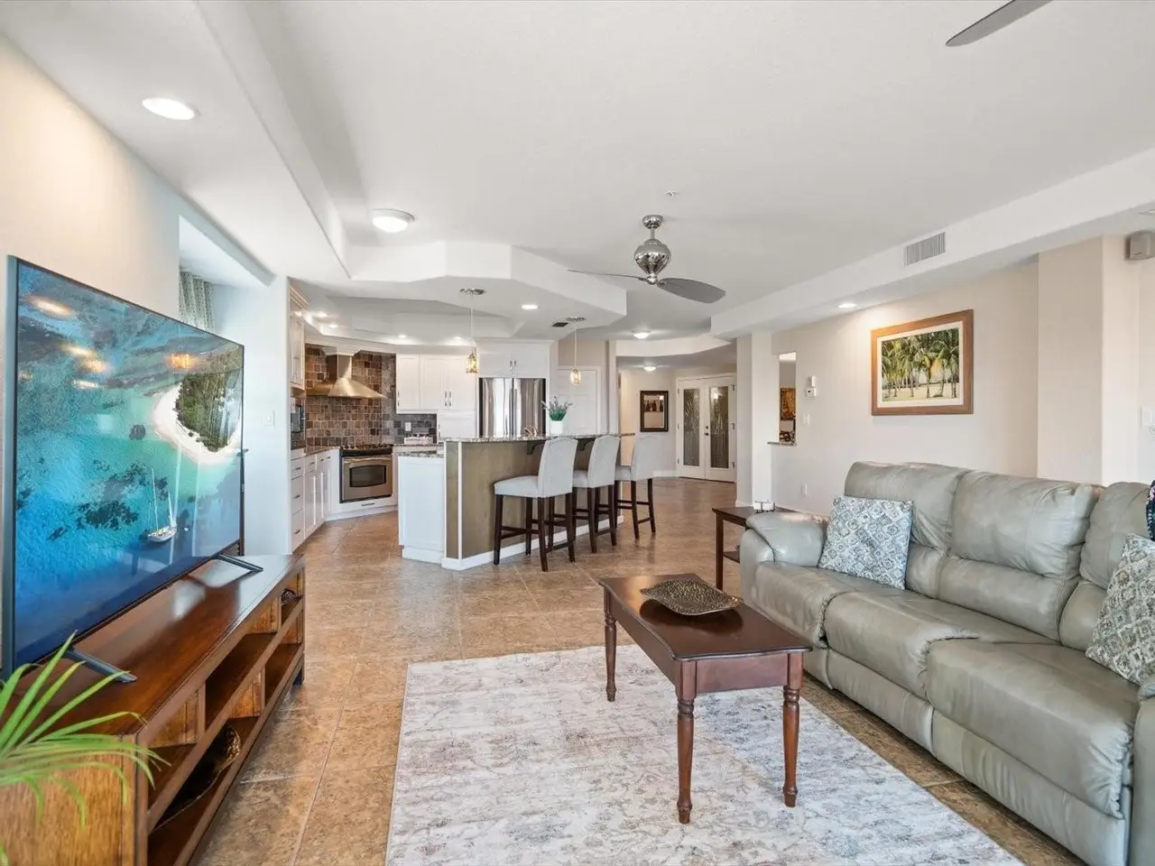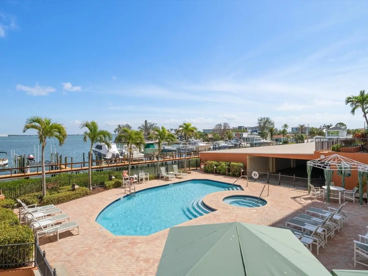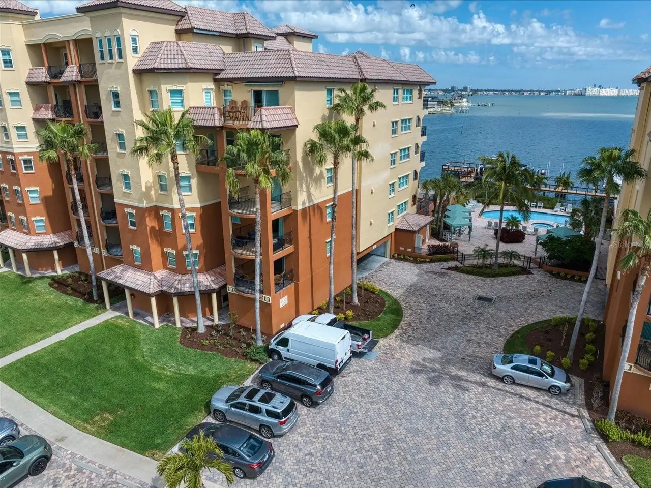 RARE OPPORTUNITY: 3 Bedrooms, 2.5 Bathrooms, 2-Car Garage CORNER UNIT with Breathtaking Water Views and a DEEDED BOAT SLIP in the exclusive, gated community of Boca Sands, St. Pete Beach. This stunning residence offers unobstructed views of Boca Ciega Bay and features a spacious, coveted GARDEN PATIO just steps from the pool—ideal for outdoor entertaining. Enter the unit through a private foyer with elevator access, leading directly into a bright, open layout. The well-appointed kitchen includes wood cabinetry, granite countertops, and a large breakfast bar. Adjacent to the kitchen is a versatile dining area or flex room, with tray ceilings, crown molding, and a granite bar perfect for entertaining. The generous great room is bathed in sunlight from the south-facing windows, with sliding doors that lead to the east-facing garden patio. Double doors from the great room lead to the elegant primary suite, featuring a California walk-in closet, a sitting area with beautiful bay views, including sunrise, and private access to the patio. The en-suite bath features dual sinks, granite counters, a soaking tub, an enclosed shower, and a separate water closet. The second bedroom also boasts an en-suite bathroom, with sliding glass doors leading to a west-facing balcony—perfect for sunset views. A third bedroom offers flexible living space, ideal for an office, exercise room, or even a fourth bedroom. Additional features include an interior laundry room with shelving and utility sink, a half bath, and a large walk-in pantry. The home also offers travertine tile and engineered wood flooring throughout. The private two-car side-by-side garage is conveniently located near the building entrance and the Community Pool & Spa area. Residents enjoy a heated pool in the winter and a cooled pool in the summer, a hot tub/spa, an outdoor shower, restrooms and private cabanas by the poolside, for the ultimate relaxation experience. The community also features a Dock for fishing, a cleaning station and a location for storage of Kayaks. Ideally situated with easy access to St. Pete Beach just across the street, downtown St. Petersburg (15 minutes away), and Tampa International Airport (35 minutes), this rare gem in Boca Sands offers a low-maintenance luxury lifestyle in a prime location. Don’t miss the opportunity to experience this exceptional home!