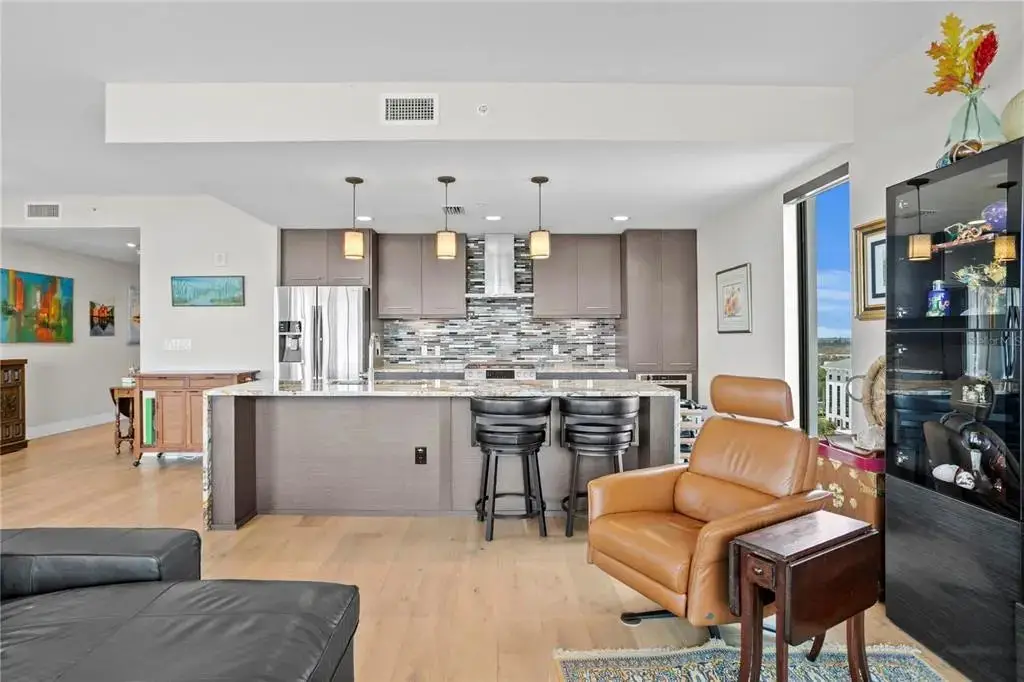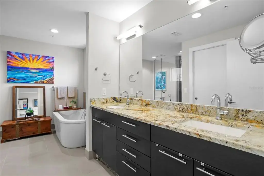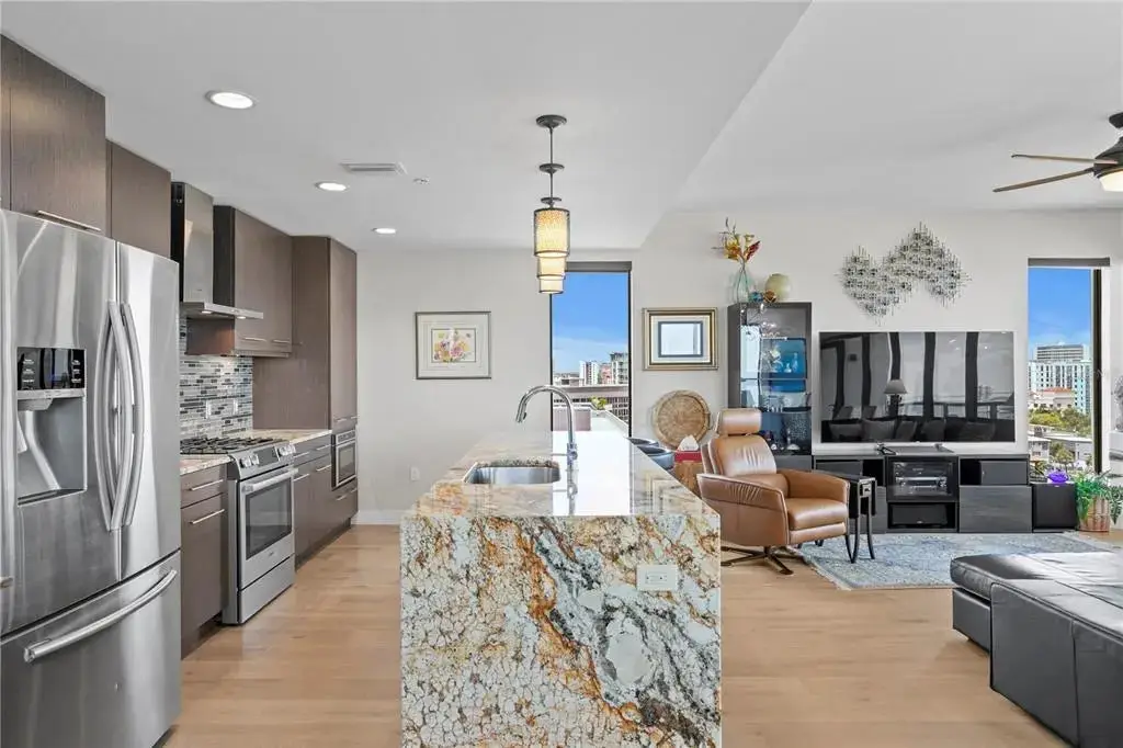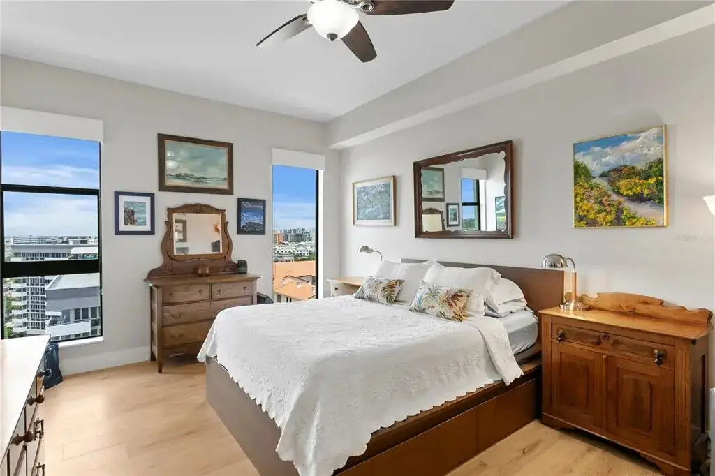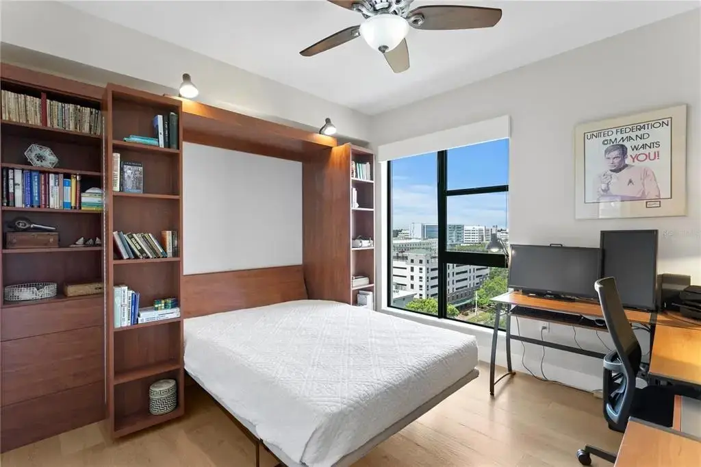 Experience breathtaking, sweeping views of downtown St. Pete, the Pier, Tampa Bay, the Dali Museum, and Albert Whitted Airport from the 12th-floor balcony of this spacious residence at The Salvador. A welcoming Gallery entry sets the tone, offering space for artwork, artistic expression and a direct line of sight to the stunning vistas beyond. This 1,555 sq. ft., 2-bedroom, 2-bath home features a unique open floor plan with windows on three sides—ensuring abundant natural light, dramatic views, and complete privacy with no adjacent units. The expansive living and dining areas are framed by floor-to-ceiling windows, with motorized blackout shades on the East and West exposures. The contemporary kitchen has been thoughtfully upgraded with custom waterfall-edge countertops, a deep single-basin sink with modern faucet, natural gas range, Samsung 28 cu. ft. French door refrigerator with food showcase panel and filtered ice/water, and a wine cooler. Design upgrades continue throughout: premium sinks and Moen faucets in both bathrooms, Cat 6 wiring from a centralized Ethernet switch, and sunshade blinds in both bedrooms, double-hung with blackout layers. The primary suite features a generous walk-in closet and a spa-inspired bath with a deep soaking tub, a large walk-in shower with a custom glass enclosure, dual Moen fixtures (rainhead and handheld), each with individual thermostatic controls, and a dual-sink vanity. The guest bedroom includes a custom queen-size Murphy Bed with swinging bookshelf doors. A laundry closet between the bedrooms includes Samsung front-loading washer and dryer with added storage. This residence includes two adjacent second-floor parking spaces and a substantial climate-controlled storage room. The Salvador, a LEED-certified building with only 74 units, offers an array of amenities including a pool and spa, a state-of-the-art fitness center, a social room, grilling area, dog park with wash station, sculpture garden, and outdoor fire pit. Concierge service and on-site management ensure effortless living in this tranquil yet centrally located oasis, just blocks from downtown attractions like the Dali Museum, Mahaffey Theater, Albert Whitted Airfield, and the vibrant Saturday Morning Market. Elevate your lifestyle with a private tour of this exceptional residence at The Salvador and discover unparalleled luxury living in the heart of St. Pete. Schedule your visit today to immerse yourself in this unparalleled blend of privacy, luxury, and location.