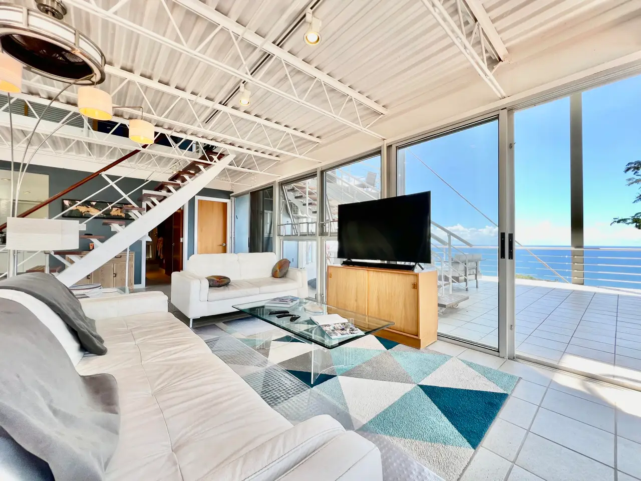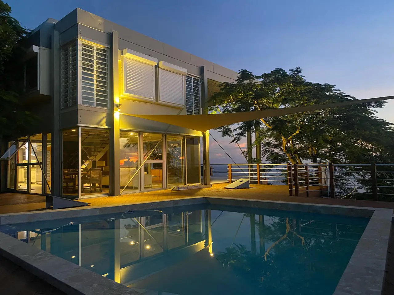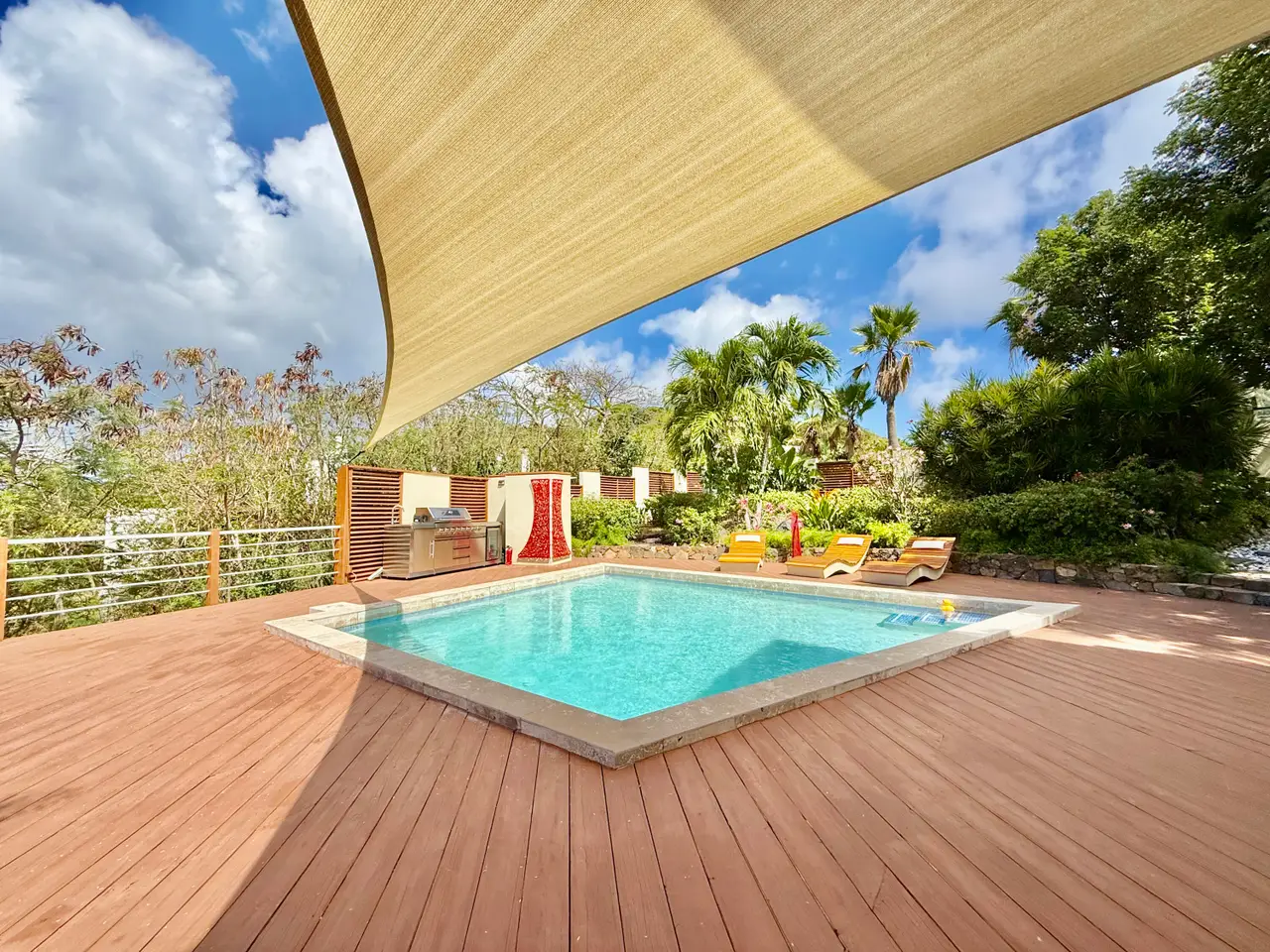 Sandbank is a beautiful contemporary architectural 5-Bedrooms 4-Baths home that sits on a 1.04 acre hilltop corner lot overlooking the Caribbean Sea with wide ocean views going from St James Island all the way to Puerto Rico. The main house is a 4 bed 3 baths (1 bedroom currently used as an office), and a 1 bed 1 bath apt. with its own driveway. Focusing on steel frame and glass, the home was designed by William Lane, architect of many landmarks in Florida, including the Miami Beach iconic Life Guard Towers. The property has an amazing covered deck with mesmerizing views and a large uncovered outdoor space with a nice size swimming pool and outdoor shower. Equipped with Solar panels, 2 Tesla batteries and a generator. Truly a one of a kind and perfect for family use or investment property