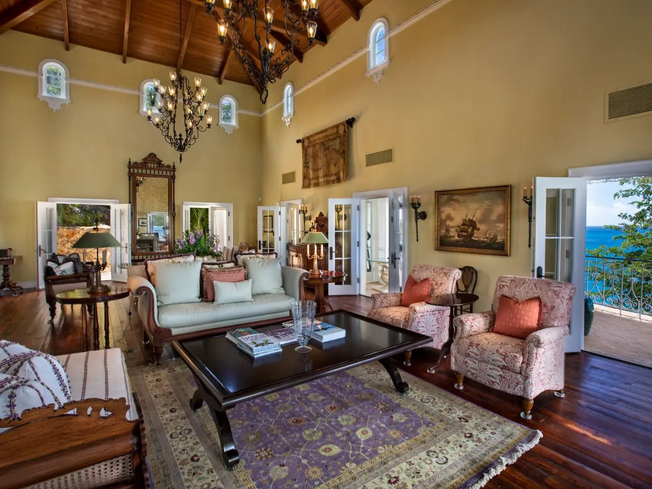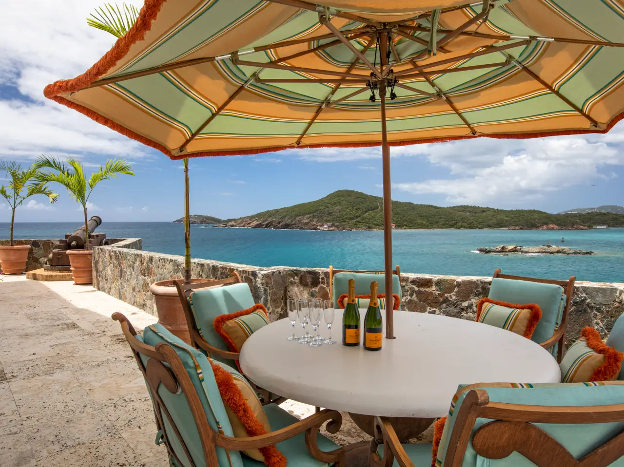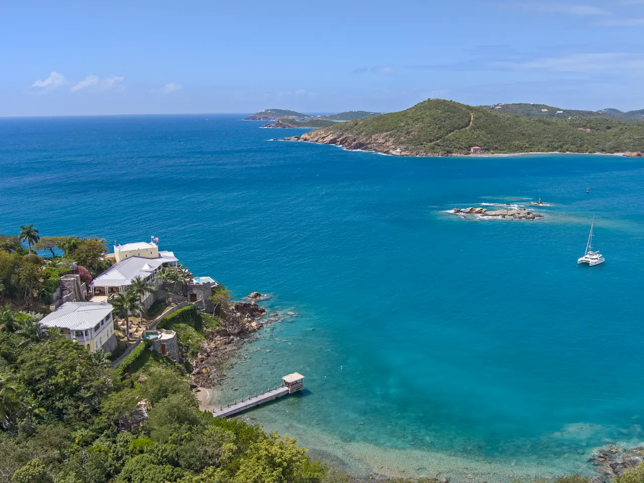 The Waterfront Estate is more than a home. It's a one-of-a-kind experience. The expansive nine-acre estate includes four homes and boasts a total of 18 bedrooms, 14 baths, two infinity pools and 25,490 square feet of luxury and privacy across 11 parcels. Tropical walkways bursting with royal palms and native plants connect all four homes. The real treasure among these are the two waterfront villas, both with direct water access. Stone staircases, as well as two trams with intermediate stops, allow you to descend all the way to the turquoise ocean below. As you enter the main villa, the tasteful and elegant furnishings will usher you to another era. Magnificent architecture, enchanting stonework, unique hardwoods, and a prized collection of antiques evokes feelings of nostalgia, grandeur, and adventure. Each room has a distinct persona and story of its own, from the 800 square foot great hall to the wine grotto, all brought together by the old-world charm of a Caribbean estate aesthetic. The fun truly begins as you step outside and explore the many terraces and verandas overlooking Charlotte Amalie harbor. Try your hand at shooting one of the two working water cannons straight into the Caribbean Sea. Relax on the lounge deck or soak in the infinity pool. Take a stroll along the gorgeous 50-foot white sand beach. Watch the sunset over Hassel Island on your own private 80-foot dock. Enjoy the Caribbean's most spectacular music and light show courtesy of the estate's terraced waterfall, which features 10 jumping jets, eight fire braziers, 17 falls, a fog machine, more than 100 LED lights and a holographic water screen. Whether you're interested in an exceptional island getaway or the ultimate place to entertain, this captivating property will exceed your expectations. Property Details: Main Villa: 5 Bedrooms, 5 Full Baths / 2 Powder Rooms, 6,500 Total Square Feet, Infinity Pool (1,630 Cubic Feet) Guest House Cottage: 4 Bedrooms, 2 Full Baths / 1 Powder Room, 2,400 Total Square Feet Second Villa: 6 Bedrooms, 5 Full Baths / 1 Powder Room, 4,400 Total Square Feet, Infinity Pool (2,750 Cubic Feet) Two Car Garage Third Home: 3 Bedrooms, 2 Full Baths