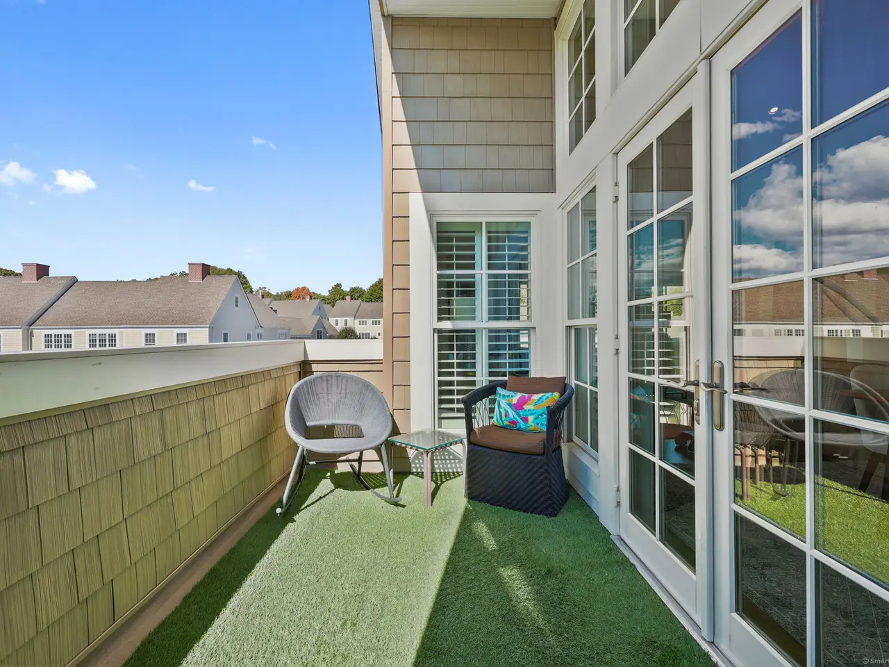 Penthouse duplex with dual private terraces offers a rare opportunity at the exclusive gated Palmer Hill Community on the Greenwich/Stamford border. This 2,077 sqft residence features soaring ceilings, floor-to-ceiling windows, and abundant natural light throughout. The home includes two primary suites and two and a half bathrooms; all finished with custom details. A gracious formal foyer leads to the open living and dining area with a fireplace and French doors to both terraces with a fountain, creating perfect indoor-outdoor living. The gourmet kitchen includes a generous eat-at island, six-burner stove, Liebherr refrigerator with two-drawer freezer, wine refrigerator, sink disposal, walk-in pantry with shelving, and full-size washer and dryer. The first-floor primary suite features detailed ceiling moldings, a custom walk-in closet, and a luxurious bath with steam shower, dual vanity, designer fixtures, and cabinetry. The second primary suite offers a custom walk-in closet, marble bathroom with dual vanity, and marble shower and flooring. A second-floor bonus room provides a flexible space ideal for a home office or lounge. Two indoor garage spaces and a private storage unit complete this exceptional home. Life feels like your on a vacation at Palmer Hill with a newly renovated clubhouse, fitness center, yoga room, business center, outdoor pool, hot tub, and fire pit. Quiet lanes invite leisurely walks and time with your dog. Enjoy easy access to I-95, Metro-North, Downtown Old Greenwich, Stamford, and Greenwich. Welcome to the easy life.