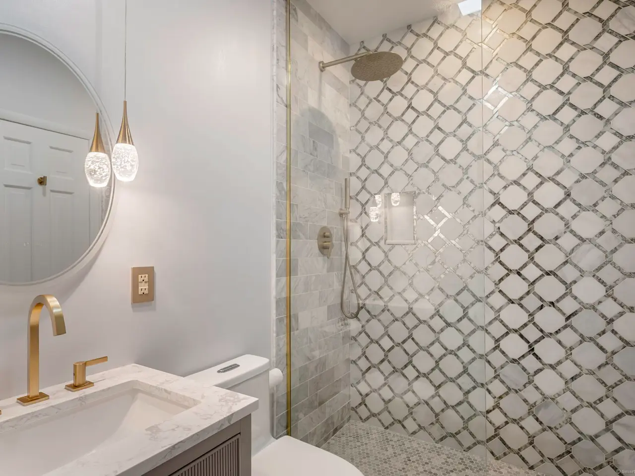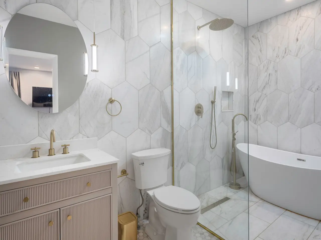 Luxurious primary suite with spa-like bath