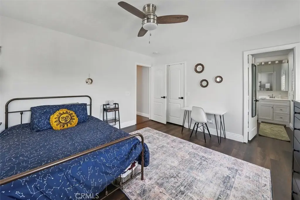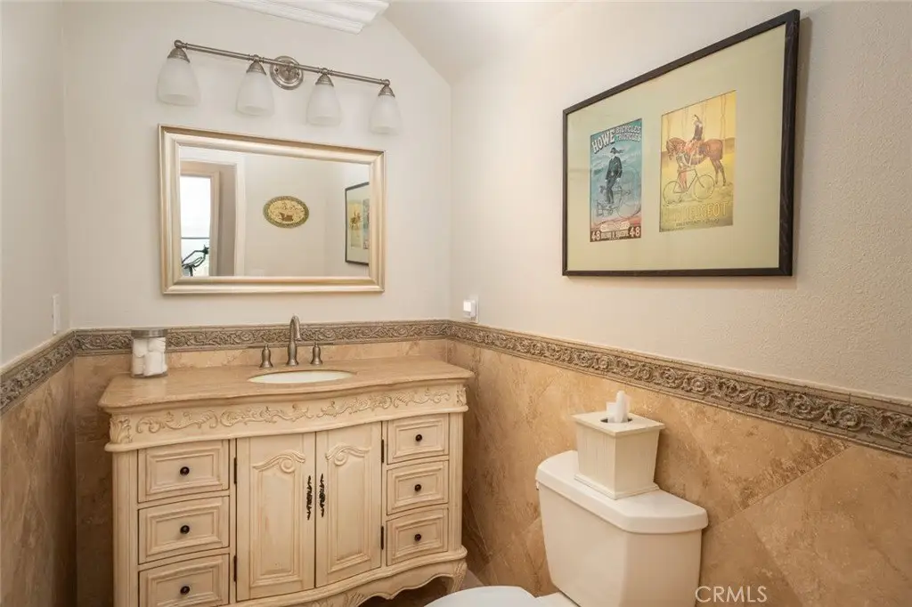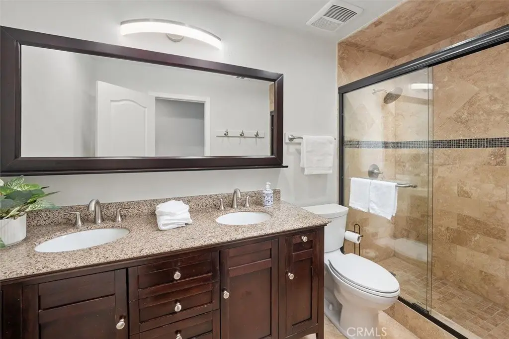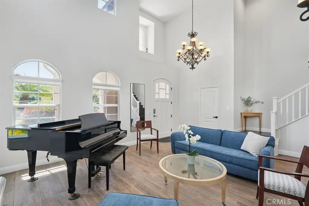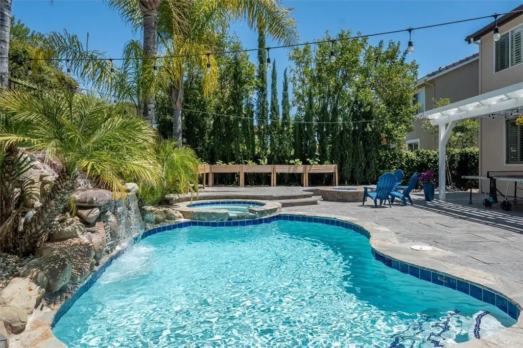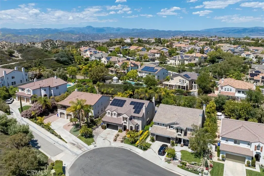 Nestled in a tranquil cul-de-sac, with stunning mountain views, this preeminent executive home offers a wonderful balance of elegance, comfort, and seamless indoor/outdoor living. Located in one of Stevenson Ranch's most coveted neighborhoods the home has superb curb appeal and a huge lot. Located just minutes from award-winning schools (including West Ranch High School), scenic parks, premier shopping, dining, and easy freeway access. From the moment you enter the door, the grand two-story formal living room impresses you with its soaring ceilings, abundant natural light, gorgeous fireplace and architectural details. Custom archways invite you into the family room with its cozy fireplace, sophisticated dining room, and designer-remodeled kitchen—a true chef’s delight. The kitchen features custom cabinetry with soft-close drawers, stainless steel KitchenAid appliances, and a built-in media cabinet. Elegant designer lighting highlights the expansive center island, perfect for gatherings. Upstairs, a spacious loft with breathtaking mountain views is an ideal setting for a media lounge, game room, or additional living space. The primary suite is a luxurious retreat, with vaulted ceilings and a spa-like en-suite bathroom with soaker tub, separate walk-in shower, full-wall linen closet with mirrored doors, and generous walk-in closet. One upstairs bedroom serves as a secondary primary suite with its own full, private bath, while two additional large bedrooms feature fresh paint and spacious walk-in closets. The downstairs fifth bedroom includes a three-door mirrored closet—perfect for a home office, guest bedroom or gym. The downstairs remodeled half-bath is plumbed for an additional shower. Designer wide-plank tile flooring, rich dark walnut hardwood, custom lighting, crown molding, window shutters, upgraded ceiling fans and elegant sconce fixtures create an ambiance of warmth and sophistication throughout the home. Step outside into a private refuge designed for year-round enjoyment. This is more than a backyard—it's an oasis. A patio cover frames the newly refinished sparkling pool and spa, while a brand-new built-in BBQ kitchen and outdoor firepit make entertaining a joy. This home features a leased solar power system (with battery backup) ensuring significant energy savings, reduced utility bills and peace of mind during power outages.
