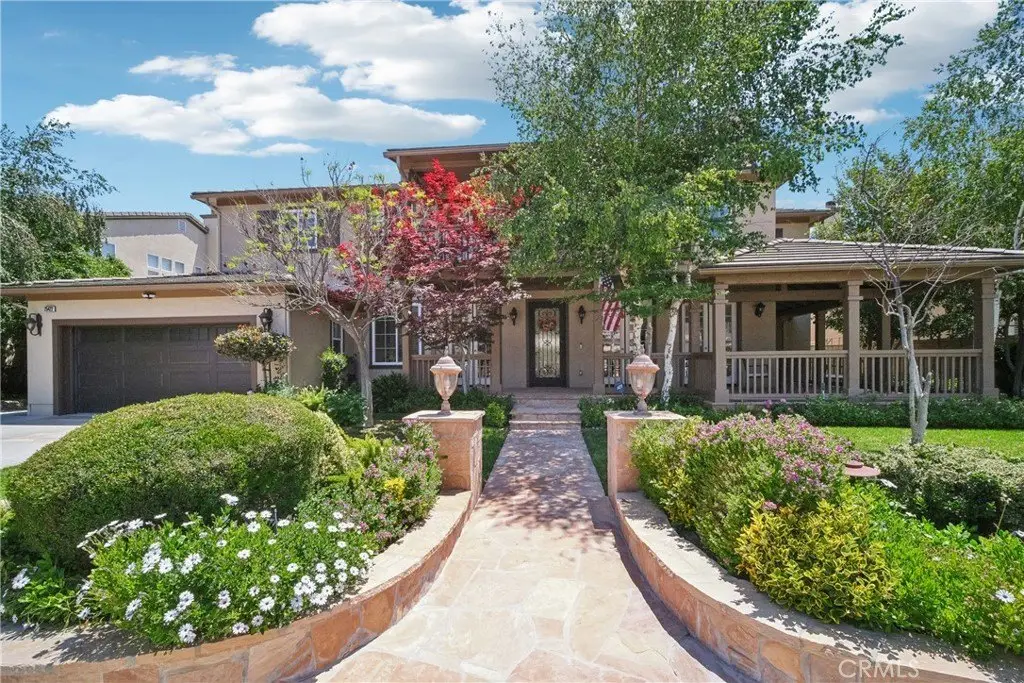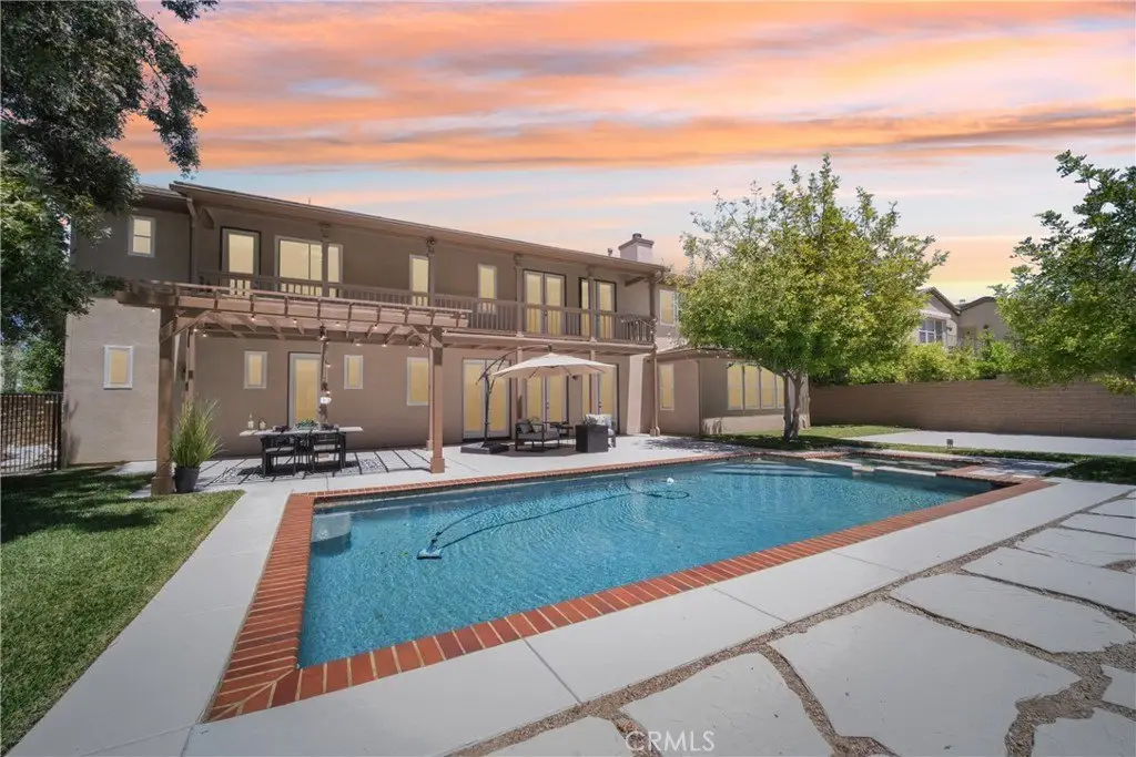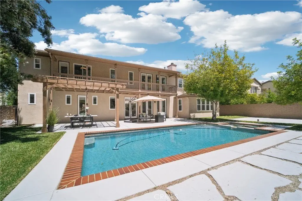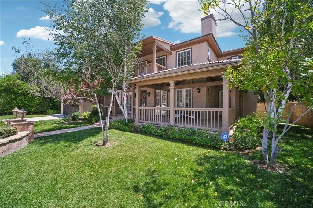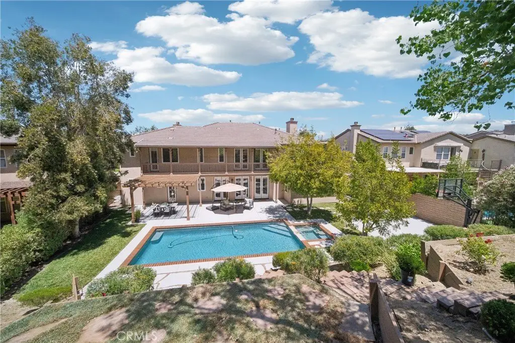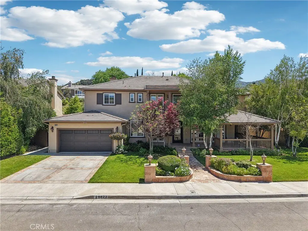 INCREDIBLY RARE Southern Oaks Manor! This charming Southern-style home sits on over 12,000 sq ft of park-like grounds and offers a full wraparound porch, making it one of only eight homes in the entire tract with this distinctive feature. Located in one of the most sought-after communities in Stevenson Ranch and surrounded by the scenic Santa Monica Mountains, this stunning residence is in immaculate condition and loaded with upgrades. The home features a newly remodeled pool and spa, basketball court, and newly installed Simonton dual-pane windows with UV tint throughout. Recent upgrades include brand new flooring, fresh interior paint, a newly remodeled kitchen with quartz counters, and newer (2020) French doors and windows that flood the home with natural light. With three fireplaces - in the front living room, family room, and the primary suite - this home blends warmth and charm with modern comfort. The expansive layout includes a full downstairs bedroom with 1.5 baths, an office/playroom, and a spacious executive office suite with its own separate entrance. The open-concept kitchen is designed for entertaining, complete with a breakfast bar, eat-in area, and three sets of French doors that open to the beautifully landscaped backyard. Upstairs you'll find four additional bedrooms, three full bathrooms, and a laundry room. The luxurious primary suite features a private retreat with a fireplace, dual walk-in closets, a spa-like bathroom, and a private balcony overlooking the backyard oasis. Additional highlights include a 3-car tandem garage with EV charging capability and ample storage. The HOA includes access to a clubhouse and community pool. No Mello-Roos.