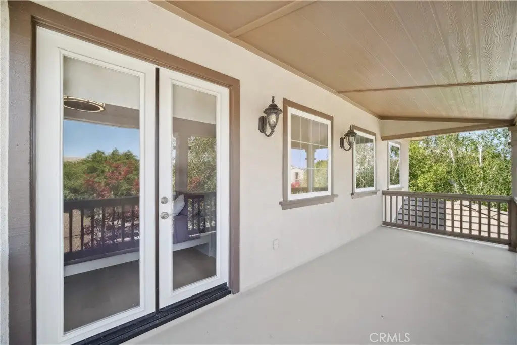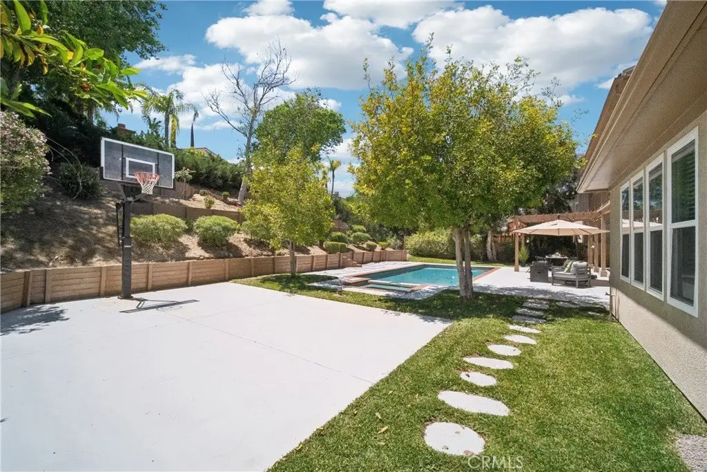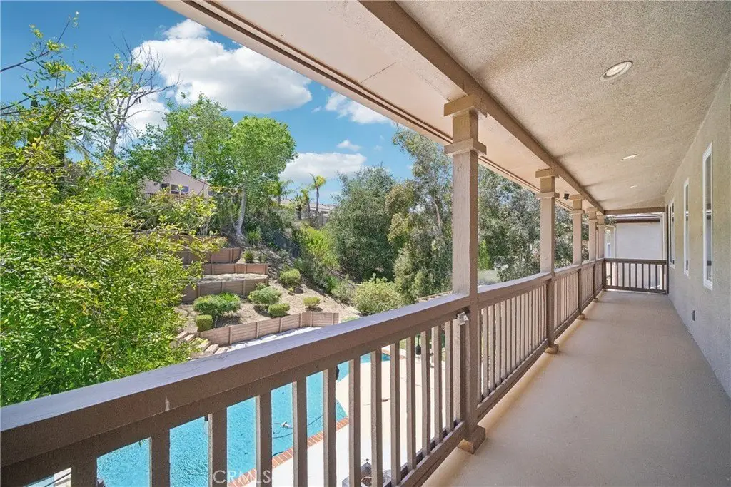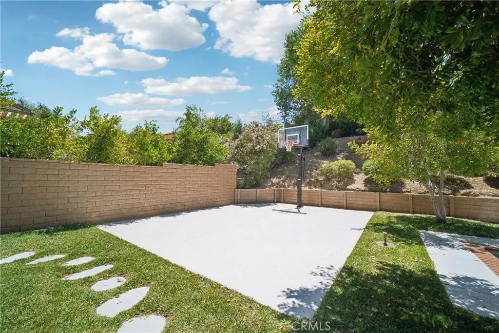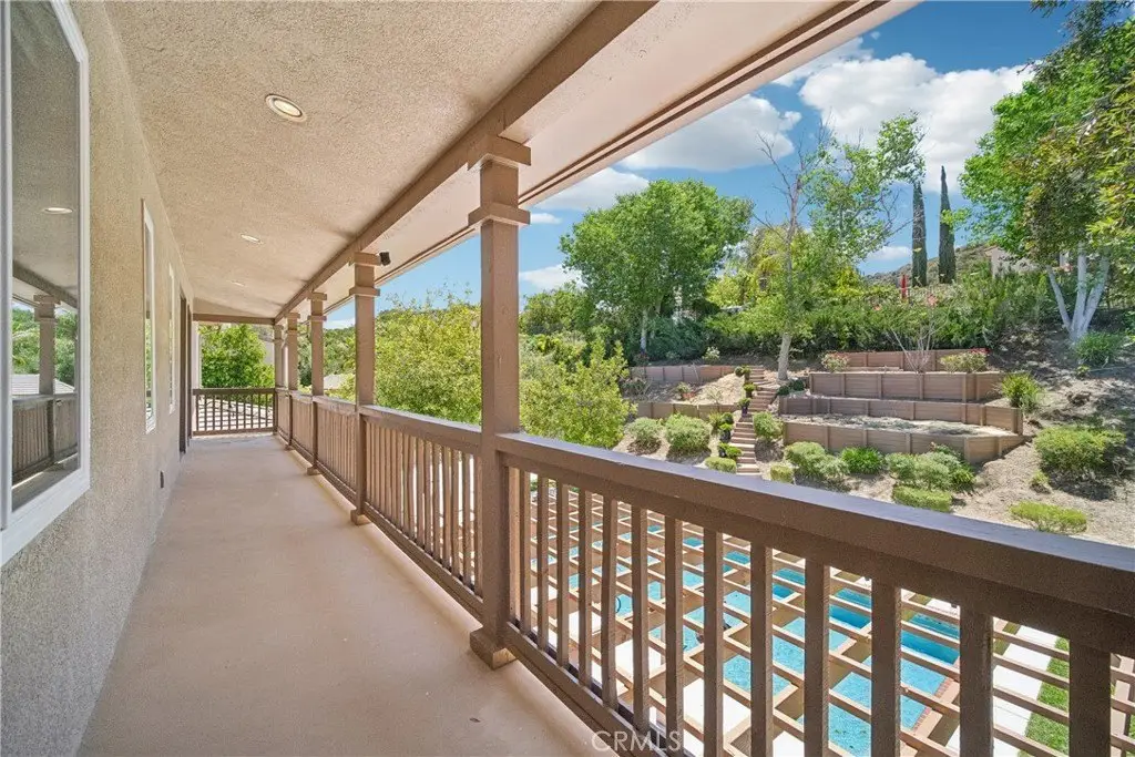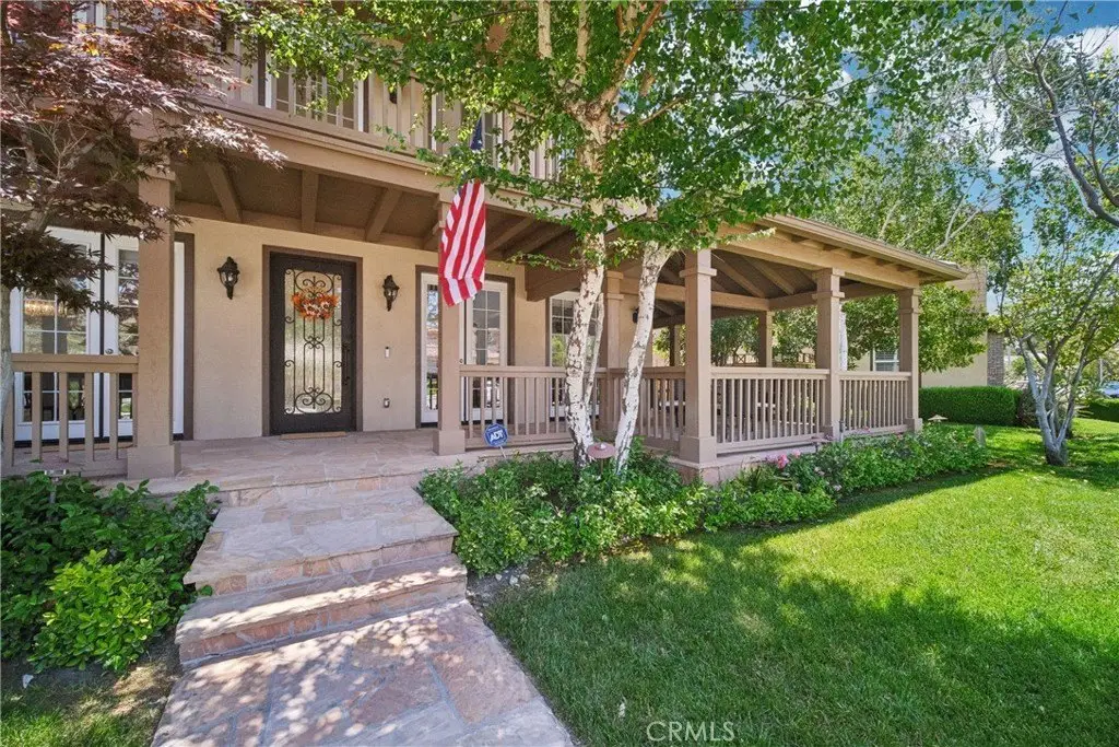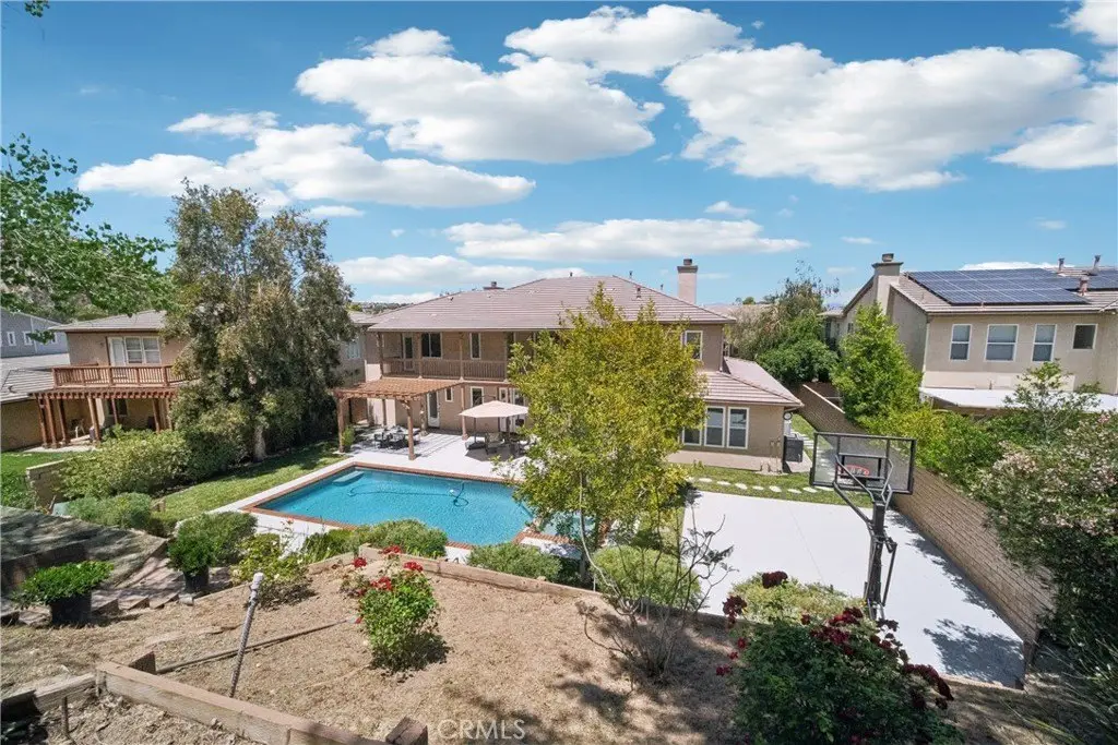 INCREDIBLY RARE Southern Oaks Manor! This charming Southern-style home sits on over 12,000 sq ft of park-like grounds and offers a full wraparound porch, making it one of only eight homes in the entire tract with this distinctive feature. Located in one of the most sought-after communities in Stevenson Ranch and surrounded by the scenic Santa Monica Mountains, this stunning residence is in immaculate condition and loaded with upgrades. The home features a newly remodeled pool and spa, basketball court, and newly installed Simonton dual-pane windows with UV tint throughout. Recent upgrades include brand new flooring, fresh interior paint, a newly remodeled kitchen with quartz counters, and newer (2020) French doors and windows that flood the home with natural light. With three fireplaces - in the front living room, family room, and the primary suite - this home blends warmth and charm with modern comfort. The expansive layout includes a full downstairs bedroom with 1.5 baths, an office/playroom, and a spacious executive office suite with its own separate entrance. The open-concept kitchen is designed for entertaining, complete with a breakfast bar, eat-in area, and three sets of French doors that open to the beautifully landscaped backyard. Upstairs you'll find four additional bedrooms, three full bathrooms, and a laundry room. The luxurious primary suite features a private retreat with a fireplace, dual walk-in closets, a spa-like bathroom, and a private balcony overlooking the backyard oasis. Additional highlights include a 3-car tandem garage with EV charging capability and ample storage. The HOA includes access to a clubhouse and community pool. No Mello-Roos.