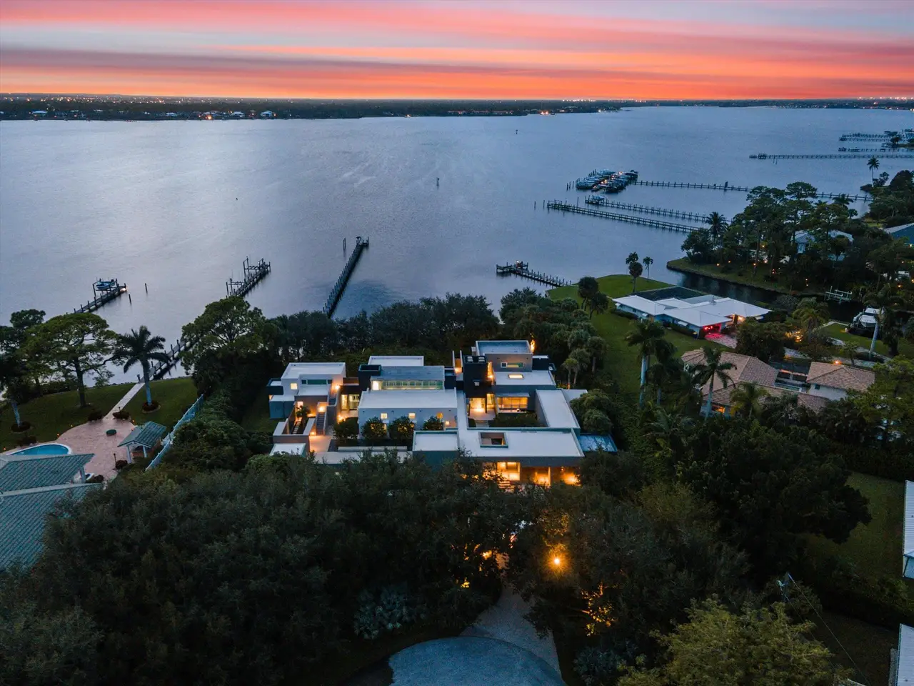 Set on an expansive double riverfront lot, this extraordinary residence boasts over 200 feet of protected shoreline, ensuring privacy, tranquility, and an intimate connection to nature. With unobstructed, sweeping views of the St. Lucie River, the home serves as a front-row seat to the spectacular beauty of panoramic sunsets that transform the sky into a canvas of vibrant colors each evening. This 7,500 sq ft modern masterpiece is a harmonious blend of cutting-edge design and the serene allure of waterfront living. Its striking architecture and floor-to-ceiling windows frame the river from nearly every angle. The residence radiates contemporary elegance while remaining firmly rooted in the natural beauty of its surroundings.
