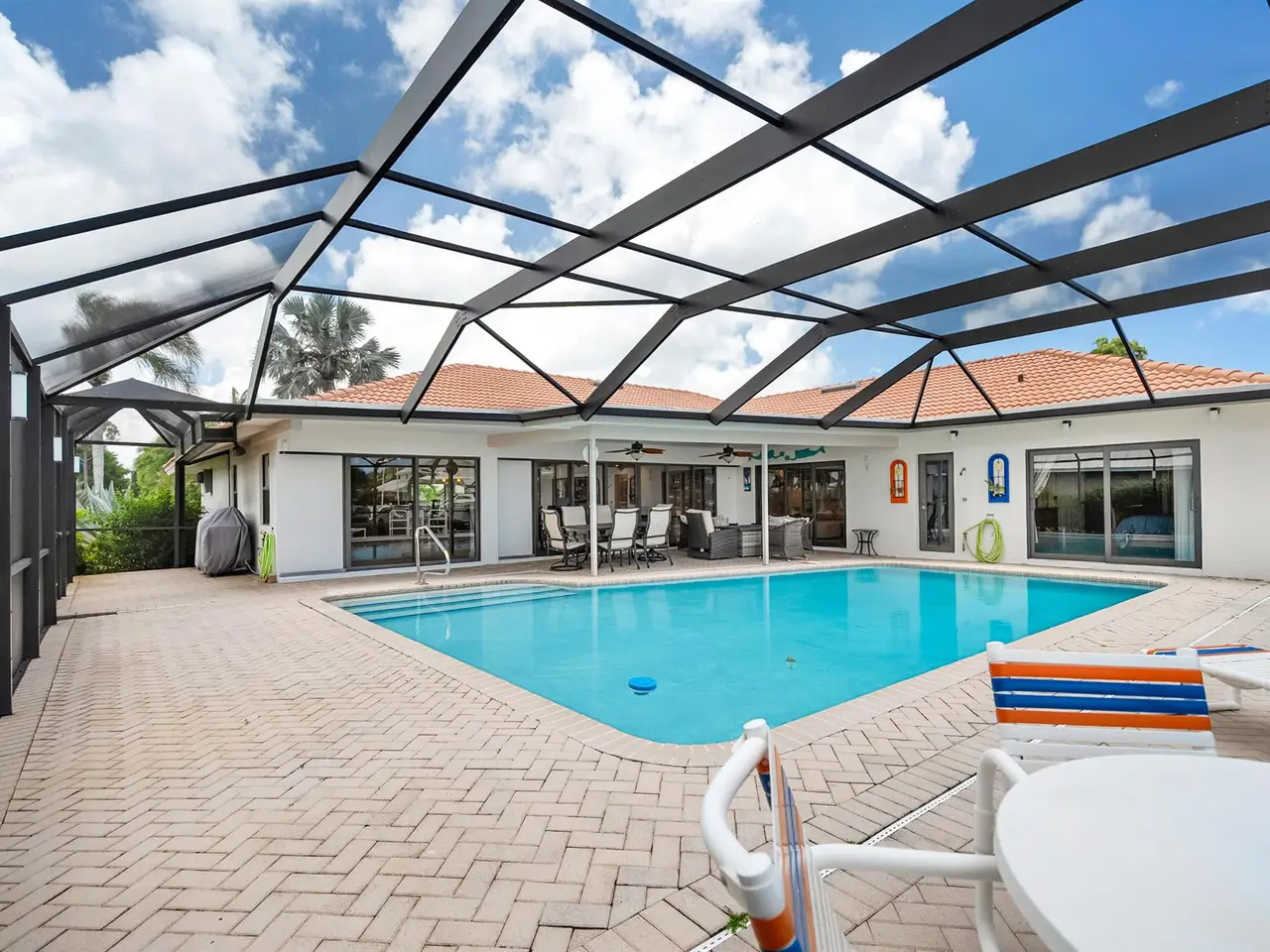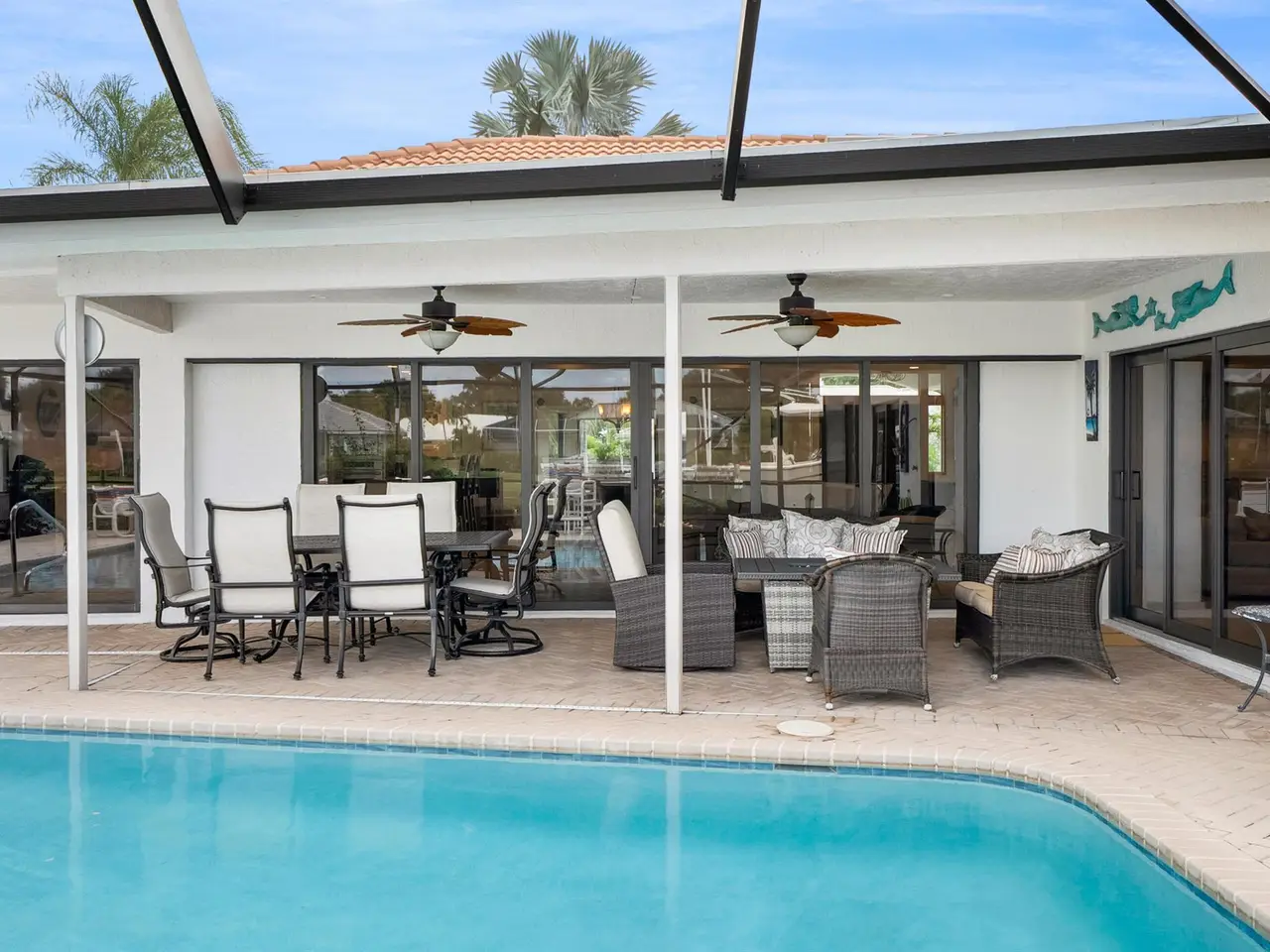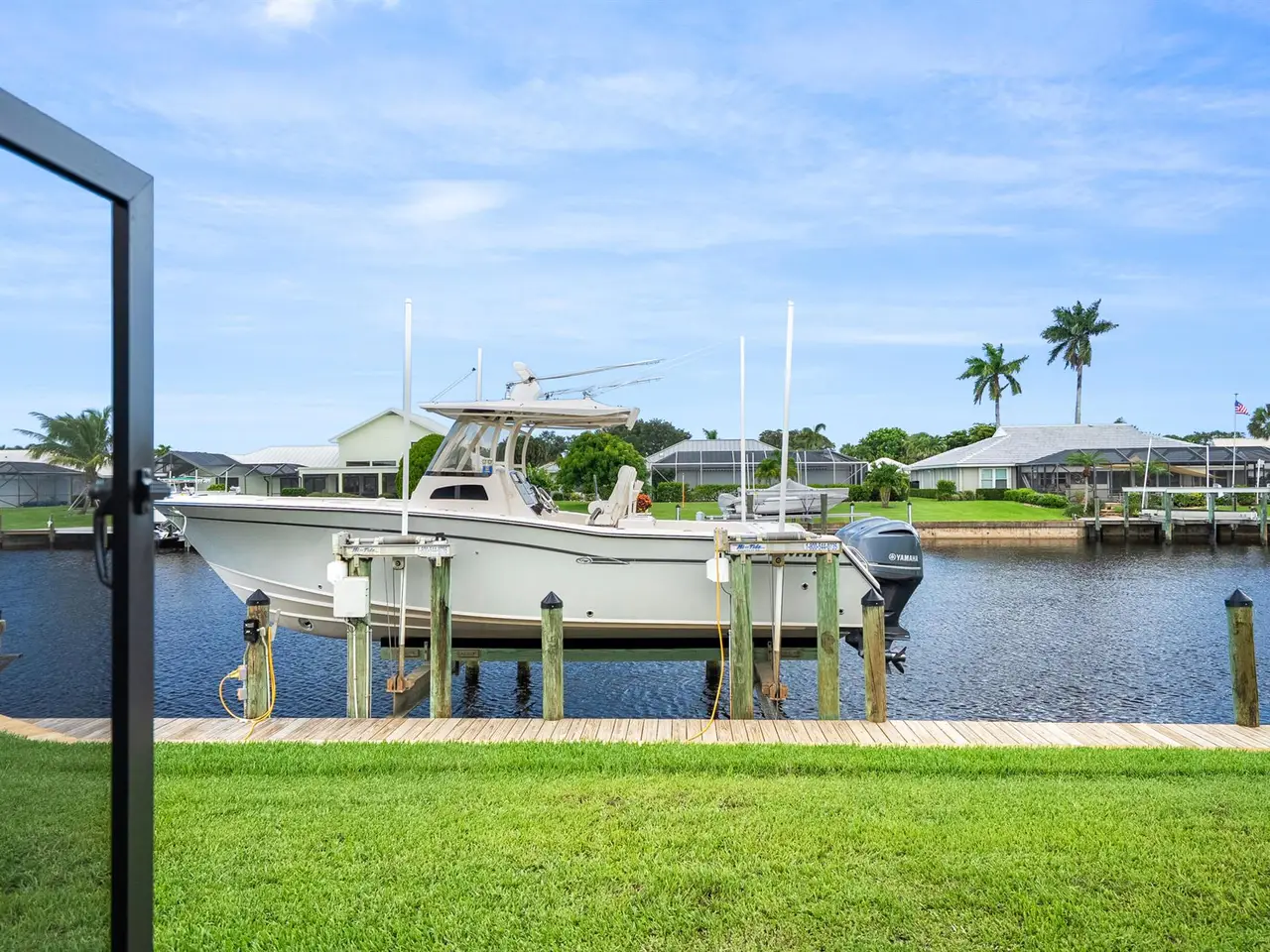 Welcome Home to your impeccably renovated 3-bdrm, 3-bath waterfront home with private dock located in the prestigious, guard-gated Stuart Yacht & Country Club. Perfectly positioned on a quiet cul-de-sac with direct canal access, this residence blends luxury living with effortless coastal charm. Designer chef's kitchen boasts custom cabinetry, Thermidor 6‑burner gas range & wall oven, wine fridge and newer S/S fridge, dishwasher & microwave. Airy and open living area perfect for entertaining or just relaxing, impact glass window's/sliders throughout, owner's suite w/ spa bath; 2 en‑suite guest rooms. Step through the sliders to your newly screened lanai and stunning pool! 30,000 lb boat lift with newer Seawell cap and tiebacks (2019). Enjoy this low HOA gated community with golf