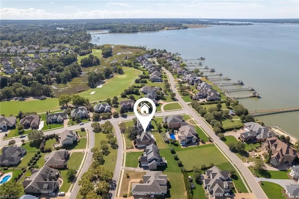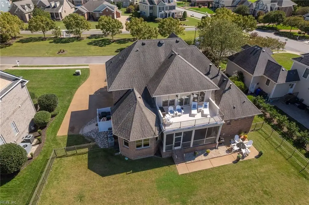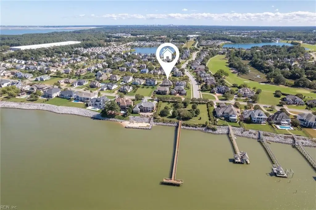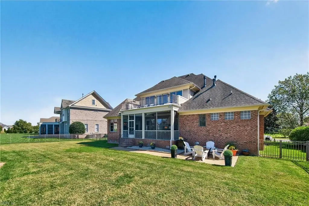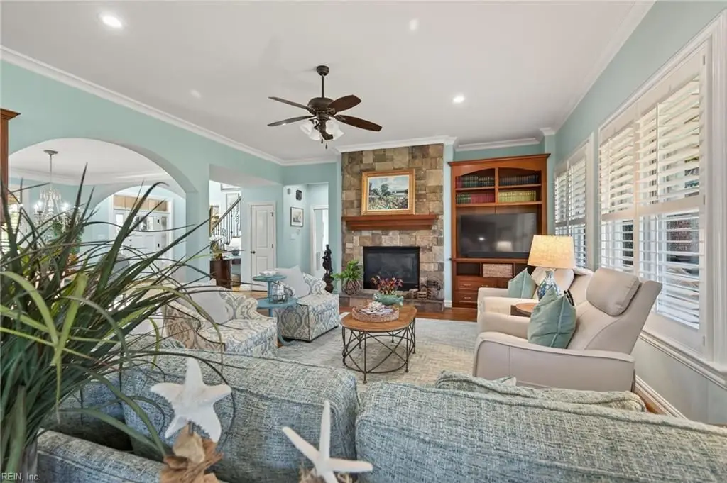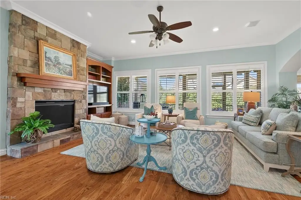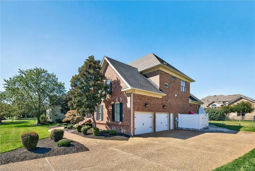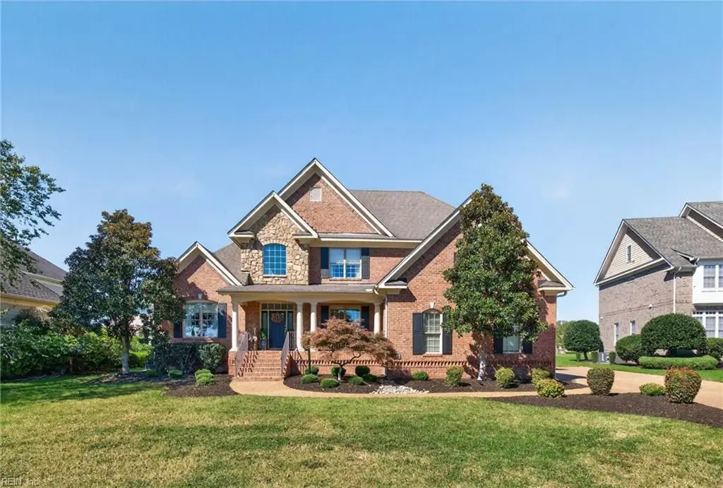 Stately brick and stone home in The Riverfront featuring timeless design, elegant finishes, and exceptional craftsmanship. Grand two-story foyer opens to refined living spaces with hardwood floors, updated lighting, & plantation shutters. The gourmet kitchen includes granite countertops, a freshly painted island, corner pantry, and premium stainless-steel appliances, flowing into a warm living room with gas fireplace and custom built-ins. The first-floor primary suite offers a tray ceiling, fireplace, dual walk-in closets, & ensuite bath w/new quartz countertops, oversized double shower, & jetted tub. Ideal for entertaining with a wet bar, screened porch, and an upstairs rec room leading to a west-facing deck for sunset views. Custom millwork, crown molding, arched doorways, and abundant storage throughout. Beautifully maintained landscaping, minutes from the park and pier on the Nansemond River, w/access to golf, trails, & resort-style community amenities. 1 year 2-10 Home Warranty