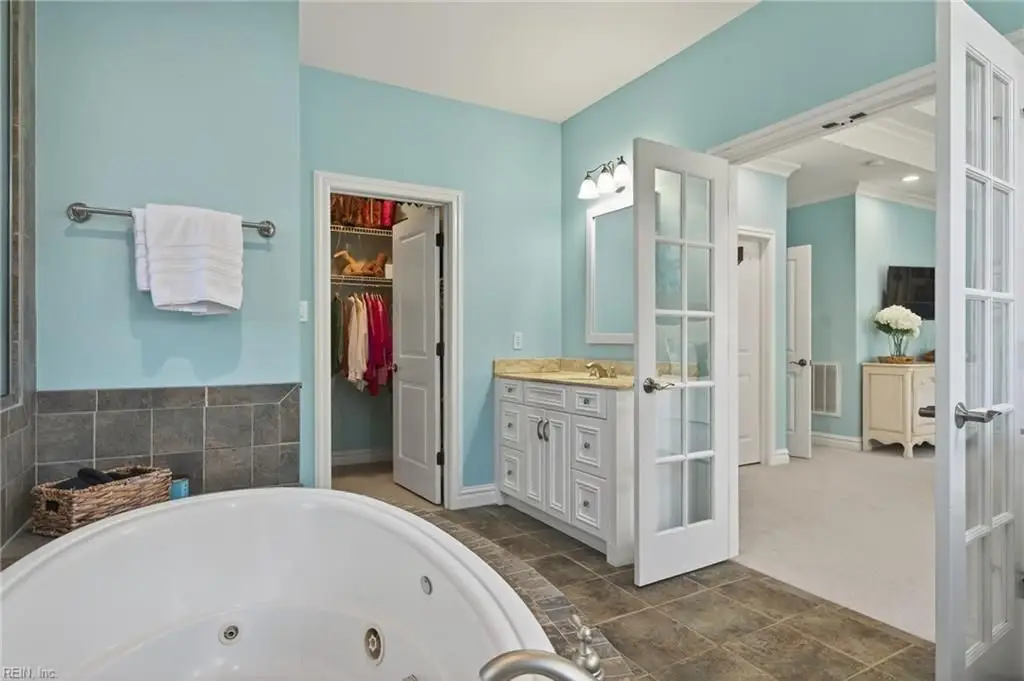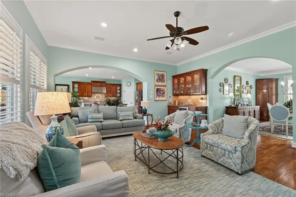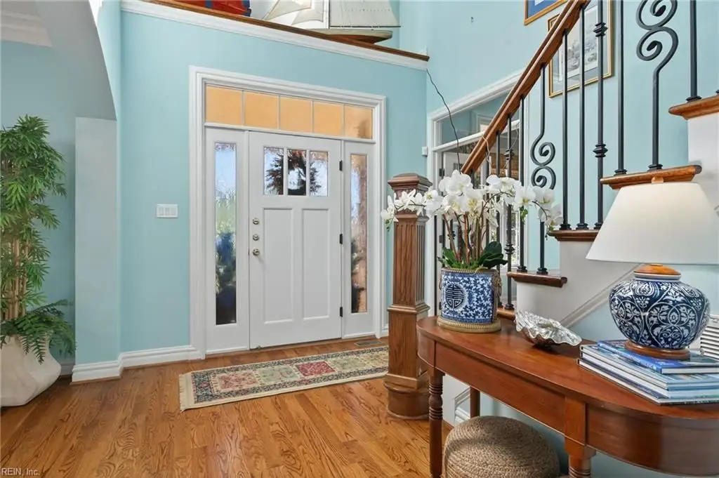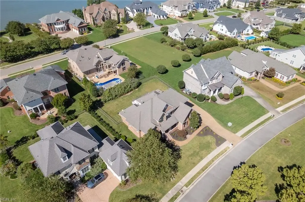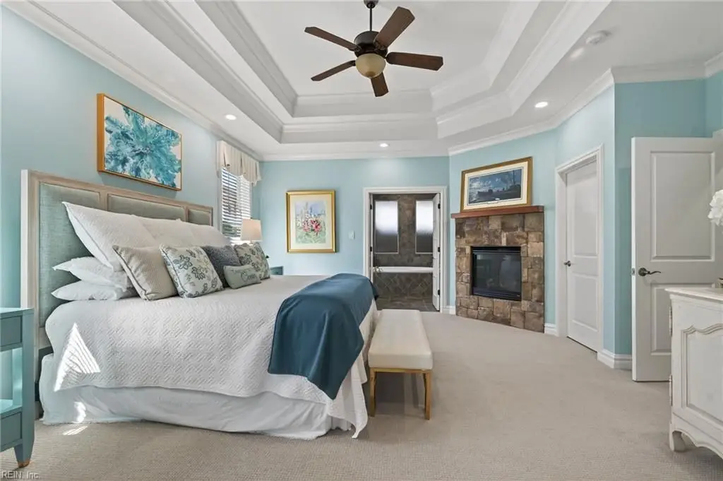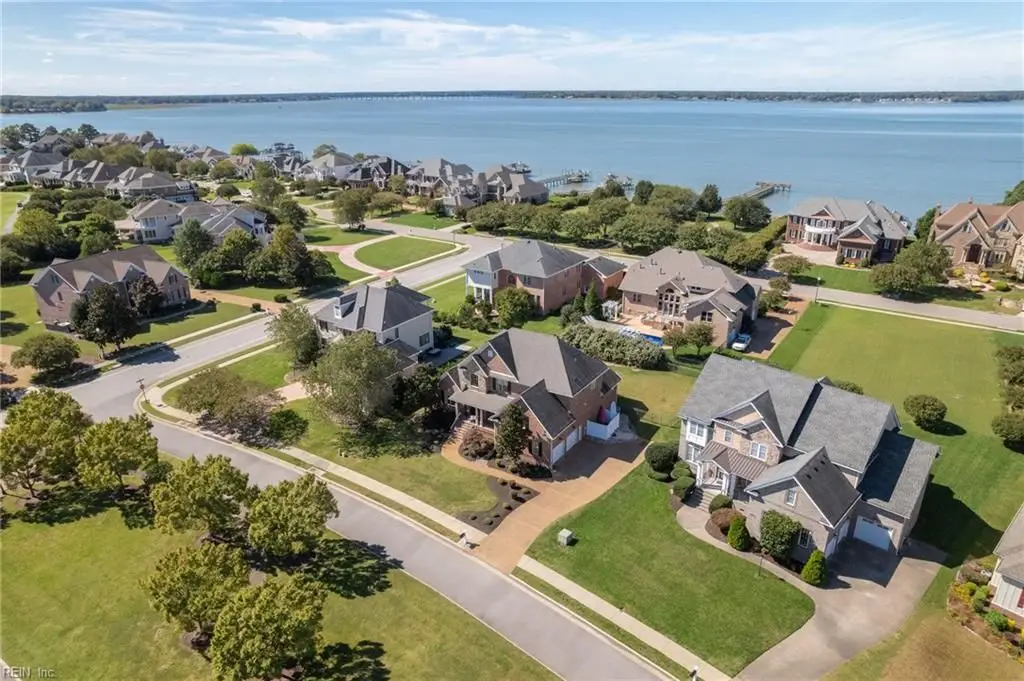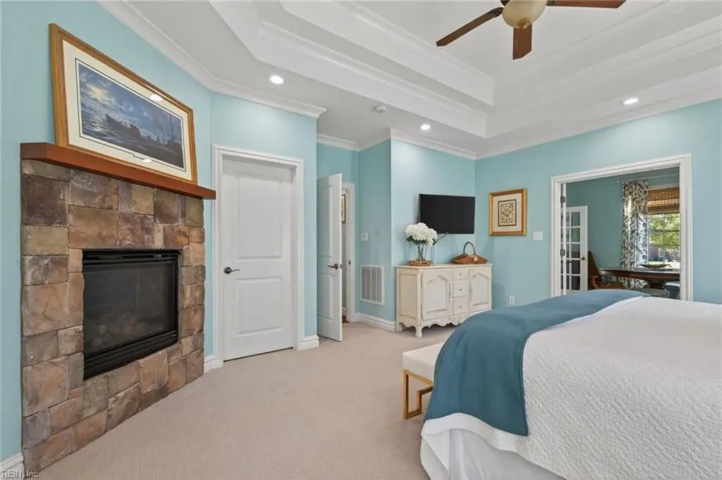Stately brick and stone home in The Riverfront featuring timeless design, elegant finishes, and exceptional craftsmanship. Grand two-story foyer opens to refined living spaces with hardwood floors, updated lighting, & plantation shutters. The gourmet kitchen includes granite countertops, a freshly painted island, corner pantry, and premium stainless-steel appliances, flowing into a warm living room with gas fireplace and custom built-ins. The first-floor primary suite offers a tray ceiling, fireplace, dual walk-in closets, & ensuite bath w/new quartz countertops, oversized double shower, & jetted tub. Ideal for entertaining with a wet bar, screened porch, and an upstairs rec room leading to a west-facing deck for sunset views. Custom millwork, crown molding, arched doorways, and abundant storage throughout. Beautifully maintained landscaping, minutes from the park and pier on the Nansemond River, w/access to golf, trails, & resort-style community amenities. 1 year 2-10 Home Warranty