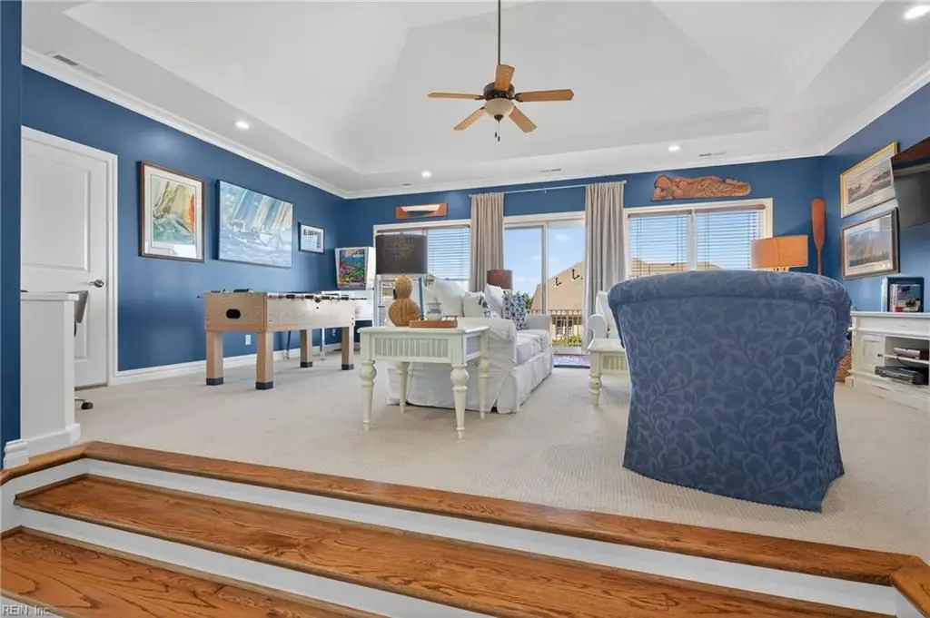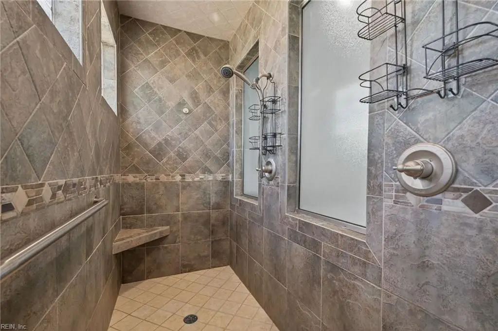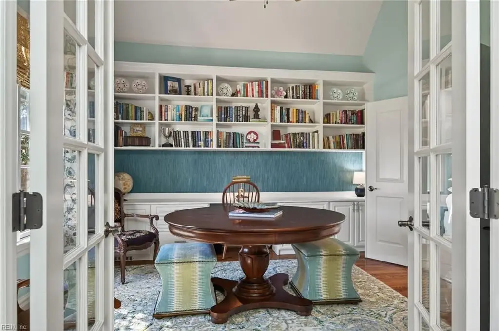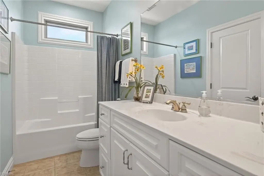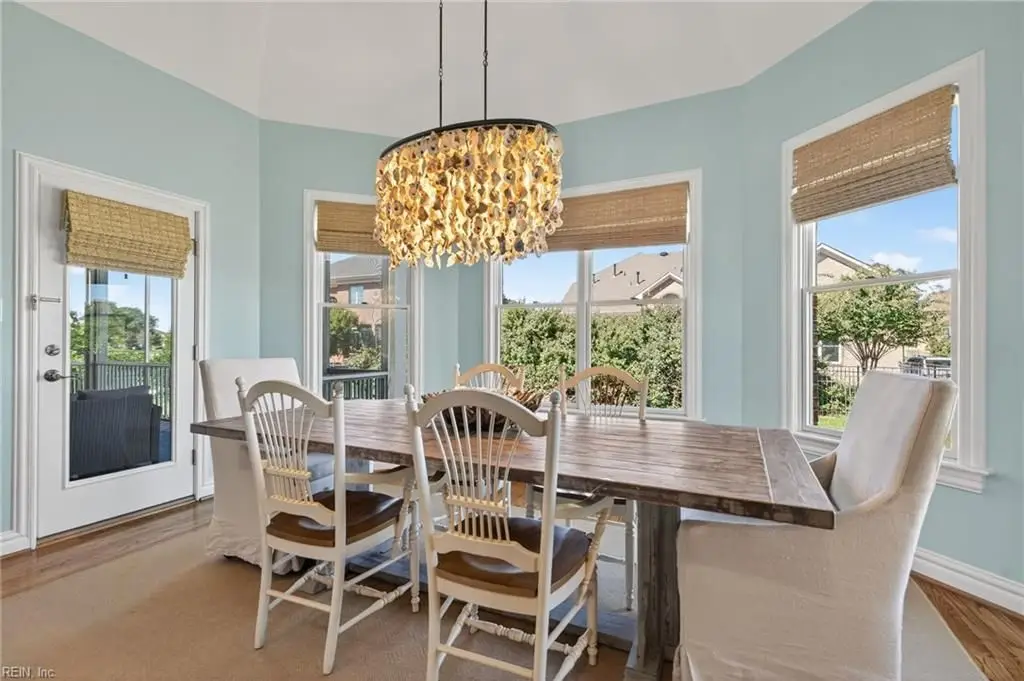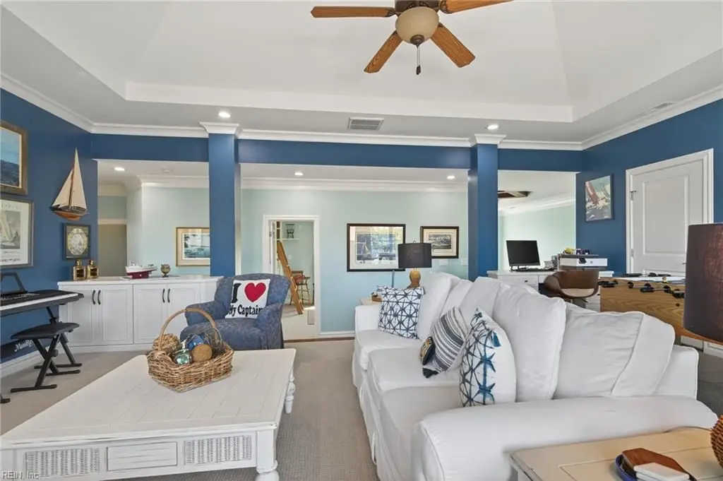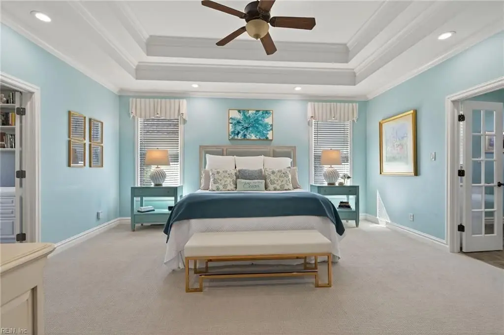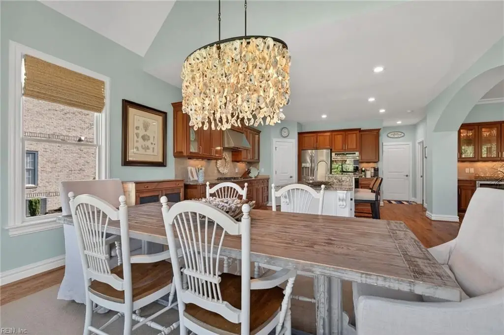 Stately brick and stone home in The Riverfront featuring timeless design, elegant finishes, and exceptional craftsmanship. Grand two-story foyer opens to refined living spaces with hardwood floors, updated lighting, & plantation shutters. The gourmet kitchen includes granite countertops, a freshly painted island, corner pantry, and premium stainless-steel appliances, flowing into a warm living room with gas fireplace and custom built-ins. The first-floor primary suite offers a tray ceiling, fireplace, dual walk-in closets, & ensuite bath w/new quartz countertops, oversized double shower, & jetted tub. Ideal for entertaining with a wet bar, screened porch, and an upstairs rec room leading to a west-facing deck for sunset views. Custom millwork, crown molding, arched doorways, and abundant storage throughout. Beautifully maintained landscaping, minutes from the park and pier on the Nansemond River, w/access to golf, trails, & resort-style community amenities. 1 year 2-10 Home Warranty