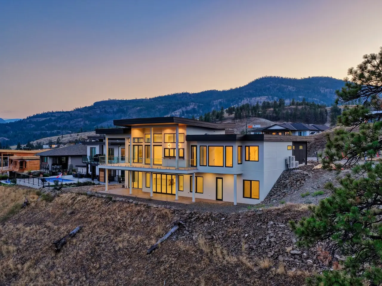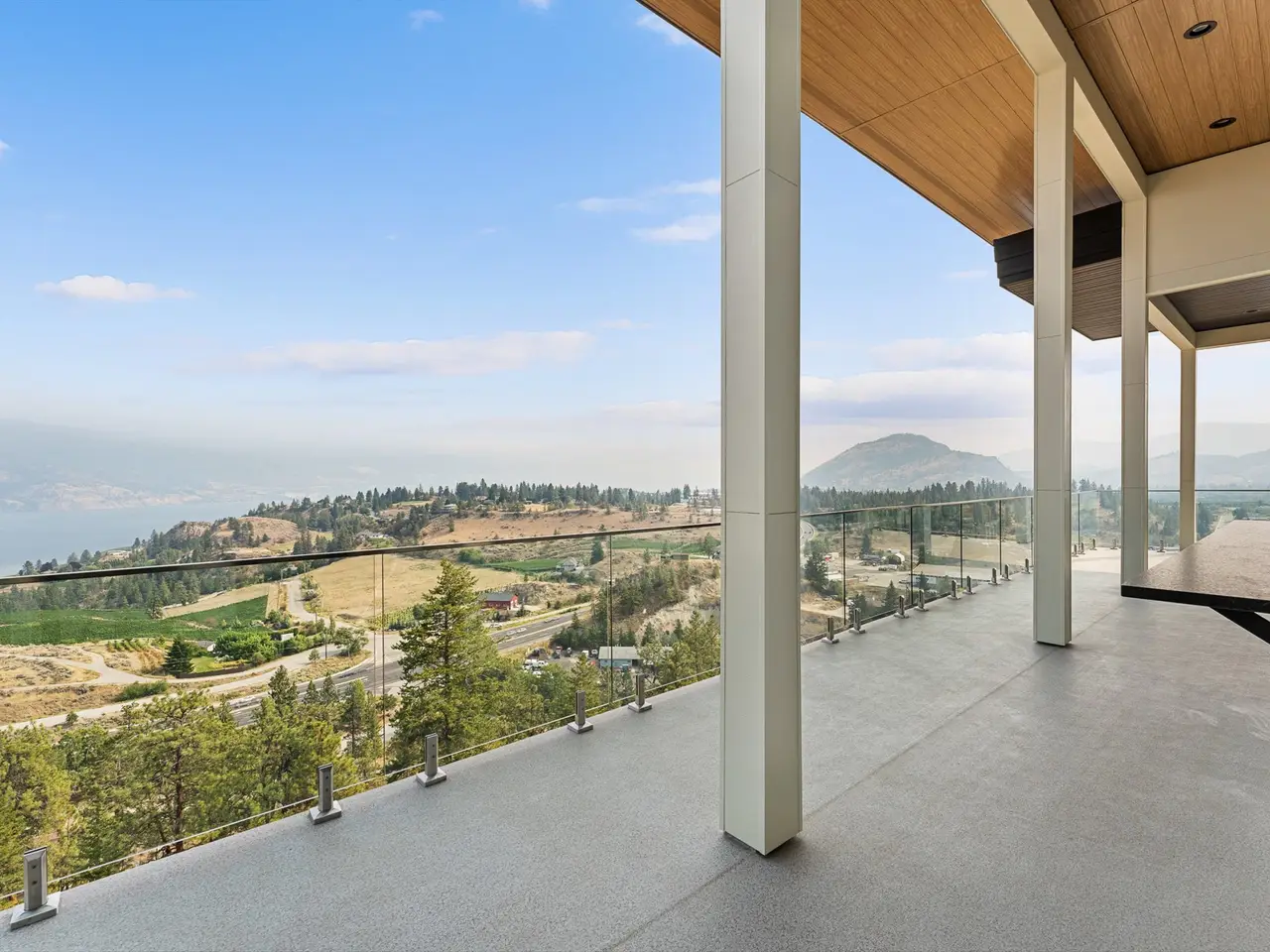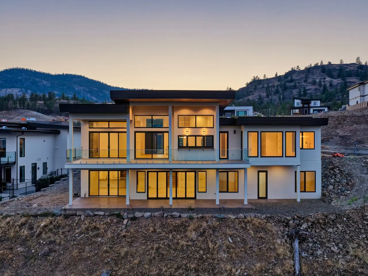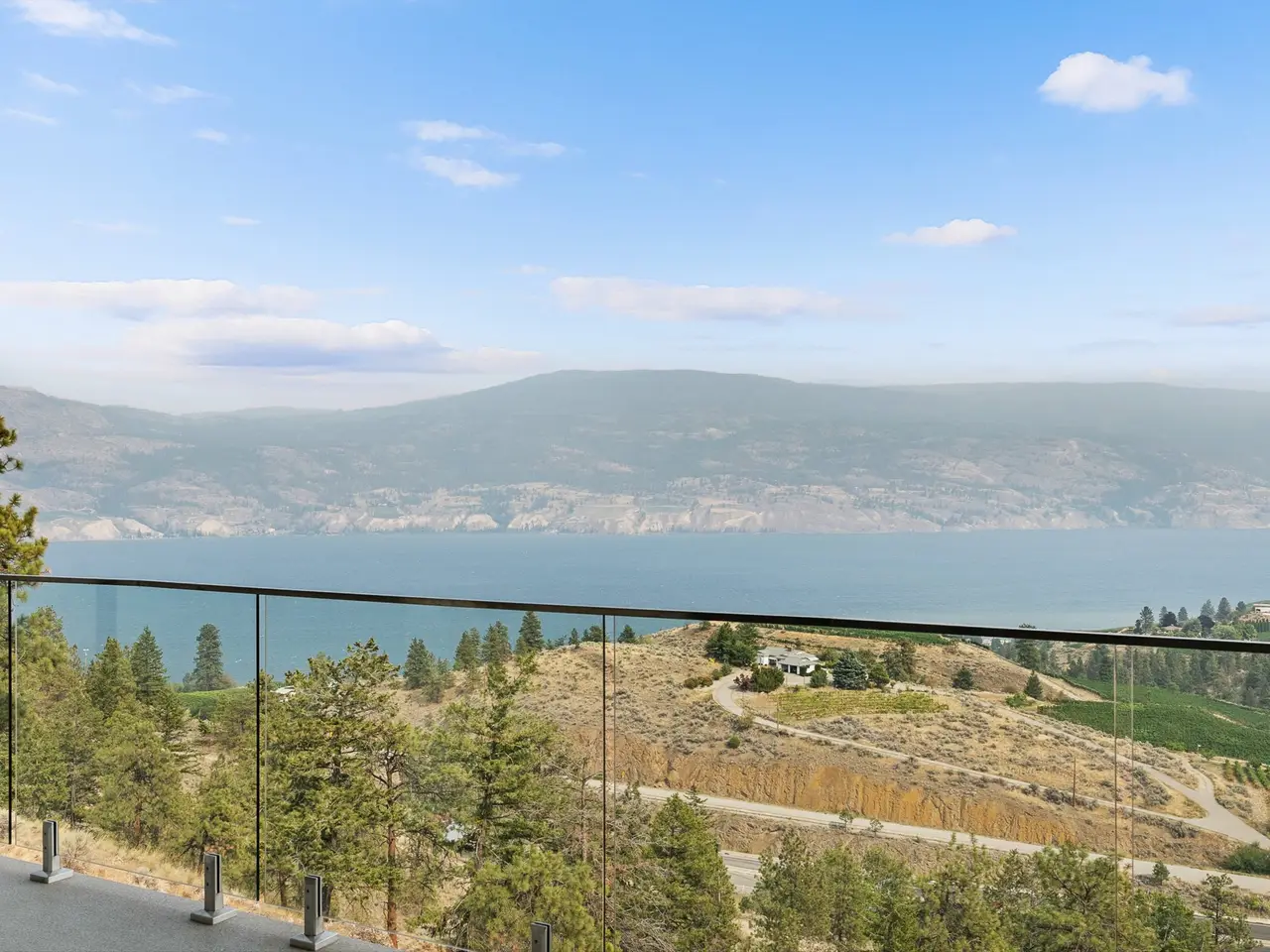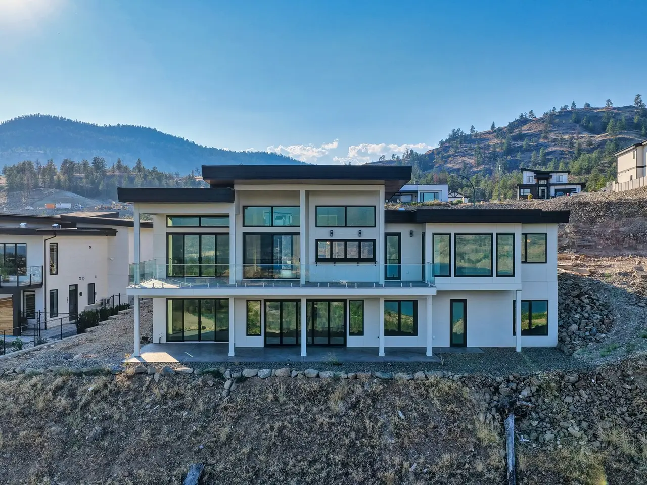 Brand new and net-zero ready, this architectural showpiece by Gelcor is set in Summerland’s coveted Hunters Hill community – an area exempt from the foreign buyer ban. With panoramic 180 degree views of Okanagan Lake, vineyards, & mountains, the home blends design excellence with forward-thinking innovation. Inside, wide-plank oak floors, soaring ceilings, & walls of glass frame the lake beyond. The kitchen is a culinary masterpiece with professional Bosch appliances, granite surfaces, walk in pantry, & a dramatic island with an adjacent pass through that opens to a deck with bar seating & built-in speakers. The main level hosts a dining room, living area with tiled feature wall & fireplace & a serene primary suite with a spa-like, award-nominated, ensuite with heated floors, freestanding tub, & lake views. The lower level extends the lifestyle: a rec room with nano doors to the covered patio, a quartzite waterfall edge wet bar, glass-walled wine cellar, theatre, gym, & guest suites, all capturing lakefront vistas. Lower level flooring is heated excluding the wine room & gym. Outdoors, xeriscape landscaping frames a generous side yard with a pool permit in place. Upgrades include 3-zone indoor/outdoor speaker system, triple-glazed windows, sprinkler system, EV-ready 3-car garage with epoxy floors, & suspended slab construction. A rare opportunity to own a design-forward home that redefines Okanagan living. $20,000 worth of incentives with firm sale before Oct 10. See your realtor for full details. Interior photos are virtually staged.