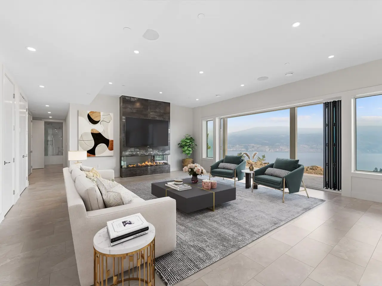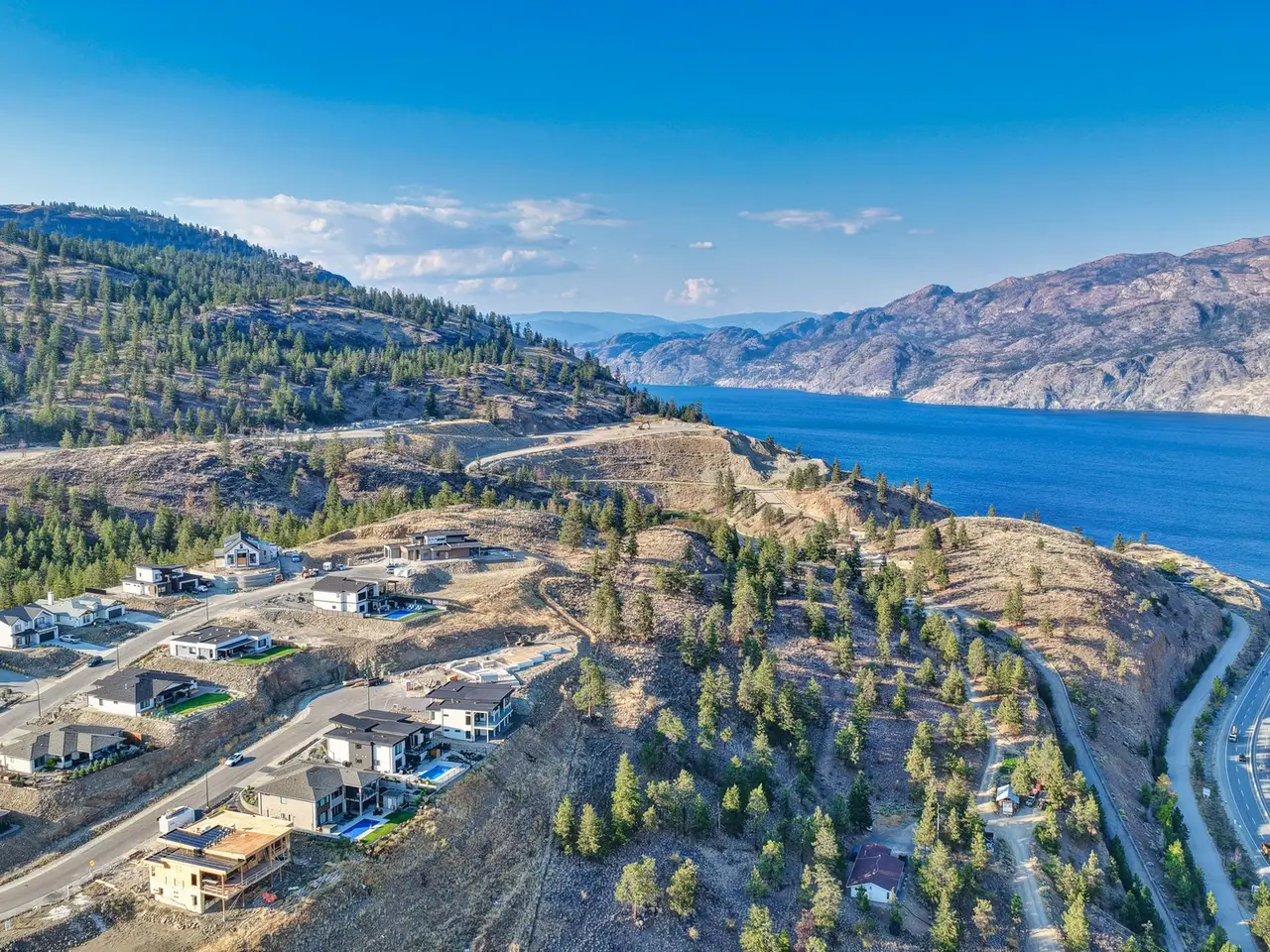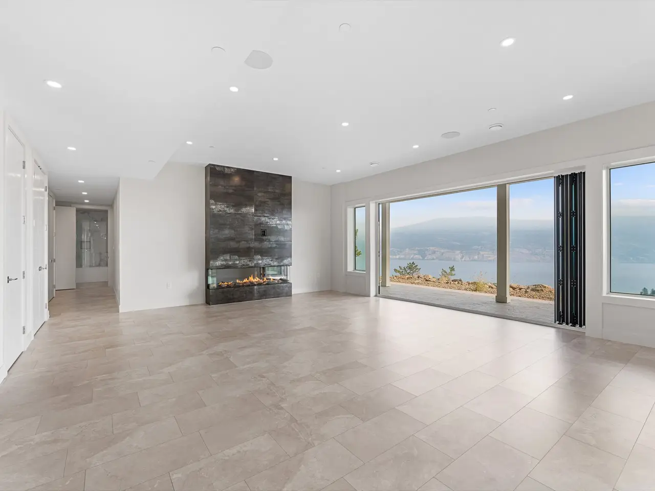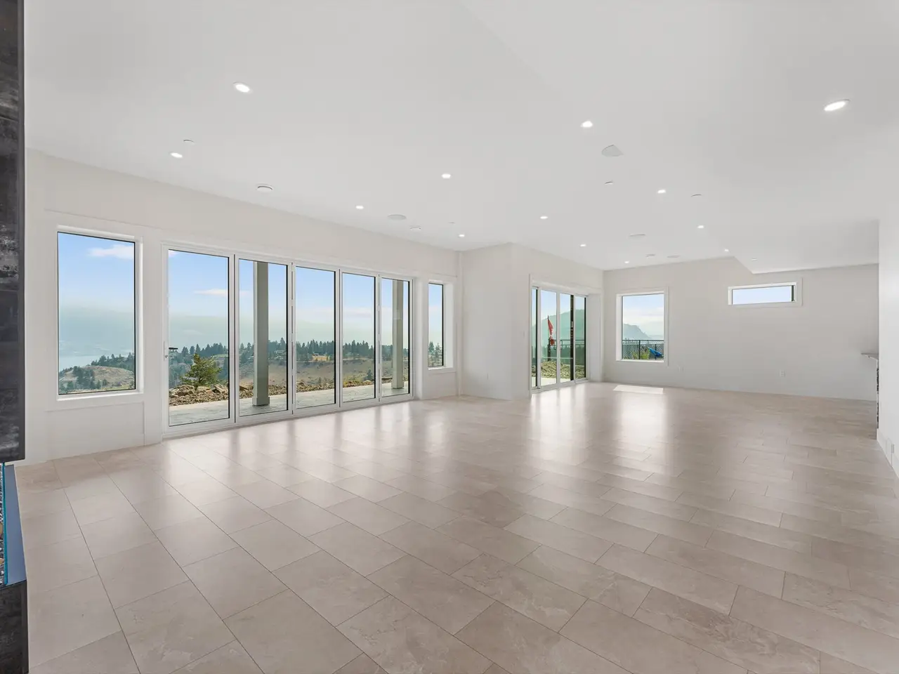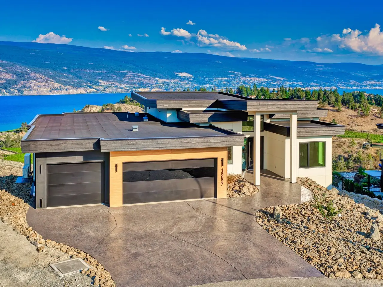 Brand new and net-zero ready, this architectural showpiece by Gelcor is set in Summerland’s coveted Hunters Hill community – an area exempt from the foreign buyer ban. With panoramic 180 degree views of Okanagan Lake, vineyards, & mountains, the home blends design excellence with forward-thinking innovation. Inside, wide-plank oak floors, soaring ceilings, & walls of glass frame the lake beyond. The kitchen is a culinary masterpiece with professional Bosch appliances, granite surfaces, walk in pantry, & a dramatic island with an adjacent pass through that opens to a deck with bar seating & built-in speakers. The main level hosts a dining room, living area with tiled feature wall & fireplace & a serene primary suite with a spa-like, award-nominated, ensuite with heated floors, freestanding tub, & lake views. The lower level extends the lifestyle: a rec room with nano doors to the covered patio, a quartzite waterfall edge wet bar, glass-walled wine cellar, theatre, gym, & guest suites, all capturing lakefront vistas. Lower level flooring is heated excluding the wine room & gym. Outdoors, xeriscape landscaping frames a generous side yard with a pool permit in place. Upgrades include 3-zone indoor/outdoor speaker system, triple-glazed windows, sprinkler system, EV-ready 3-car garage with epoxy floors, & suspended slab construction. A rare opportunity to own a design-forward home that redefines Okanagan living. $20,000 worth of incentives with firm sale before Oct 10. See your realtor for full details. Interior photos are virtually staged.