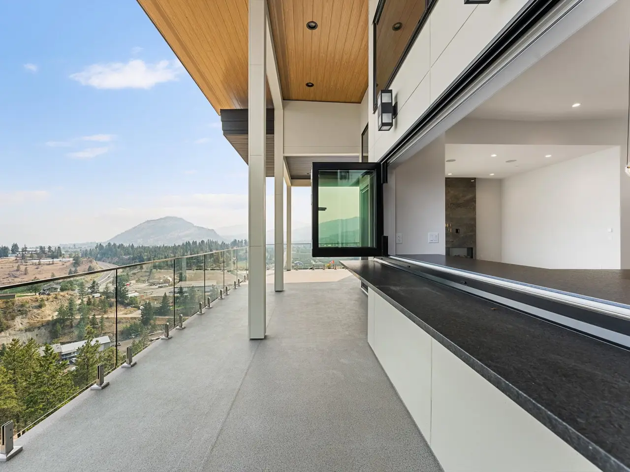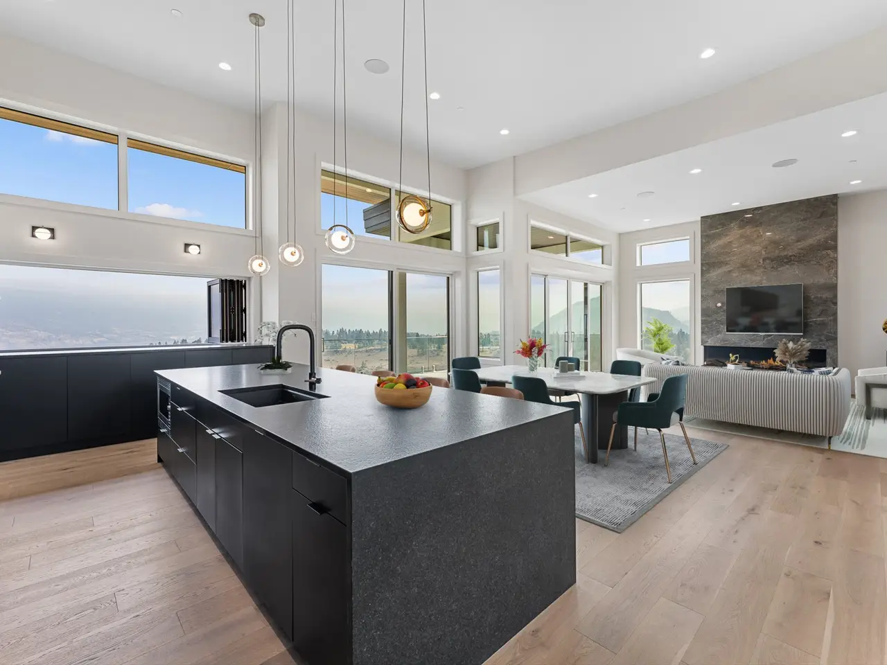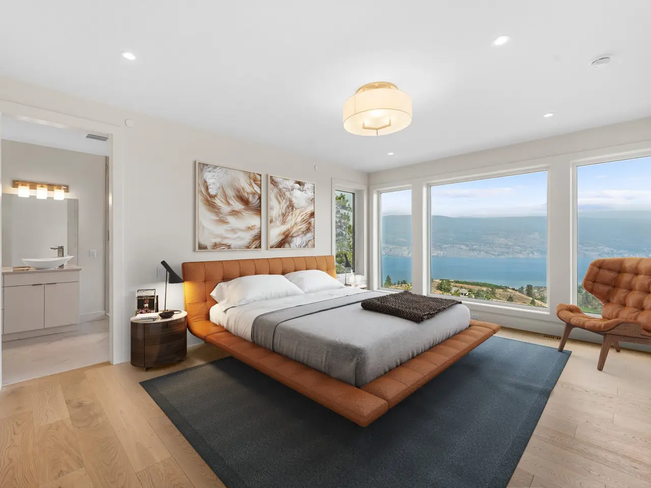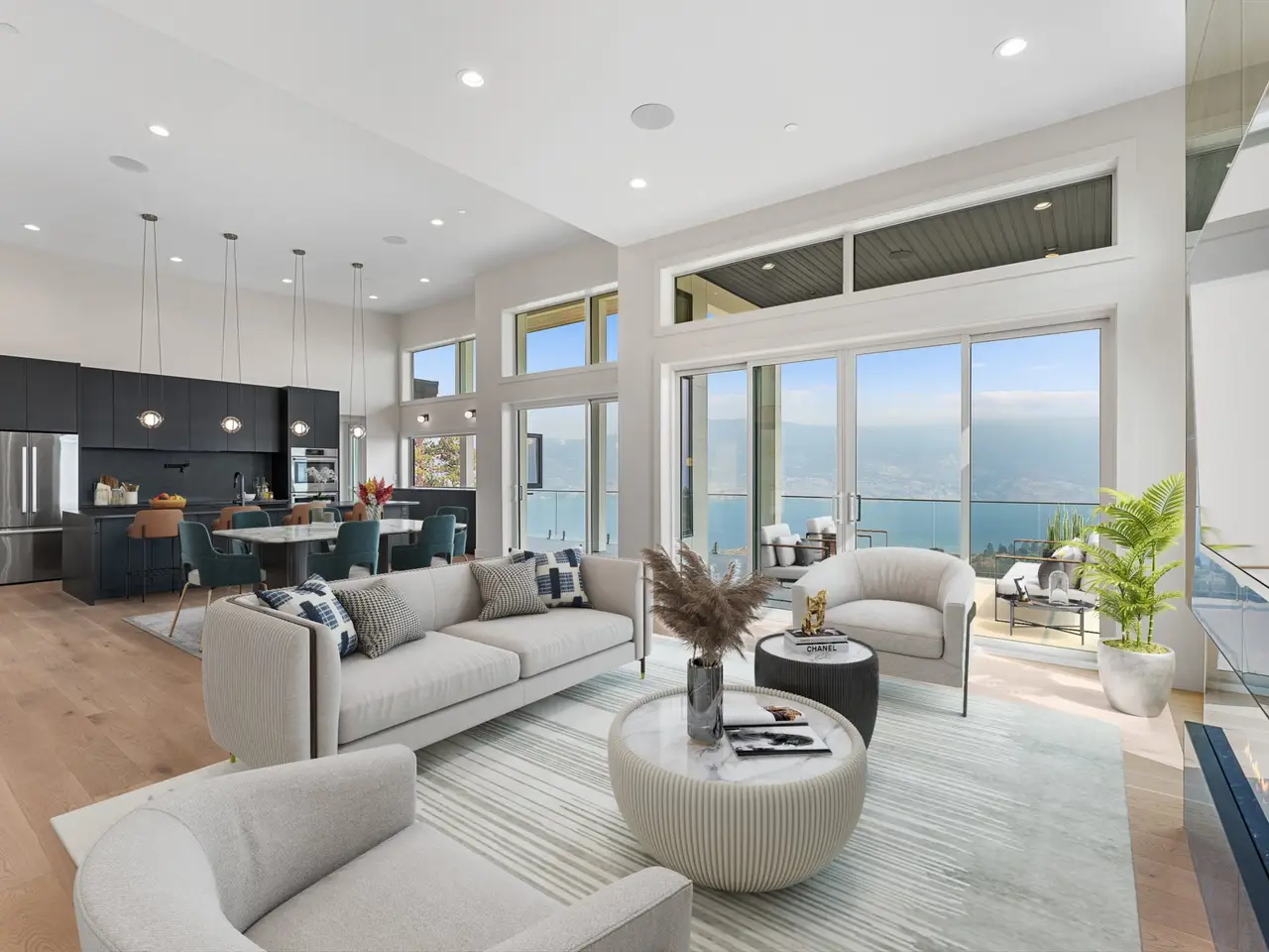 Brand new and net-zero ready, this architectural showpiece by Gelcor is set in Summerland’s coveted Hunters Hill community – an area exempt from the foreign buyer ban. With panoramic 180 degree views of Okanagan Lake, vineyards, & mountains, the home blends design excellence with forward-thinking innovation. Inside, wide-plank oak floors, soaring ceilings, & walls of glass frame the lake beyond. The kitchen is a culinary masterpiece with professional Bosch appliances, granite surfaces, walk in pantry, & a dramatic island with an adjacent pass through that opens to a deck with bar seating & built-in speakers. The main level hosts a dining room, living area with tiled feature wall & fireplace & a serene primary suite with a spa-like, award-nominated, ensuite with heated floors, freestanding tub, & lake views. The lower level extends the lifestyle: a rec room with nano doors to the covered patio, a quartzite waterfall edge wet bar, glass-walled wine cellar, theatre, gym, & guest suites, all capturing lakefront vistas. Lower level flooring is heated excluding the wine room & gym. Outdoors, xeriscape landscaping frames a generous side yard with a pool permit in place. Upgrades include 3-zone indoor/outdoor speaker system, triple-glazed windows, sprinkler system, EV-ready 3-car garage with epoxy floors, & suspended slab construction. A rare opportunity to own a design-forward home that redefines Okanagan living. $20,000 worth of incentives with firm sale before Oct 10. See your realtor for full details. Interior photos are virtually staged.
