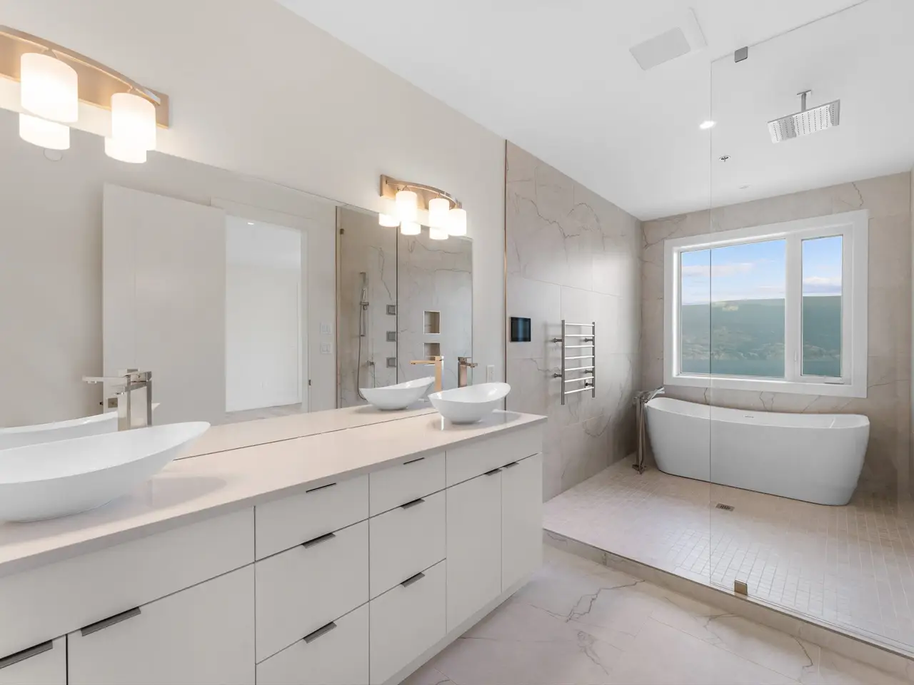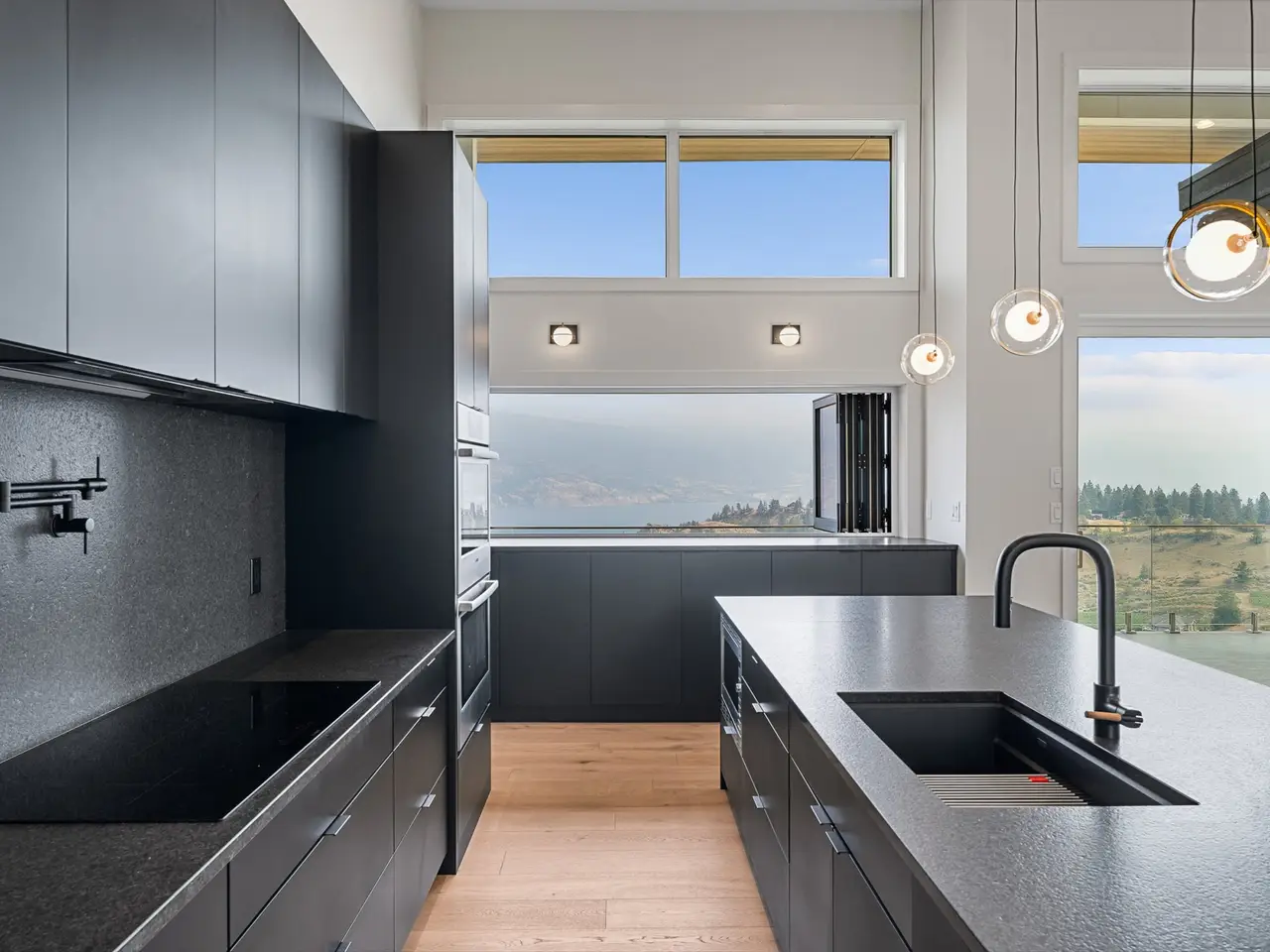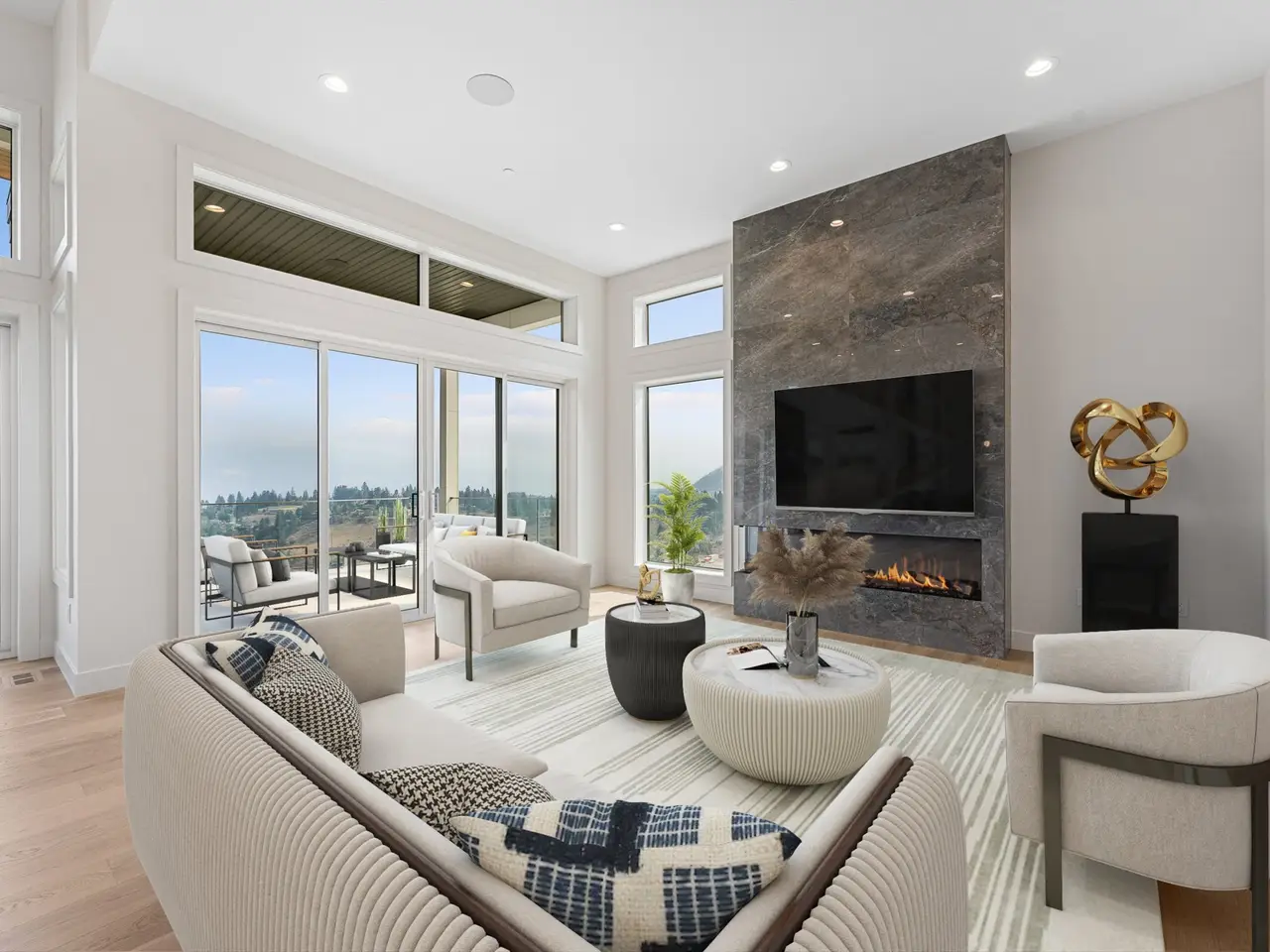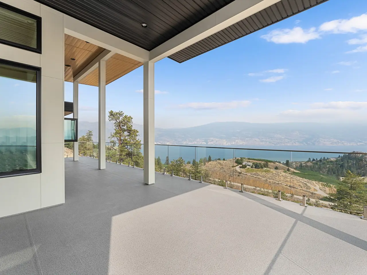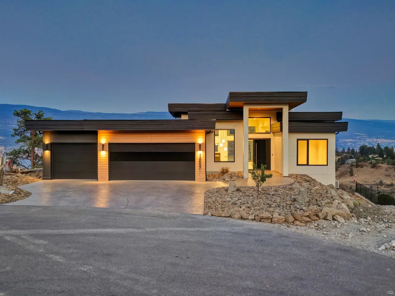 Brand new and net-zero ready, this architectural showpiece by Gelcor is set in Summerland’s coveted Hunters Hill community – an area exempt from the foreign buyer ban. With panoramic 180 degree views of Okanagan Lake, vineyards, & mountains, the home blends design excellence with forward-thinking innovation. Inside, wide-plank oak floors, soaring ceilings, & walls of glass frame the lake beyond. The kitchen is a culinary masterpiece with professional Bosch appliances, granite surfaces, walk in pantry, & a dramatic island with an adjacent pass through that opens to a deck with bar seating & built-in speakers. The main level hosts a dining room, living area with tiled feature wall & fireplace & a serene primary suite with a spa-like, award-nominated, ensuite with heated floors, freestanding tub, & lake views. The lower level extends the lifestyle: a rec room with nano doors to the covered patio, a quartzite waterfall edge wet bar, glass-walled wine cellar, theatre, gym, & guest suites, all capturing lakefront vistas. Lower level flooring is heated excluding the wine room & gym. Outdoors, xeriscape landscaping frames a generous side yard with a pool permit in place. Upgrades include 3-zone indoor/outdoor speaker system, triple-glazed windows, sprinkler system, EV-ready 3-car garage with epoxy floors, & suspended slab construction. A rare opportunity to own a design-forward home that redefines Okanagan living. $20,000 worth of incentives with firm sale before Oct 10. See your realtor for full details. Interior photos are virtually staged.