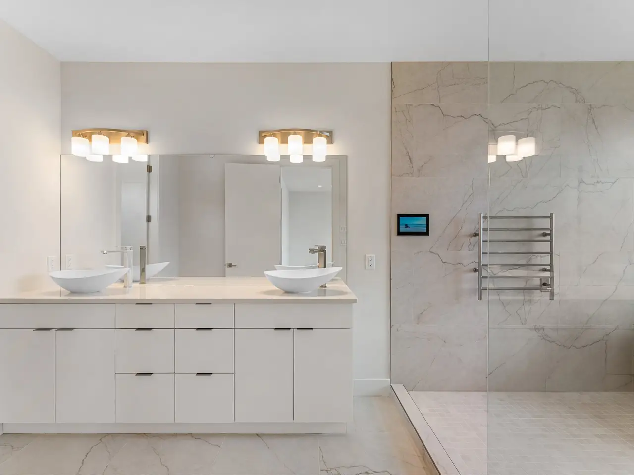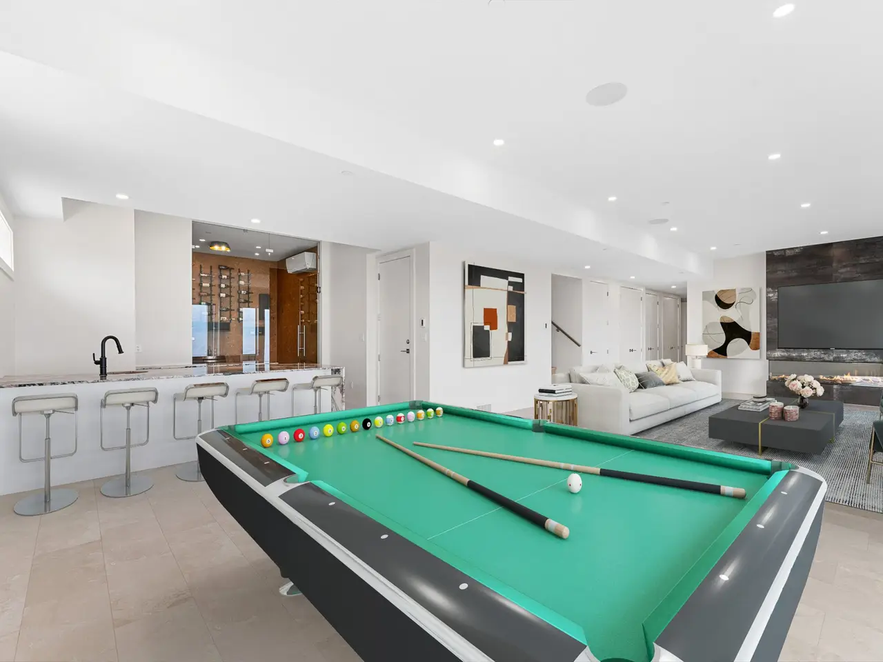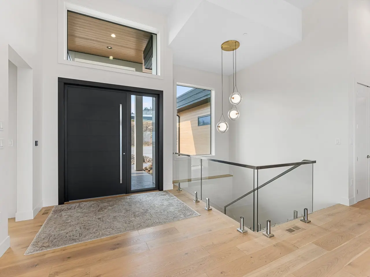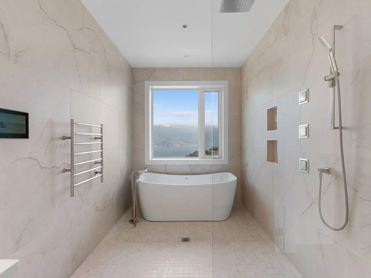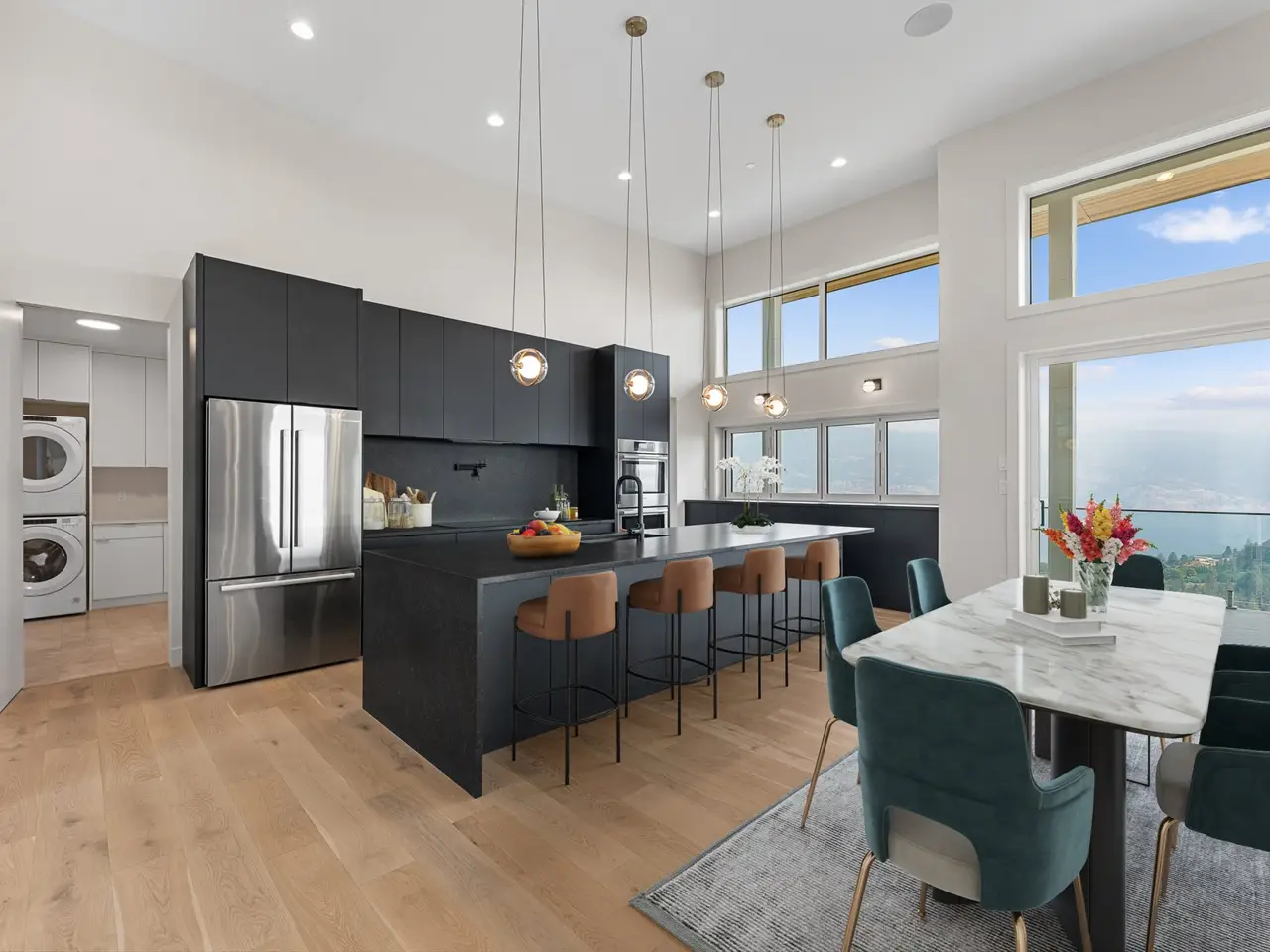 Brand new and net-zero ready, this architectural showpiece by Gelcor is set in Summerland’s coveted Hunters Hill community – an area exempt from the foreign buyer ban. With panoramic 180 degree views of Okanagan Lake, vineyards, & mountains, the home blends design excellence with forward-thinking innovation. Inside, wide-plank oak floors, soaring ceilings, & walls of glass frame the lake beyond. The kitchen is a culinary masterpiece with professional Bosch appliances, granite surfaces, walk in pantry, & a dramatic island with an adjacent pass through that opens to a deck with bar seating & built-in speakers. The main level hosts a dining room, living area with tiled feature wall & fireplace & a serene primary suite with a spa-like, award-nominated, ensuite with heated floors, freestanding tub, & lake views. The lower level extends the lifestyle: a rec room with nano doors to the covered patio, a quartzite waterfall edge wet bar, glass-walled wine cellar, theatre, gym, & guest suites, all capturing lakefront vistas. Lower level flooring is heated excluding the wine room & gym. Outdoors, xeriscape landscaping frames a generous side yard with a pool permit in place. Upgrades include 3-zone indoor/outdoor speaker system, triple-glazed windows, sprinkler system, EV-ready 3-car garage with epoxy floors, & suspended slab construction. A rare opportunity to own a design-forward home that redefines Okanagan living. $20,000 worth of incentives with firm sale before Oct 10. See your realtor for full details. Interior photos are virtually staged.