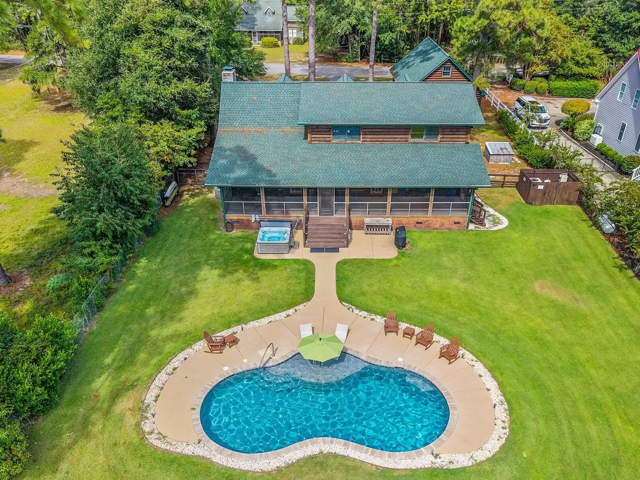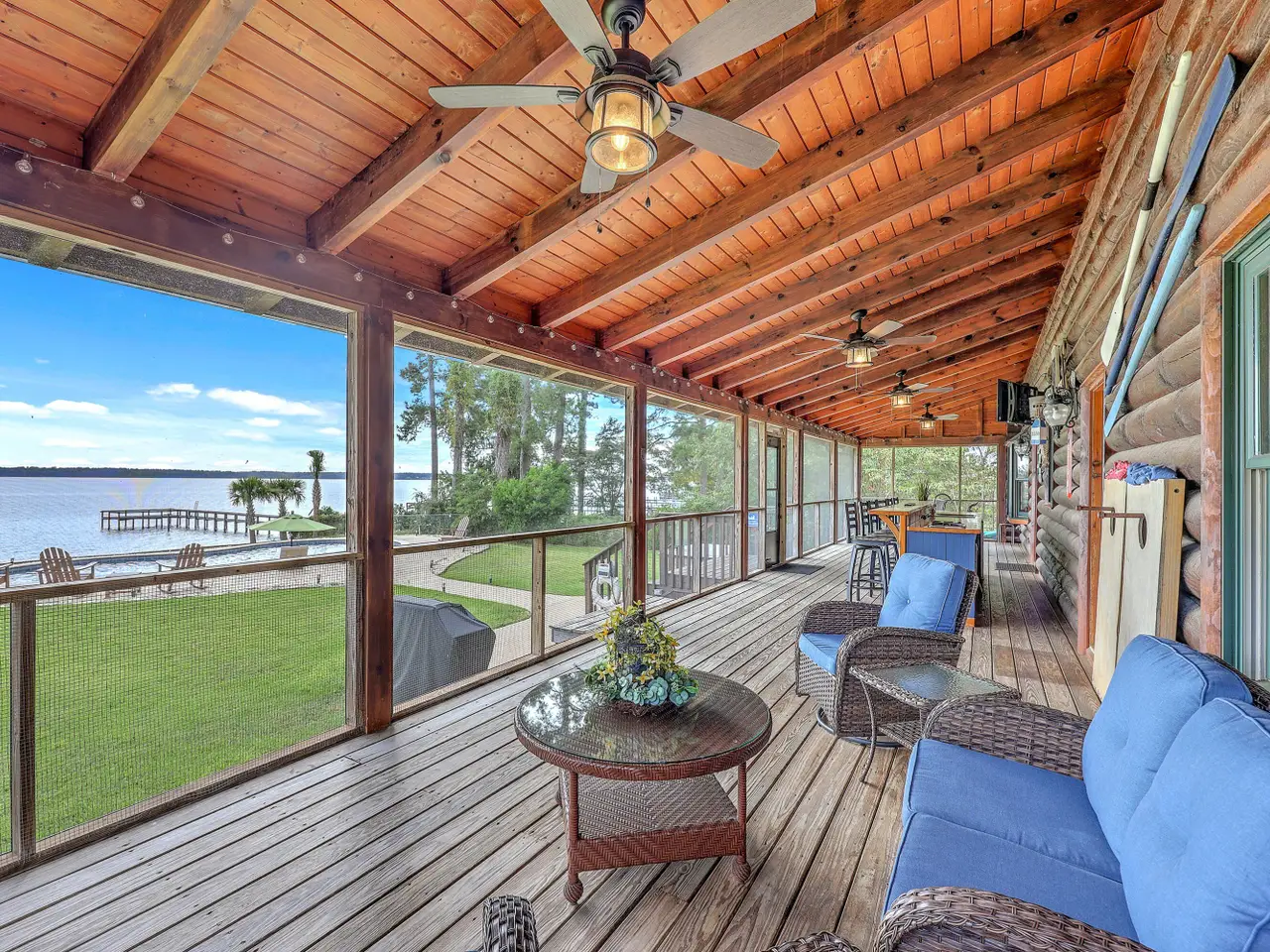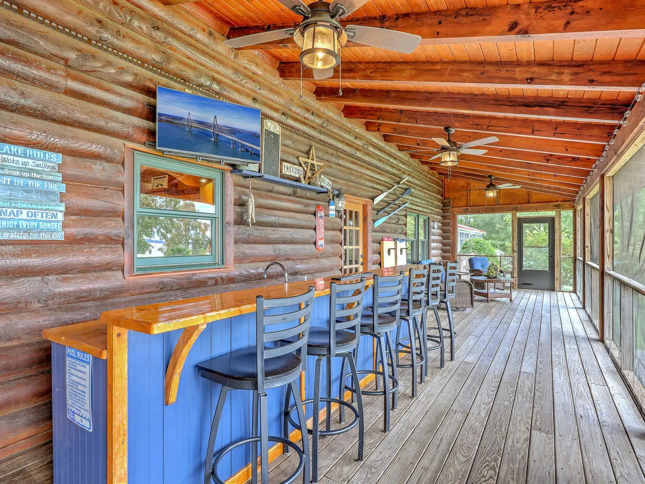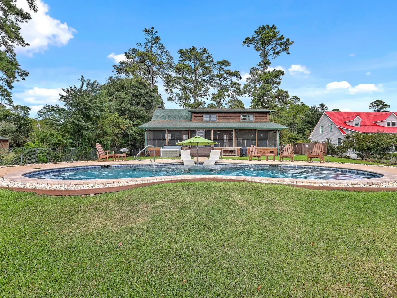Discover a tranquil escape with this custom-built log cabin situated on the serene shores of Lake Marion. This property masterfully combines rustic elegance with modern amenities, offering an ideal opportunity for a second home, primary residence, or a lucrative short-term rental investment.Experience the grandeur of an open-concept living space with soaring ceilings crafted from tongue-and-groove heart pine, centered around a magnificent stone fireplace. The fireplace, enhanced by a reclaimed mantle originating from the 2002 San Juan forest fire, provides the perfect ambiance for cozy evenings. Culinary enthusiasts will delight in the chef's kitchen, which features custom live-edge countertops from Texas, bespoke Cypress and Hickory cabinetry, and premium appliances including an ice maker and wine cooler. The first floor offers two spacious bedrooms and a well-appointed bathroom with dual sinks and granite counters, complemented by a full laundry room for ultimate convenience. Upstairs, a private primary suite awaits, featuring a walk-in closet and an en suite bath with a clawfoot tub, walk-in shower, and dual vanities. Step outside to a screened porch, complete with a custom bar offering seating for eight, a sink, mini-fridge, and gas burner, making it an ideal space for entertaining. The backyard oasis includes a custom Gunite pool, a six-person hot tub, a grilling station, a firepit area, and a private fishing pier perfect for savoring Lake Marion's stunning sunsets. This log cabin is crafted with 9-inch spruce logs using the Swedish coping style, professionally sealed in 2022, ensuring sturdy construction. An oversized 4-car garage, equipped with a full bath, and an unfinished upstairs offers excellent potential for additional living space. Recent upgrades include a 40-year architectural roof, new gutters, a Rinnai tankless water heater, and an efficient 2022 HVAC system. Located on the north shore of Lake Marion, this property is just minutes from I-95, providing convenient access for day trips to Charleston, Myrtle Beach, and Columbia. The area is renowned for its natural beauty and tranquility, making it an appealing retreat for water sports enthusiasts, nature lovers, and those seeking a peaceful lifestyle. Currently operating as a successful short-term rental, this property accommodates up to 14 guests and boasts over 150 five-star reviews, consistently generating well over $100,000 annually. Whether you're looking for a charming home to call your own or an investment property with proven income potential, this Lake Marion cabin offers a perfect blend of appeal and practicality. Contact us to schedule a viewing or for more information about this exceptional property. Disclosure: The ability to operate a short-term rental in this jurisdiction is subject to local laws and regulations, which may change over time. There is no guarantee that the current permissions or allowances for short-term rentals will remain in effect in the future. Prospective buyers are encouraged to conduct their own due diligence regarding the current and future status of short-term rental regulations.