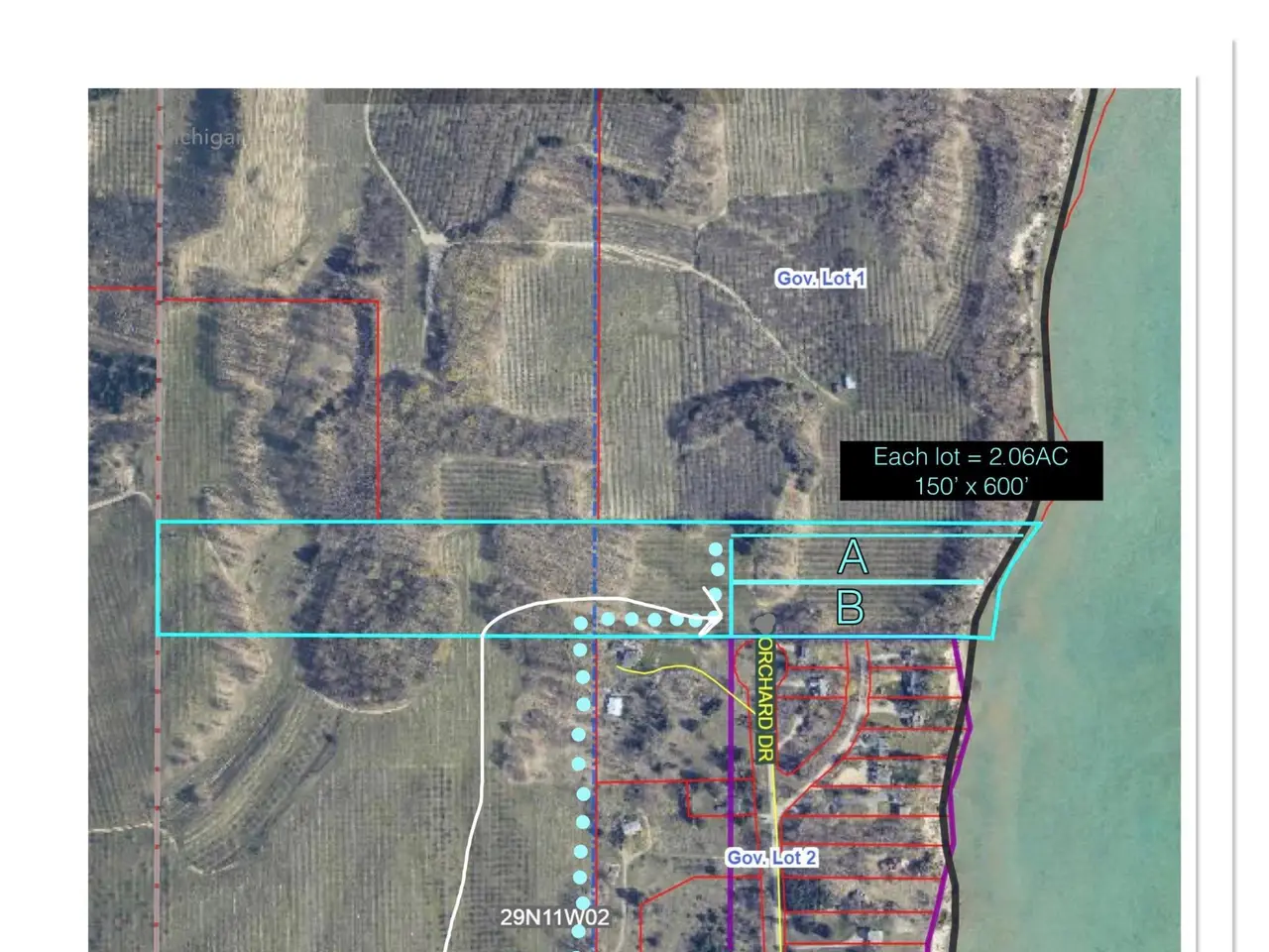 Premium location on the Stony Point peninsula off desirable Lee Point Rd. A long driveway to this private parcel with 300' frontage on West Bay with a path to water from the bluff site. Sunrise views over the Bay and you can even hear the Lee Point Buoy ding. Level building site with 4 acres to build any size home and accessory buildings for your boats/toys/cars/shop. Sellers will clear cherry trees. Sellers met with Robin from EGLE Oct. 15, 2025 = 50' setback from bluff for non permanent structures including a deck added on from house; 85' setback from bluff for permanent structures. This is part of a larger parcel being split off (Owners farm 200+ acres with over 100 acres in conservancy) This property is Not in conservancy. Access directions in associated documents. Use CAUTION; working farm & farm 2-track is best for pick up truck or vehicle w/higher clearance. Sellers clearing and making shared drive/easement to the building sites off Lee Point Rd. See associated docs. Subject to final land division approval (prelim ok)