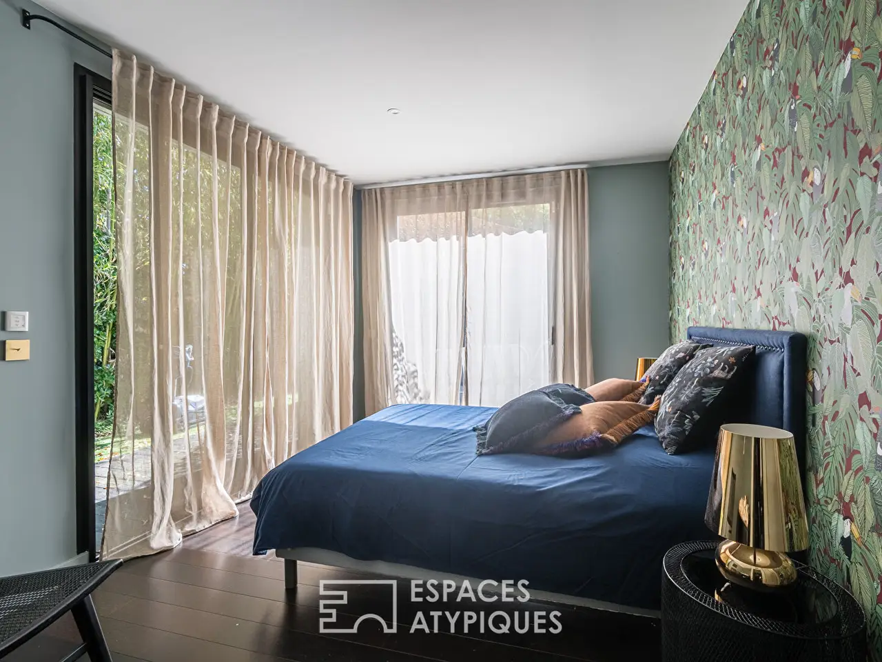 Sheltered from view from the street, the property is accessed via a large garage of over 60 sqm. The entrance, equipped with plenty of storage, opens onto a spacious living room bathed in light thanks to its south-facing exposure. The open kitchen, fully fitted and equipped, blends naturally into the space with its central island and large sliding bay window overlooking the landscaped garden and swimming pool.