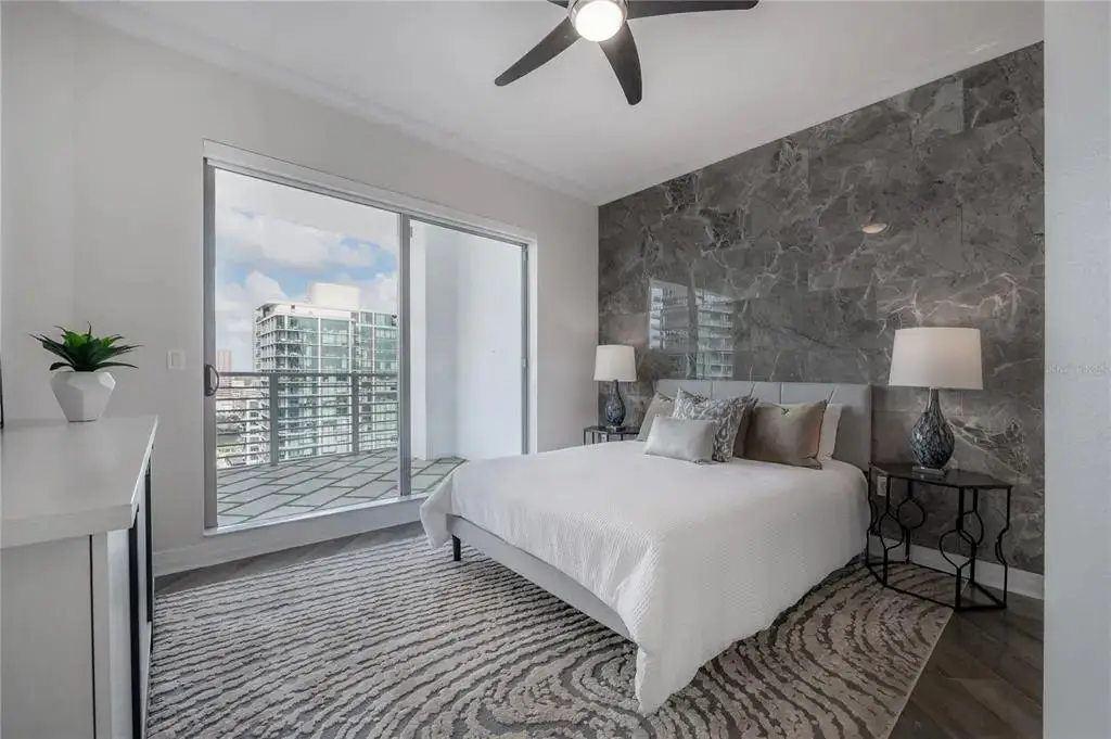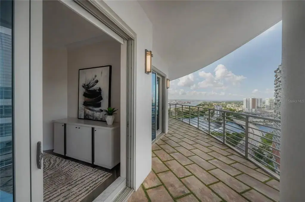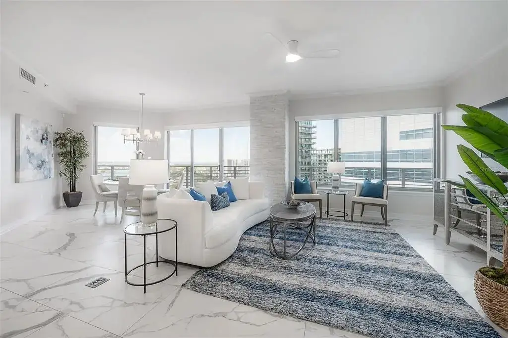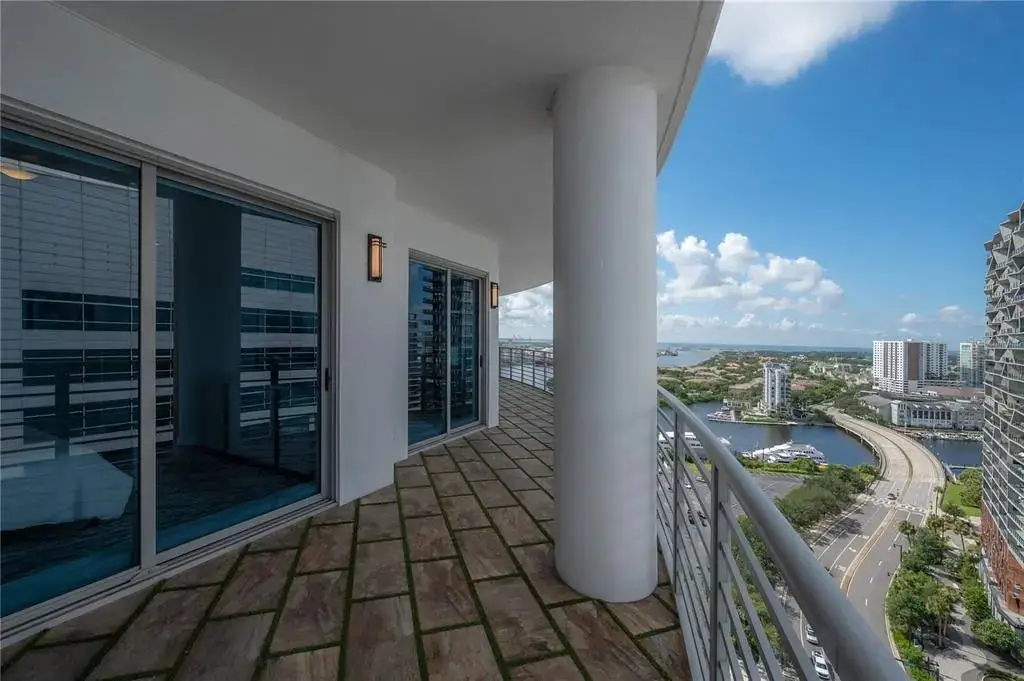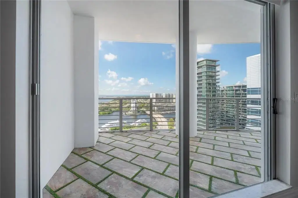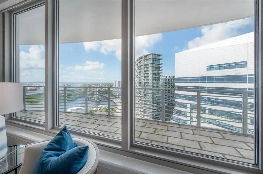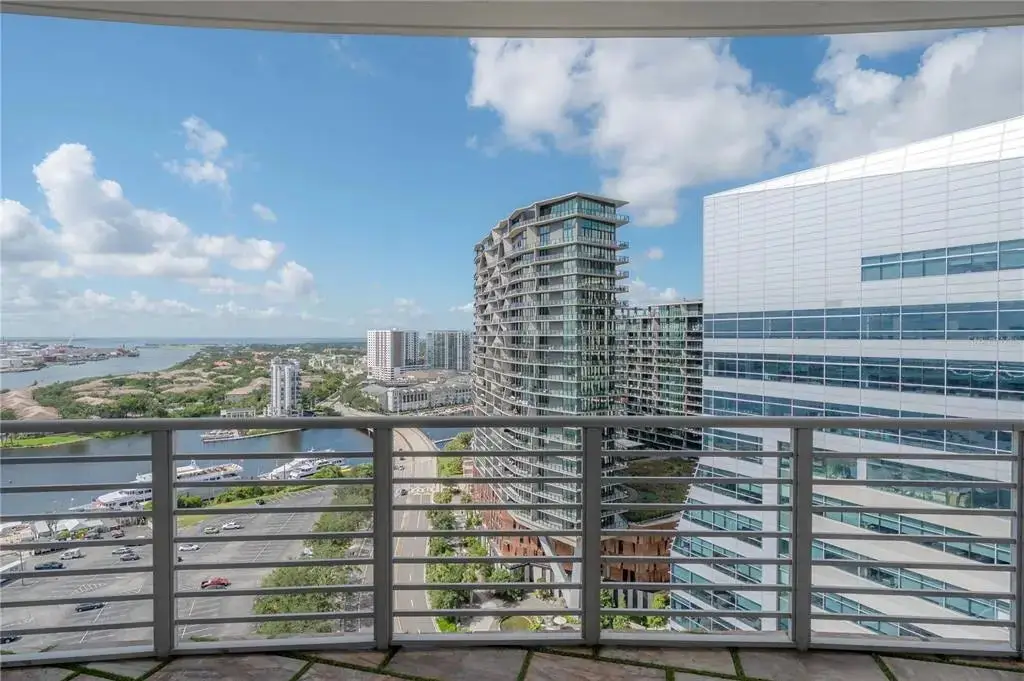 Discover contemporary elegance in this beautifully renovated 20th-floor residence showcasing stunning views of Water Street, Harbor Island, Garrison Channel, and the downtown skyline. Offering 1,733 square feet of open living space, this unit features newer porcelain tile floors throughout, a sleek updated kitchen with marble countertops and white cabinetry, and floor-to-ceiling windows with electric blinds. The luxurious primary suite boasts a modernized ensuite bath with dual sinks, separate tub with a walk-in shower, custom built walk-in closet, and sliding doors to the expansive 1,322 square foot wrap-around terrace, updated with new pavers—perfect for entertaining, enjoying the sunrise or relaxing outdoors. Renovated bathrooms add sophistication throughout. Residents enjoy resort-style amenities including a tropical pool and spa, 24-hour concierge and security, and two rooftop dog walks. This unit comes with two assigned garage parking spaces. Ideally located, with walkable access to Sparkman Wharf, the Tampa Riverwalk, Channelside, top dining, as well as concerts and Lightning hockey at the nearby Benchmark International Arena.