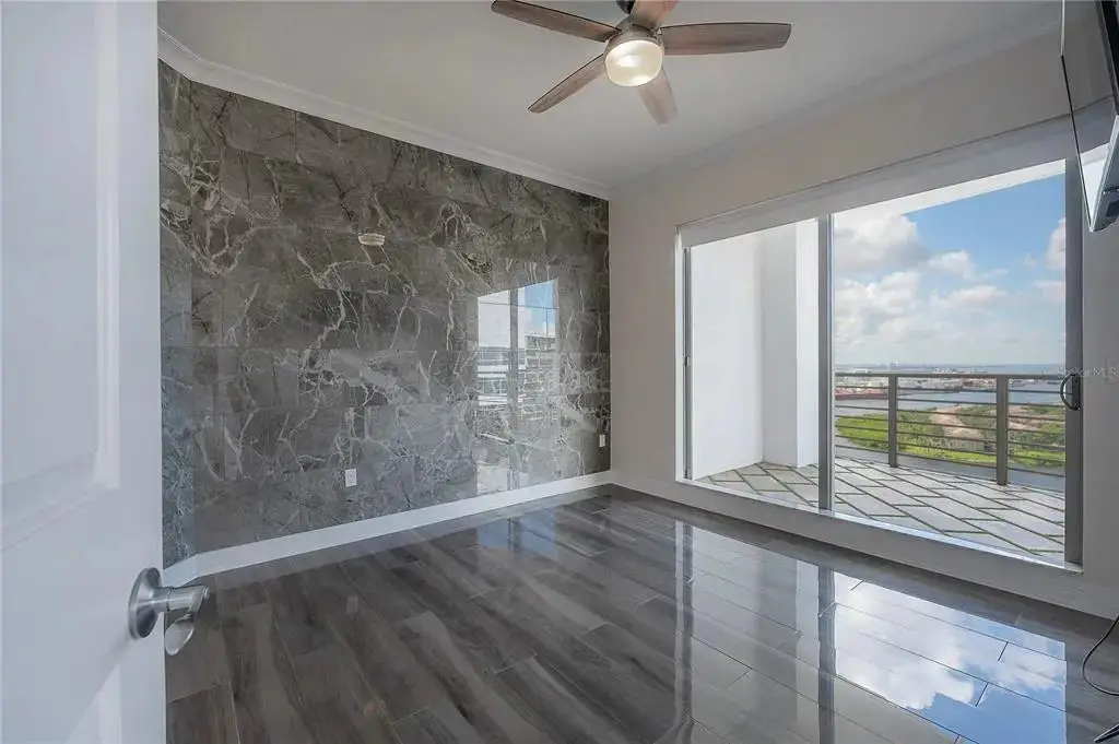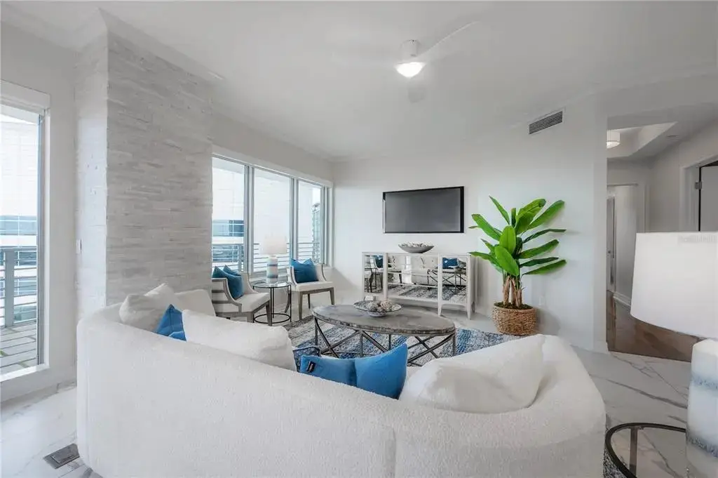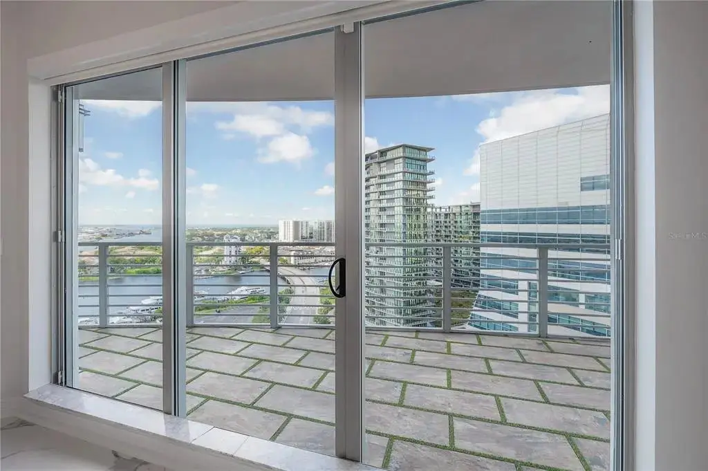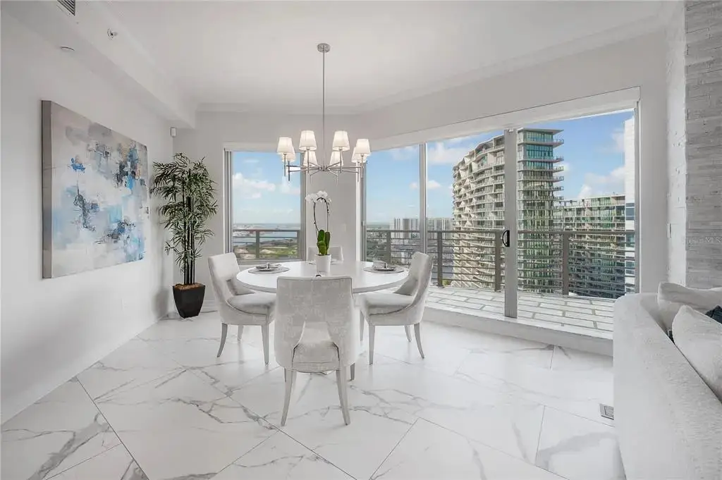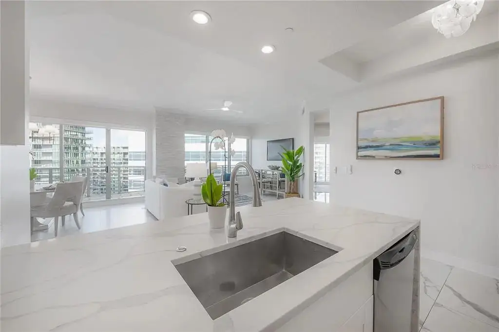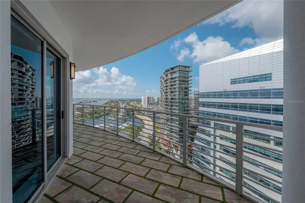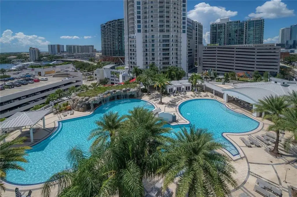 Discover contemporary elegance in this beautifully renovated 20th-floor residence showcasing stunning views of Water Street, Harbor Island, Garrison Channel, and the downtown skyline. Offering 1,733 square feet of open living space, this unit features newer porcelain tile floors throughout, a sleek updated kitchen with marble countertops and white cabinetry, and floor-to-ceiling windows with electric blinds. The luxurious primary suite boasts a modernized ensuite bath with dual sinks, separate tub with a walk-in shower, custom built walk-in closet, and sliding doors to the expansive 1,322 square foot wrap-around terrace, updated with new pavers—perfect for entertaining, enjoying the sunrise or relaxing outdoors. Renovated bathrooms add sophistication throughout. Residents enjoy resort-style amenities including a tropical pool and spa, 24-hour concierge and security, and two rooftop dog walks. This unit comes with two assigned garage parking spaces. Ideally located, with walkable access to Sparkman Wharf, the Tampa Riverwalk, Channelside, top dining, as well as concerts and Lightning hockey at the nearby Benchmark International Arena.