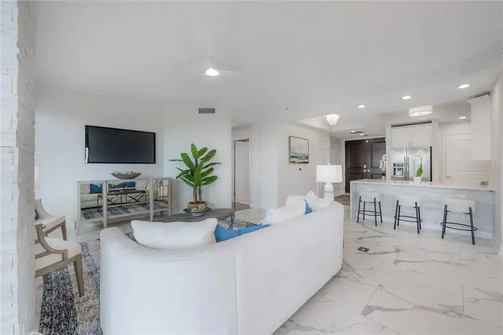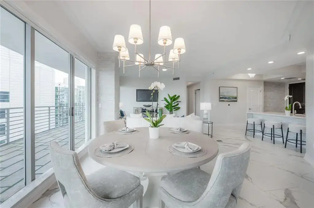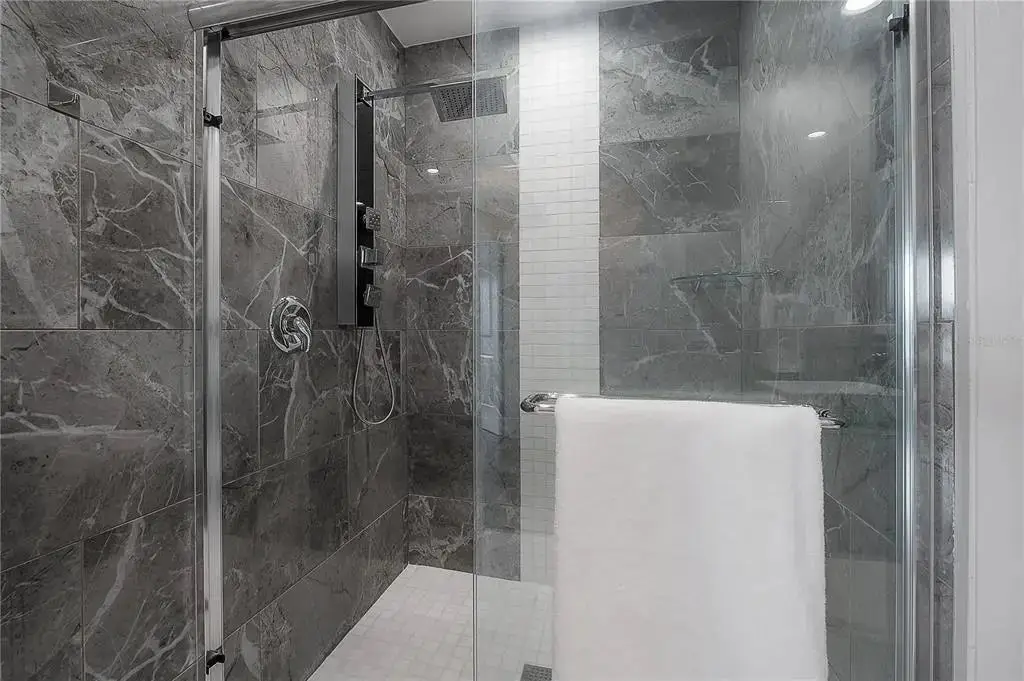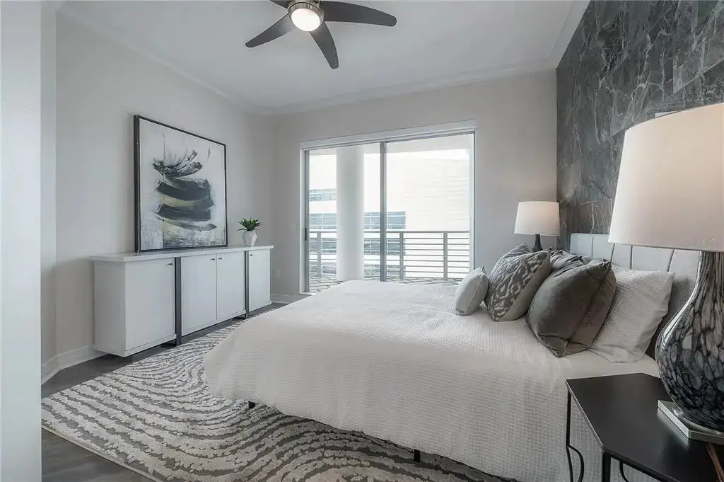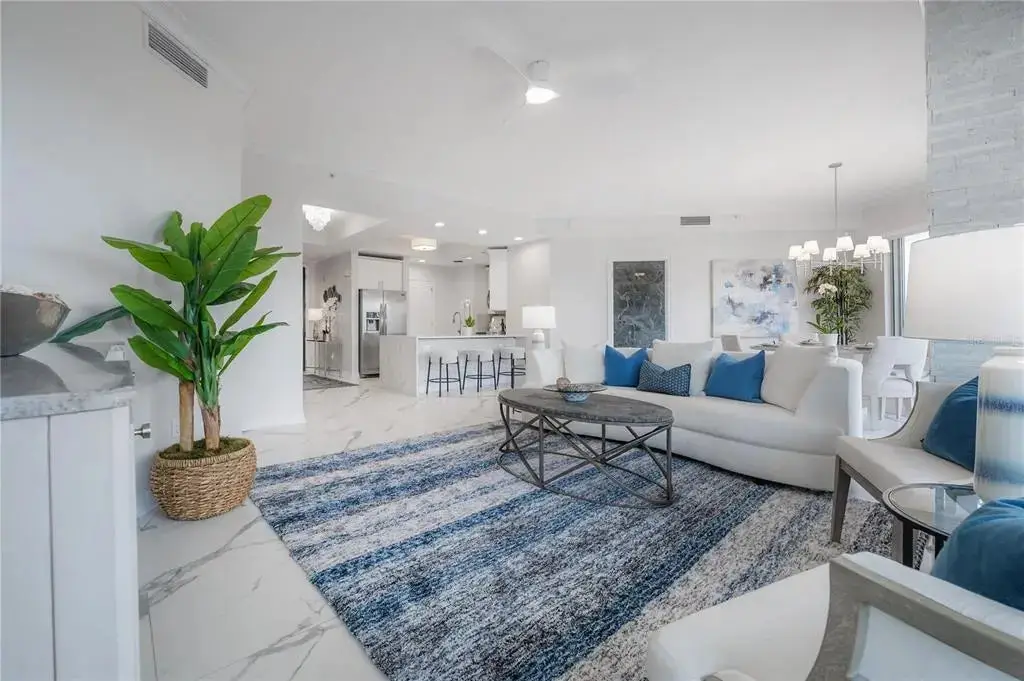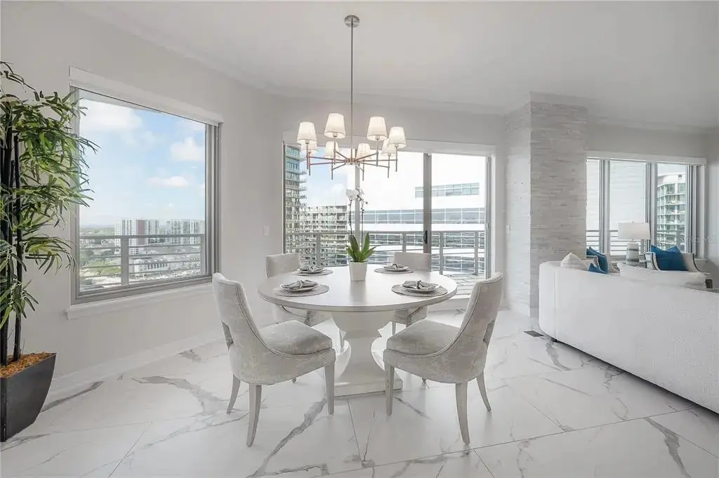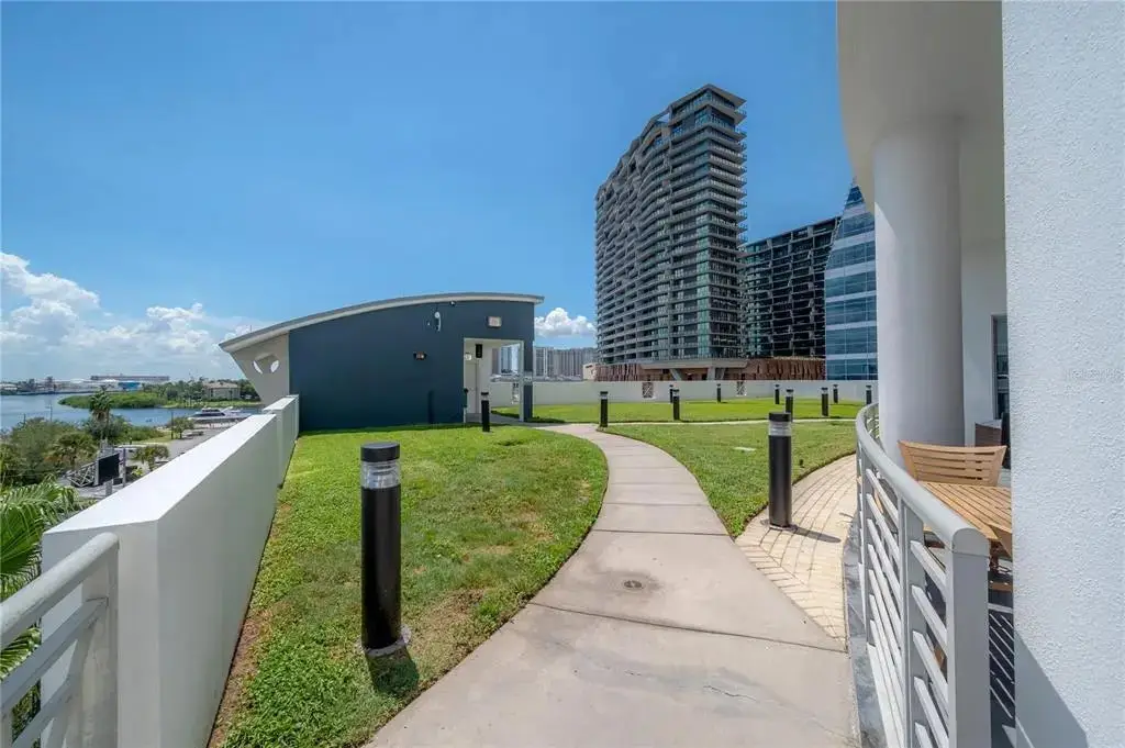 Discover contemporary elegance in this beautifully renovated 20th-floor residence showcasing stunning views of Water Street, Harbor Island, Garrison Channel, and the downtown skyline. Offering 1,733 square feet of open living space, this unit features newer porcelain tile floors throughout, a sleek updated kitchen with marble countertops and white cabinetry, and floor-to-ceiling windows with electric blinds. The luxurious primary suite boasts a modernized ensuite bath with dual sinks, separate tub with a walk-in shower, custom built walk-in closet, and sliding doors to the expansive 1,322 square foot wrap-around terrace, updated with new pavers—perfect for entertaining, enjoying the sunrise or relaxing outdoors. Renovated bathrooms add sophistication throughout. Residents enjoy resort-style amenities including a tropical pool and spa, 24-hour concierge and security, and two rooftop dog walks. This unit comes with two assigned garage parking spaces. Ideally located, with walkable access to Sparkman Wharf, the Tampa Riverwalk, Channelside, top dining, as well as concerts and Lightning hockey at the nearby Benchmark International Arena.