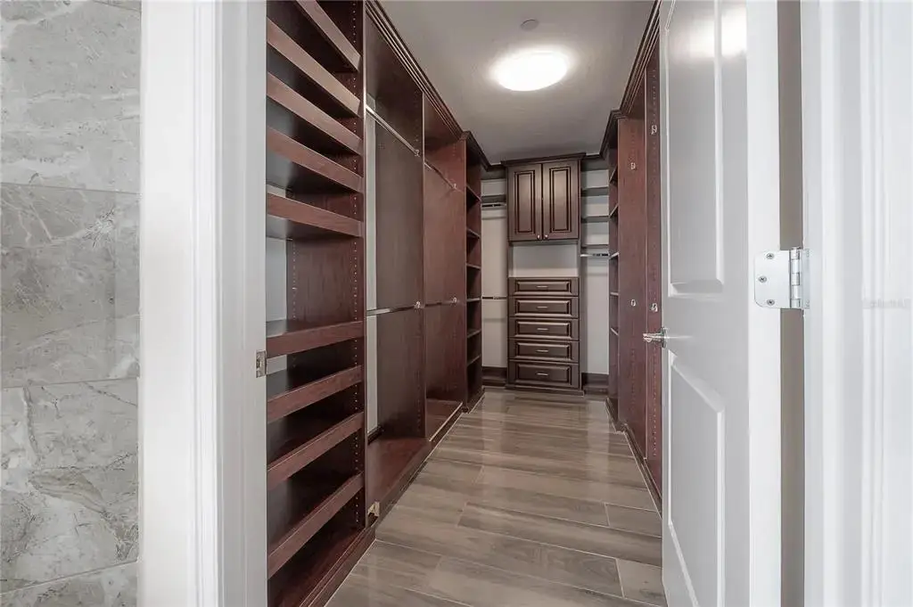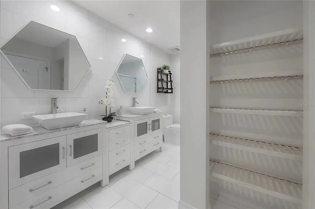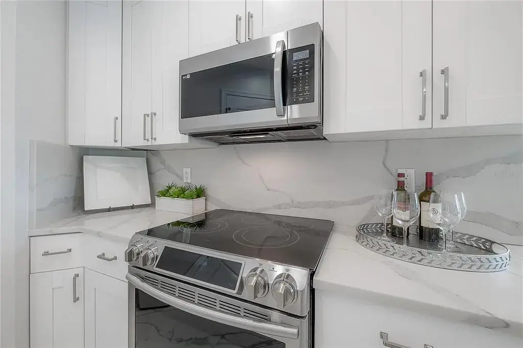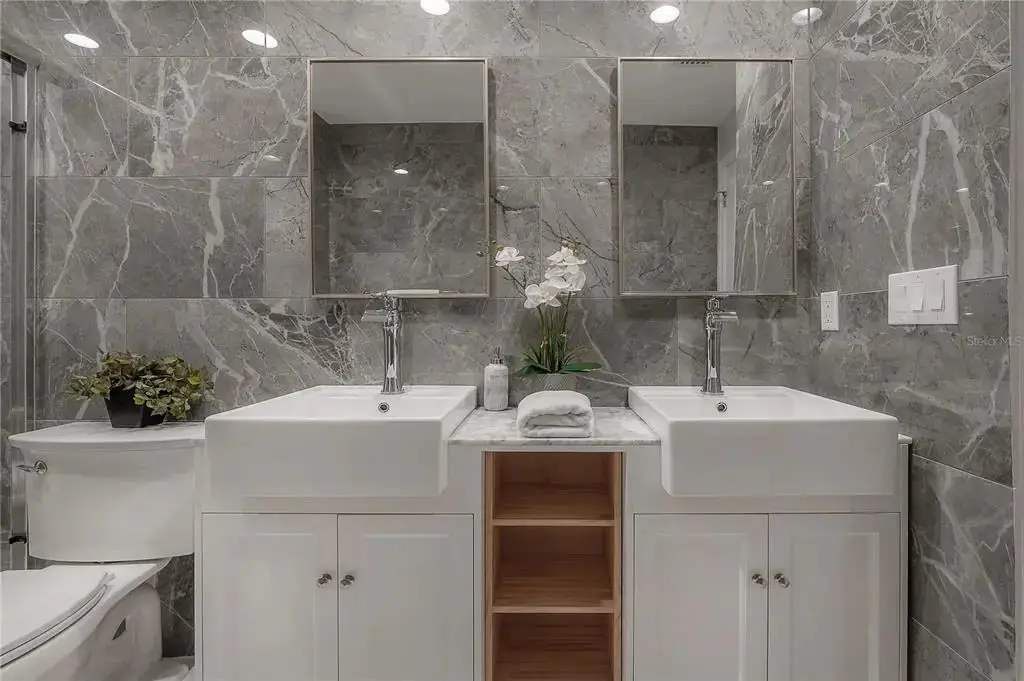 - Marble countertops and white cabinetry