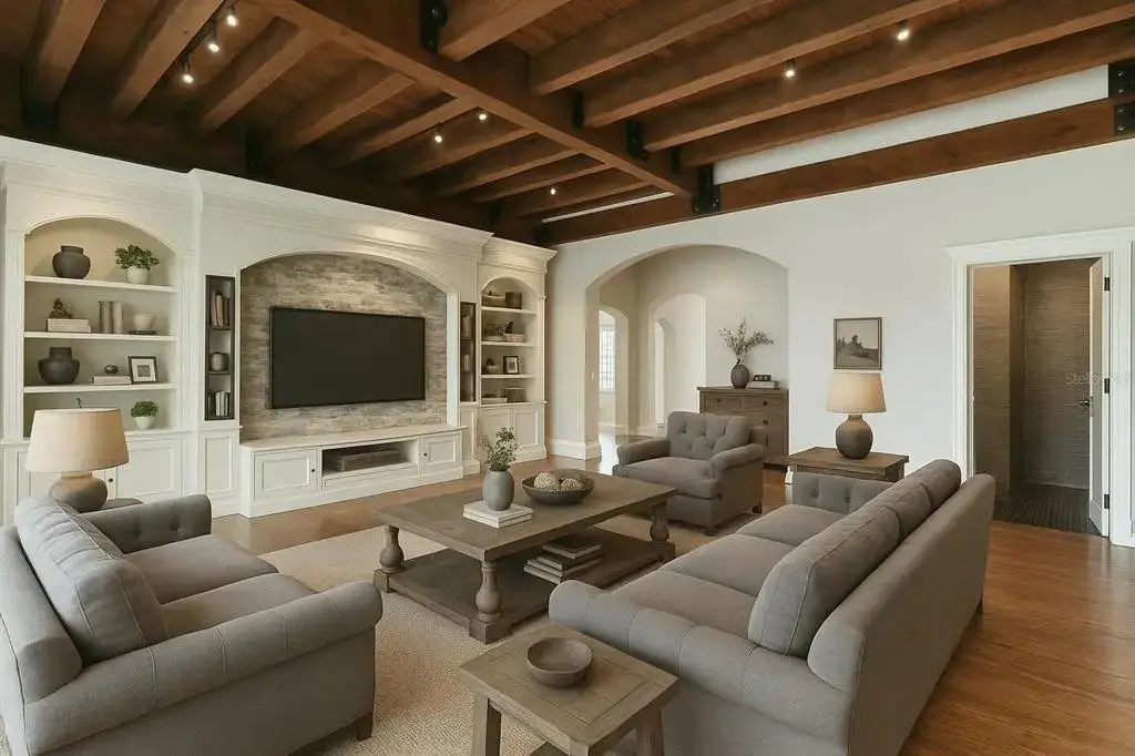 Custom beamed ceilings in living area