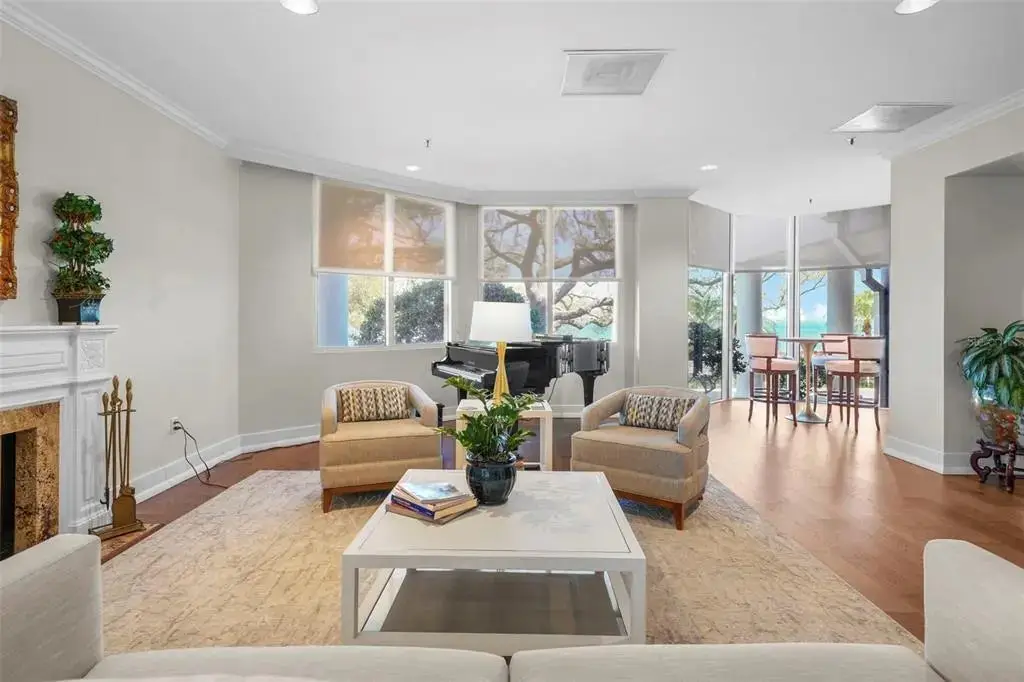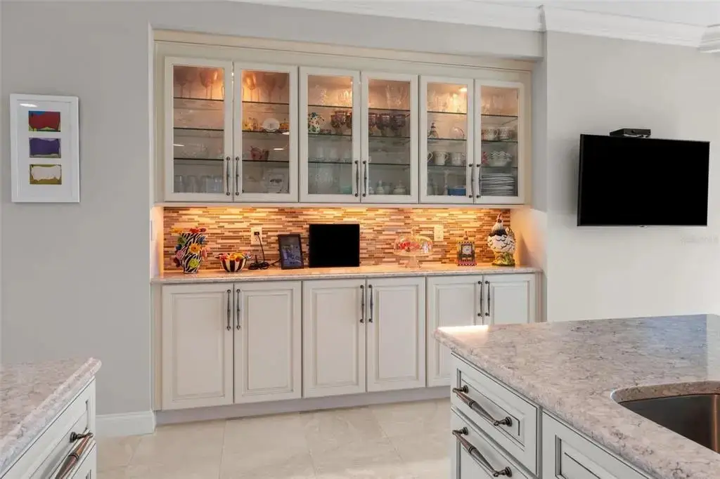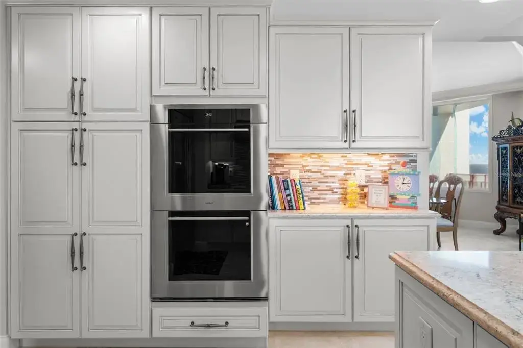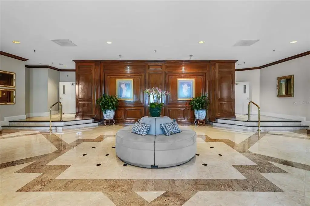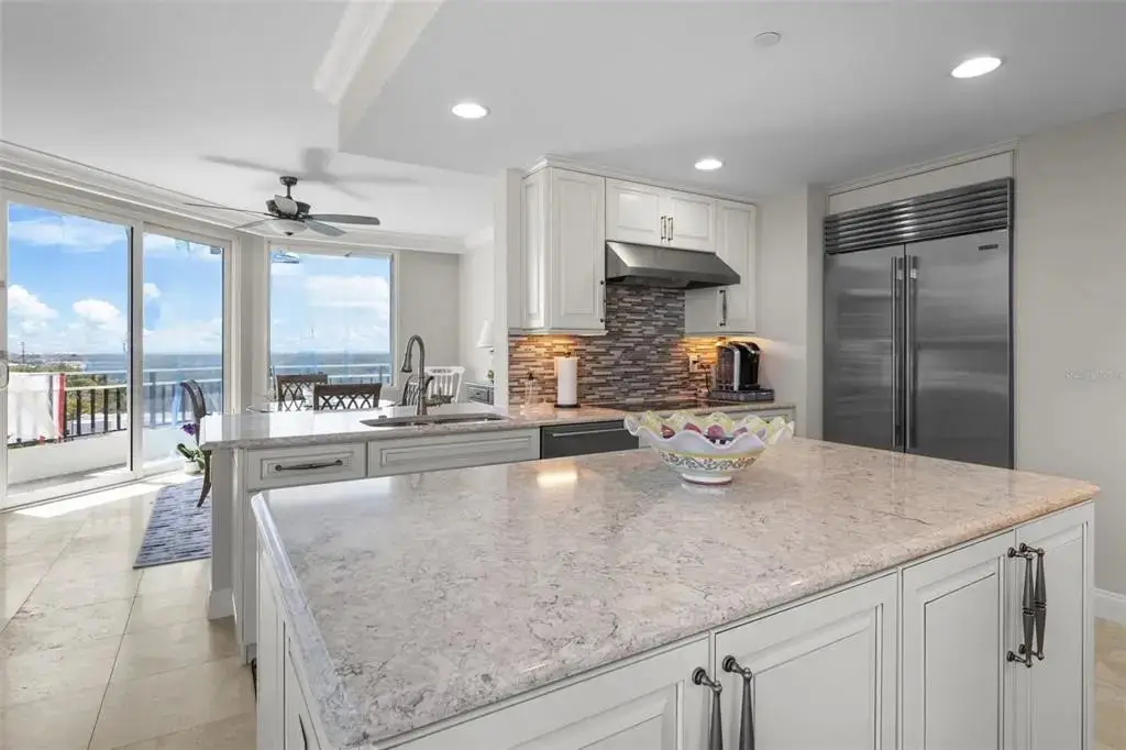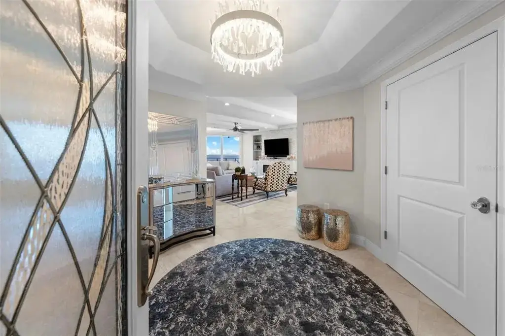 Welcome to the Bayshore Regency, one of Tampa’s most prestigious residences. Completely renovated in 2020, Unit 1401 boasts modern luxury and stunning views. Every detail was carefully considered, from the reconfigured kitchen with custom Kraft Maid cabinetry to the travertine floors throughout. The kitchen features top-of-the-line appliances, including a double-door Sub-Zero refrigerator, Wolf double ovens, and a sleek black glass Wolf electric cooktop. The large island offers ample storage, while a spacious walk-in pantry adds even more convenience. The open concept kitchen flows into the dining and living areas, perfect for entertaining. The bar area, with floor-to-ceiling windows, offers expansive views of Hillsborough Bay and downtown Tampa, with a glass-front Sub-Zero beverage center and ice maker. The living room includes multiple sliding doors, recessed lighting, and a built-in electric fireplace with color-changing flames. The private elevator entrance opens to a stunning foyer with a custom etched glass door and coffered ceiling. The primary bedroom features its own balcony, two walk-in closets with custom storage, and a luxurious marble shower. The second bedroom offers privacy and scenic views, with automatic Hunter Douglas window treatments. With only two condos per floor, enjoy ultimate privacy and breathtaking sunrise views and sunset views.