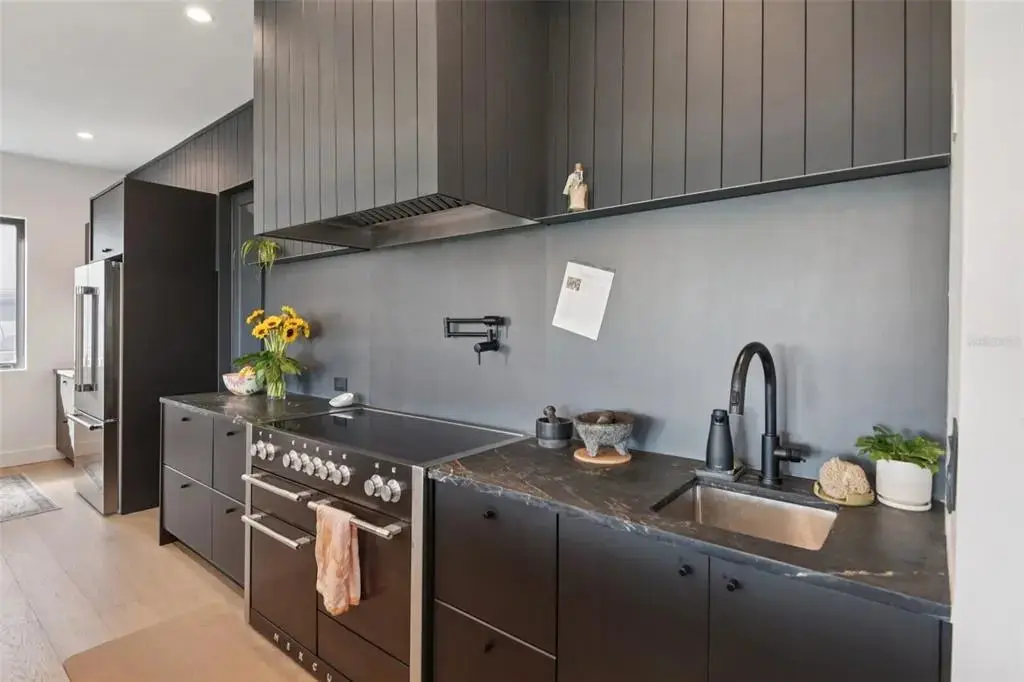 Modern Waterfront Living Meets Exceptional Engineering on Flamingo ////  Completed in 2023, this architecturally inspired 3-story, 4-bedroom / 4-bath waterfront home unites modern design, enduring materials, and fortified construction in one extraordinary residence. Built to stringent standards with 8" (2nd) and 6" (3rd) framing, continuous threaded rods from roof to foundation, and spray-foam insulation in all walls, floors, and ceilings... it offers a level of permanence and efficiency rare in coastal construction. The first level features solid block construction intentionally designed to take in water in the event of a flood, while the upper living levels rise confidently above the snook-filled deep-water canal. /// The main (2nd) floor serves as the heart of the home, where light and volume define a sophisticated open living space surrounded by treetop views and balconies. White oak luxury flooring, expansive glass, and a seamless indoor-outdoor flow create a tranquil "treehouse" ambiance. The custom kitchen is a study in function and form, featuring an AGA Mercury induction range, prep sink, pot filler, deep drawers, walk-in pantry, butler's pantry, beverage and wine refrigeration, and a libation station... crafted for both culinary precision and effortless entertainment. This level also includes one full bedroom and bath, ideal for guests or a home office. /// The top (3rd) floor hosts the private primary suite with its own terrace, along with two additional bedrooms and baths... each framed by natural light, thoughtful design, and a private balcony. /// On the ground level, the solid block foundation includes an oversized two-car garage currently configured for two vehicles but easily adaptable to accommodate four. The extended driveway offers parking for six additional cars. Additional highlights include a 300-amp electric service (no gas), elevator-ready design for first-to-second-floor access, underground utilities, EV charger-ready, security camera system, 60-mil commercial-grade TPO roof, and pre-wired for a modern wood-burning fireplace. The property features a new seawall (2021), deep-water canal access with gorgeous sunset views, and a dock permit ready to go. Located across from the future Isles of Old Tampa Bay... an enclave of 67 multi-million-dollar waterfront residences, 4828 Flamingo represents a rare convergence of architecture, engineering, and artistry... where strength meets serenity, and every detail is designed to endure.