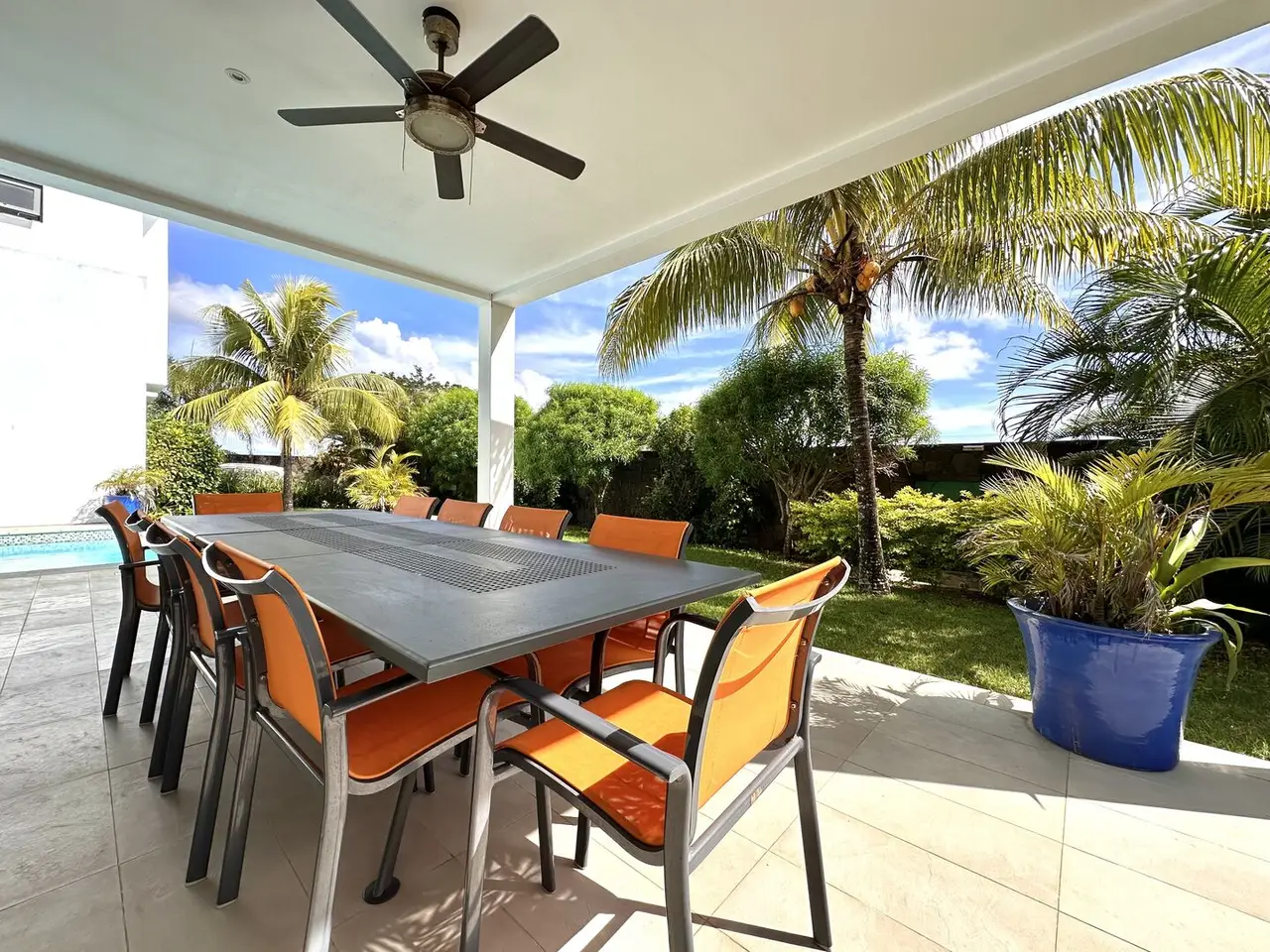 Large veranda overlooking swimming pool