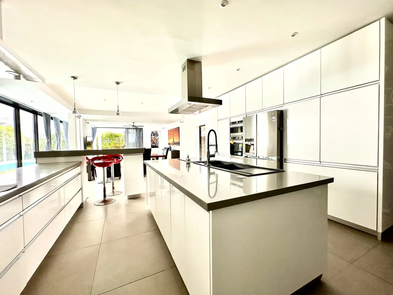 Very well designed, this beautiful home stands out for its high ceilings and its beautiful tiled floor with a natural effect. Ideal for a family, this house offers a large living area - dining room, open kitchen with breakfast area, large veranda, and a large space with pool table. All overlooking onto a beautiful swimming pool ideal to make lengths. Perfect to welcome guests, this house is complete ... to the last details. It is located in a nice well-established garden and it is the only villa has its own separate entrance within the residence.