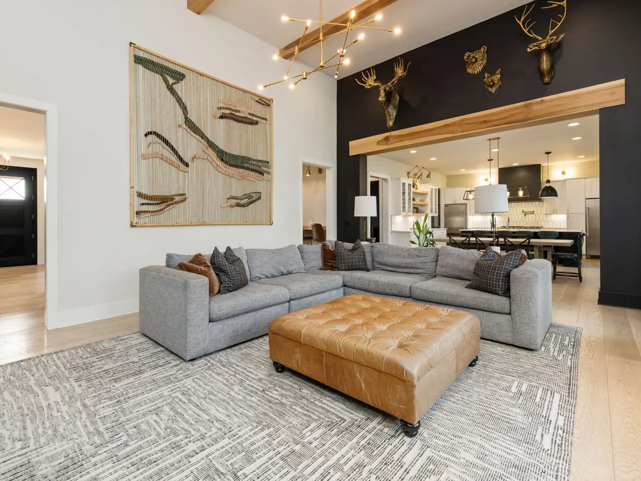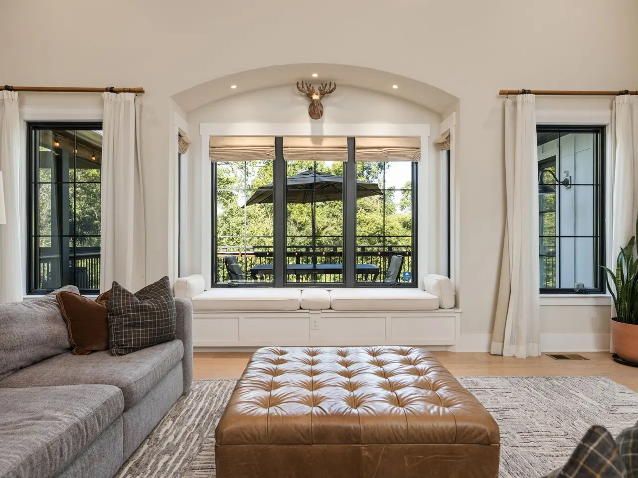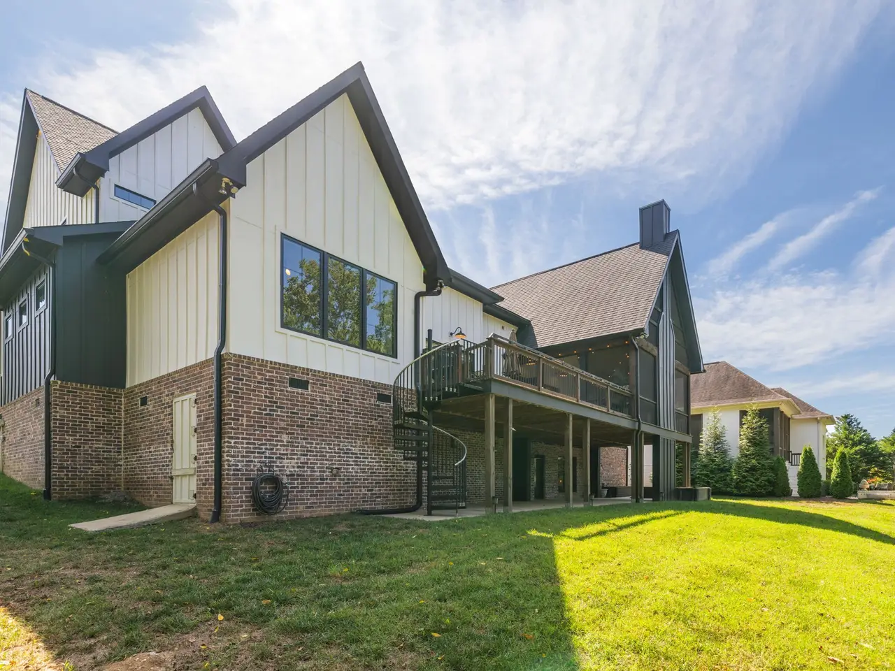 This striking Thompson's Station home blends modern elegance with warm natural accents, featuring a sleek exterior of white, black, brick, and wood finishes. Step inside to a thoughtful floor plan beginning with a moody formal living room--anchored by wainscoting and a statement light fixture--that could also serve as a formal dining space. Across the foyer, a designated office offers custom built-in shelving and cabinetry. The two-story living room impresses with wood-beamed ceilings, a shiplap and tile gas fireplace, and a cozy bay window overlooking the tranquil backyard--the perfect nook for morning coffee, a good book, or evening wine. The kitchen combines function and style with an oversized island, glass-paned cabinetry, open shelving, custom vent hood, top-of-the-line appliances, and a walk-in pantry. A spacious laundry and drop zone with custom cabinetry keeps daily life organized just off the three-car garage, which includes a versatile bay with room for an RV, trailer, or even a partial basketball court. The light-filled main-level primary suite offers a peaceful retreat with a walk-in closet, double vanities, soaking tub, and a floor-to-ceiling tiled shower. Upstairs, enjoy a media room and rec room, while the walk-out basement provides additional living space with a private apartment featuring a full kitchen, bedroom, and bath--ideal for guests. A spiral staircase connects the vaulted, screened-in deck with fireplace to the covered patio below, creating seamless indoor-outdoor living. Additional highlights include abundant unfinished storage space and a serene backyard backing to mature trees and open pasture. Located in the heart of Thompson's Station, this home is minutes from Williamson County schools, scenic parks, walking trails, and the local farmers market, with historic downtown Franklin's shopping and dining just a short drive away.