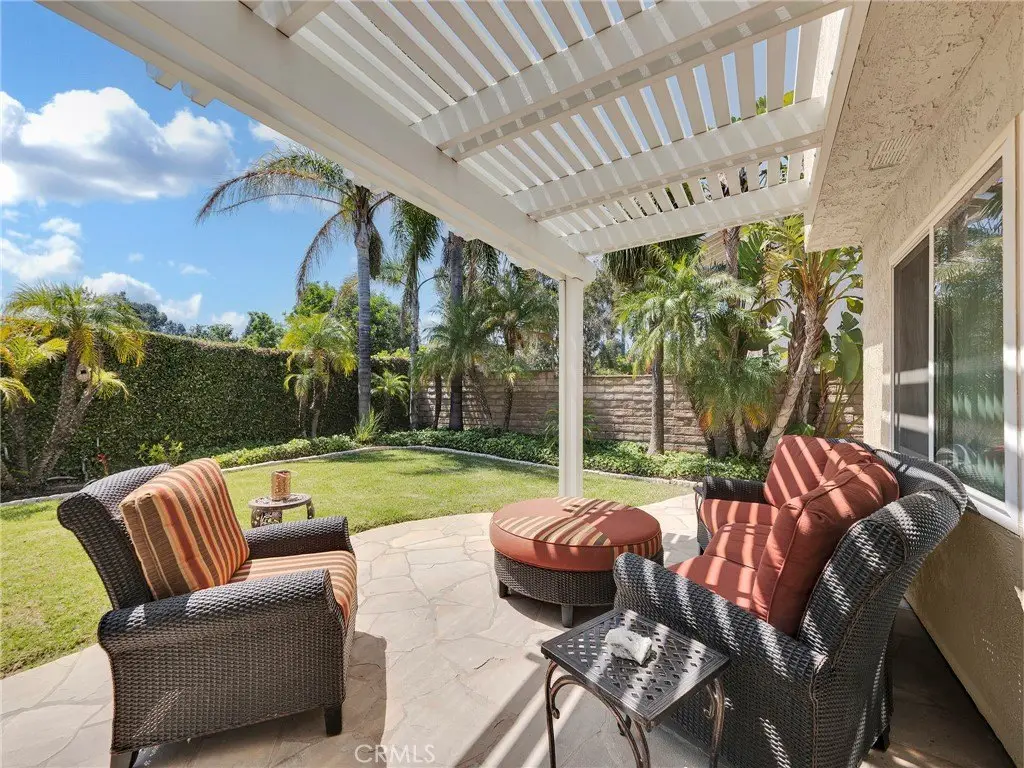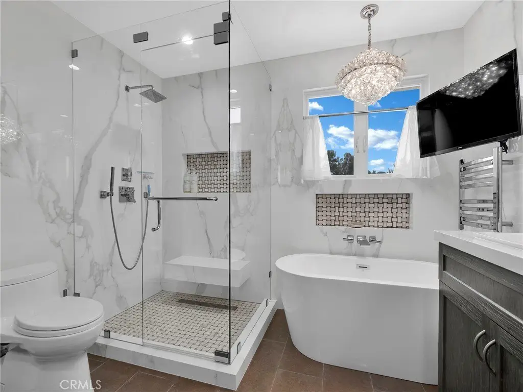 This elegant two-story home blends timeless sophistication with modern upgrades. Energy efficiency meets luxury with a fully paid-for solar system that keeps annual electric costs under $50. Featuring 4 bedrooms, 3 remodeled bathrooms, and a three-car garage, this residence is thoughtfully designed for both everyday comfort and stylish living. Enter through a charming courtyard entry into an inviting living and dining space adorned with travertine flooring. The heart of the home is the chef’s kitchen, showcasing a large center island, custom cabinetry, granite countertops, and a spacious walk-in pantry—ideal for entertaining. The open-concept family room is filled with natural light and includes a built-in flat screen TV. French doors lead to a private backyard oasis, complete with a built-in BBQ, custom patio cover, and room for a pool—perfect for summer fun and outdoor gatherings. Upstairs, retreat to the luxurious primary suite, where a 2022 remodel transformed the bathroom into a true spa experience. Highlights include soapstone floors, porcelain walls and counters, custom cabinetry, double sinks, freestanding soaking tub, oversized walk-in shower, designer fixtures, towel warmer, and an expansive walk-in closet. Two additional upstairs bedrooms share another beautifully remodeled full bath, while a main-level bedroom and bathroom (remodeled in 2022) offer a flexible space perfect for a home office, guest suite, or multigenerational living.
