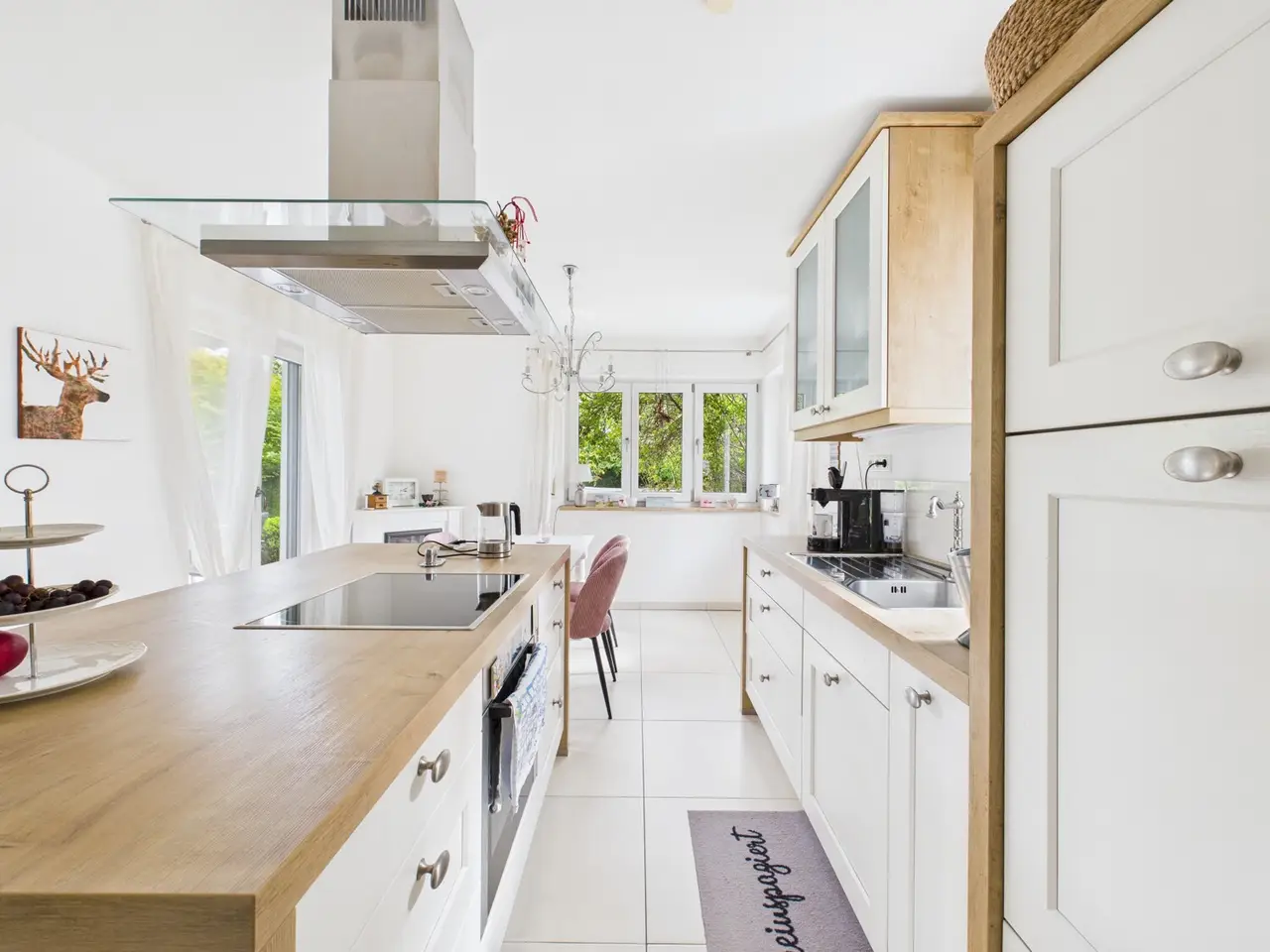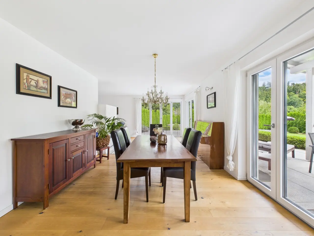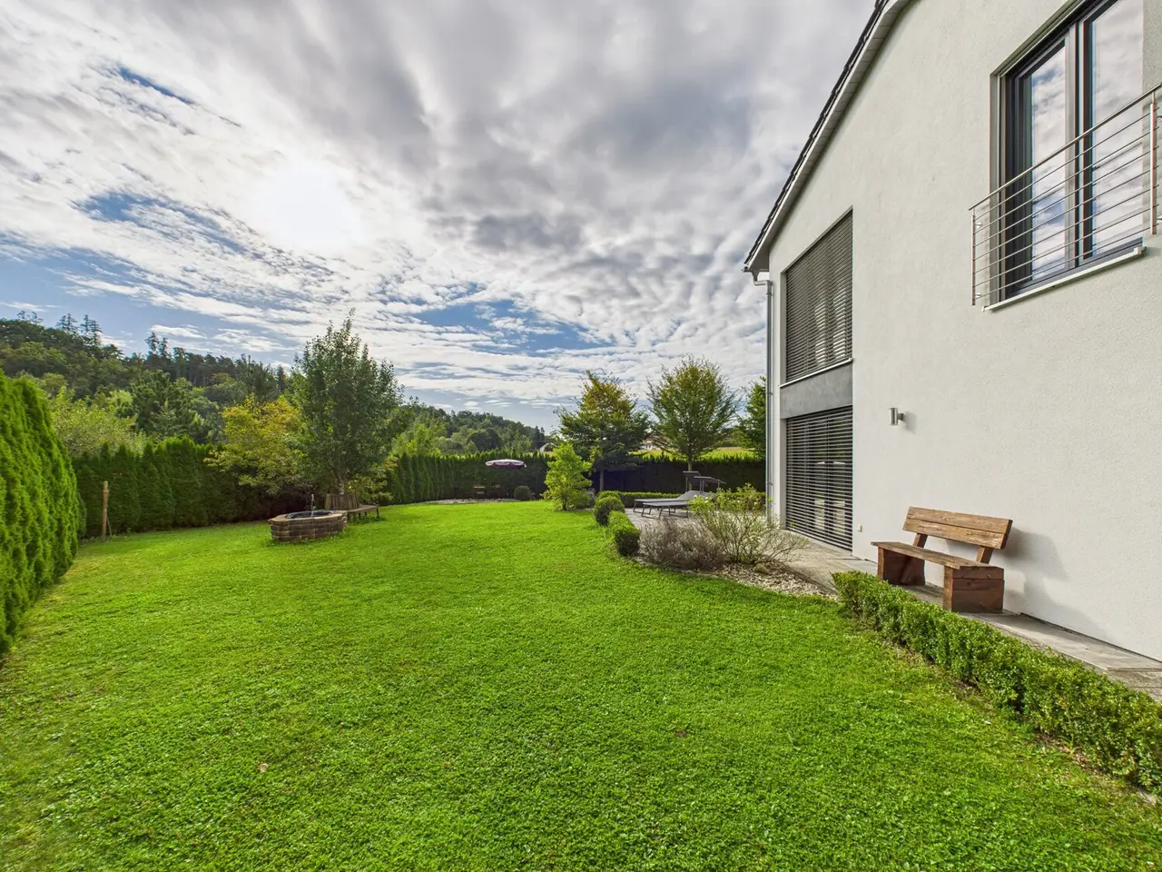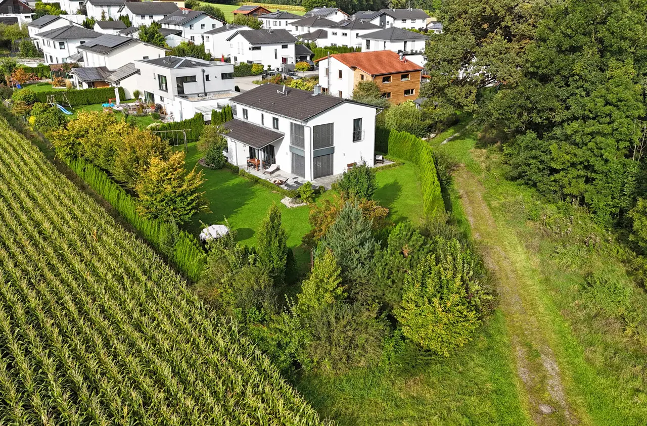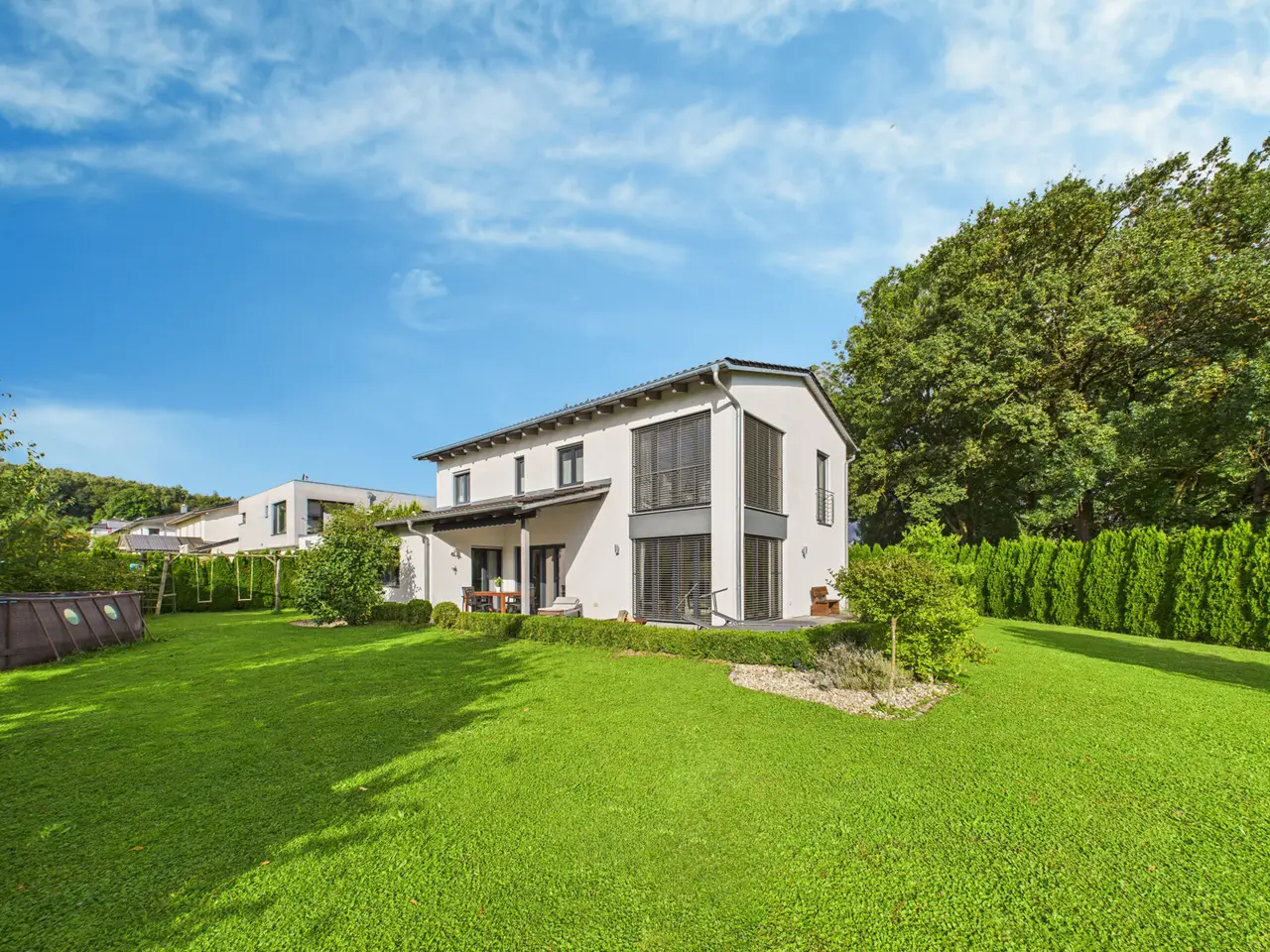 This exceptional architect-designed house from 2013 in Tiefenbach combines timeless elegance, modern architecture and a location that is second to none. On a living space of around 175 m² and a generous plot of 905 m², a living concept unfolds that is both well thought-out and prestigious. You can feel the special atmosphere as soon as you enter: clear lines, an exceptionally successful room layout and light-flooded rooms, which are enhanced by high-quality oak parquet and elegant tiled floors. Generous window fronts open up the view into the park-like, secluded garden, which offers absolute privacy and an unobstructed view - a green oasis that borders directly on a beautiful nature reserve. Centuries-old oak trees characterize the panorama, which you can enjoy from both the living room and the bedroom. Three sun terraces invite you to linger at any time of day. Whether it's breakfast in the first morning light, a sundowner on the roof terrace with fantastic sunsets or a relaxing end to the evening in the covered outdoor seating area - you'll find your favorite spot here at any time of year. The open-plan living and dining area with stylish panoramic fireplace creates an ambience that perfectly combines comfort and spaciousness. A high-quality wellness area with an exclusive bio steam sauna awaits you in the basement - the ideal retreat for relaxing hours. The comfortably converted basement rooms with underfloor heating also offer additional space that goes far beyond mere utility rooms. The technical equipment is modern and sustainable: an efficient air-to-water heat pump, triple-glazed isoglass windows, underfloor heating, a double garage and two outdoor parking spaces round off the overall picture. A property for people who are looking for something special - timeless, high-quality, unique.