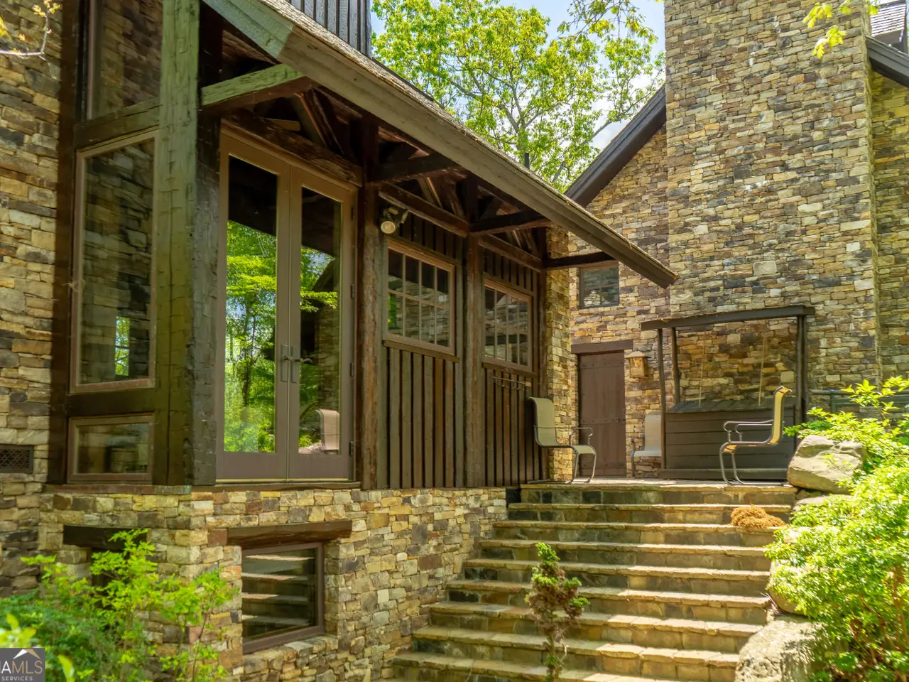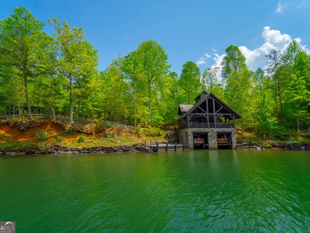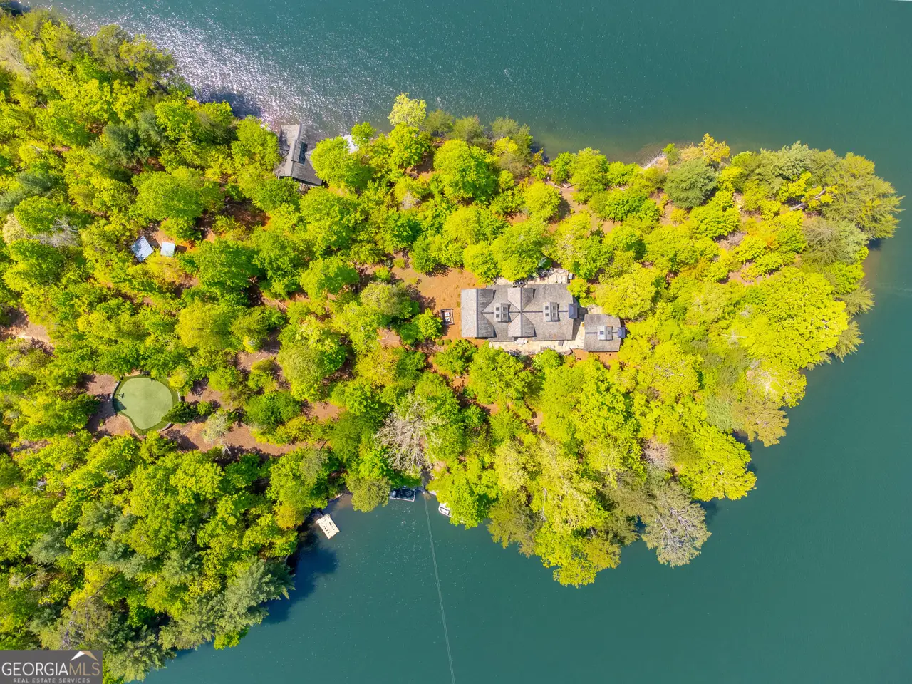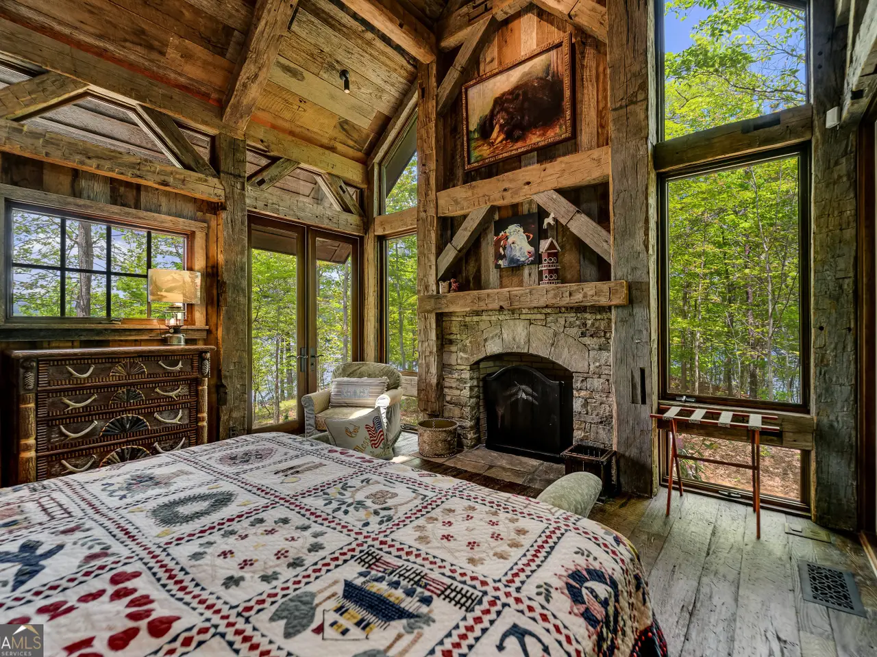 Once-in-a-Lifetime Private Island Estate on Lake Burton Discover the pinnacle of lakeside luxury with this extraordinary 6,186 sqft mountain lodge, perched on its own private island in the heart of Lake Burton's coveted big basin. Offering 360- degree lake and mountain views, total privacy, and Yellowstone-inspired rustic elegance, this one-of-a-kind estate redefines waterfront living. Crafted from reclaimed timbers sourced from Southern cotton mills, the residence exudes old-world craftsmanship and frontier charm. Hand-hewn oak siding with classic chinking, dry stack Tennessee fieldstone, rough-sawn wide plank oak floors, and steel structural supports anchor the home with strength and character. An elegant entry foyer welcomes you from two directions, showcasing east and west views through an open riser staircase with reclaimed treads and flagstone flooring. The soaring great room features lake views from 2 walls, a dramatic cupola, flanking fireplace posts reclaimed from Zachary Taylor Scott's historic home, and a moose antler chandelier complete with a buckshot hole. The chef's kitchen blends style and substance with black soapstone countertops, custom barn wood cabinetry, Viking 6-burner range, dual Bosch dishwashers, refrigerator drawers, custom soapstone sinks and two pantries. The private owner's suite features 3 walls of lake views, a barn wood clad vaulted ceiling and stone fireplace. Each guest bedroom offers unique views and details. The main floor provides 2 guest bedrooms, each with chinked log walls and a private bath. Upstairs, a clever bunk room offers access from 2 separate hallways with a full bath on each end. A large hidden pocket door opens to separate the space into 2 separate bunkrooms when desired. A library with a vaulted ceiling and lake views is currently styled as another guest bedroom upstairs. The terrace level offers a spacious yet cozy media room with a wall of bunk beds against the back wall, a kitchenette with a full fridge/freezer combo, range, sink and dishwasher and laundry room with sink. The gym was designed to mirror the upstairs bunk room, featuring full bathrooms on each end. This space could easily be converted into 2 separate guest bedrooms with the addition of a wall. Outdoors, expansive flagstone patios wrap the home offering views from all directions. Meandering trails of recycled tire wrap the Island, leading to the east wharf and swim dock, putting green, and west side 2-story, 2-stall covered boathouse overlooking one of the most epic sunset views on Lake Burton. Additional Details include: self-contained fire suppression system, copper-clad Kolbe windows, antique terracotta tile, LiteTouch lighting system, extensive security system, 1GB Fiber Optic Internet, slate roof, lightning rods, Generator, central vac. Proof of Funds required before showing. There are security surveillance cameras throughout the island. Do not attempt to access the property without listing agent being present.