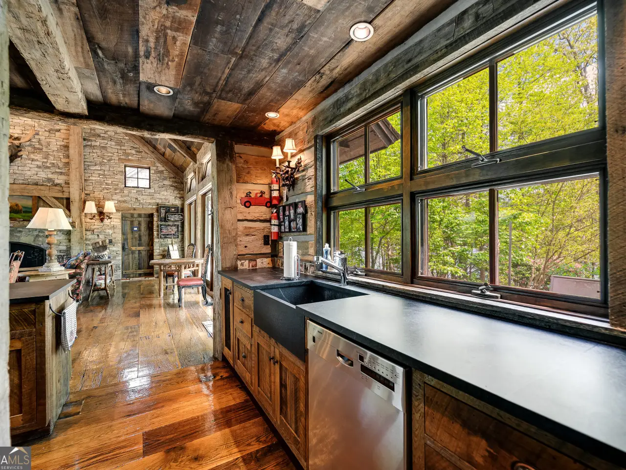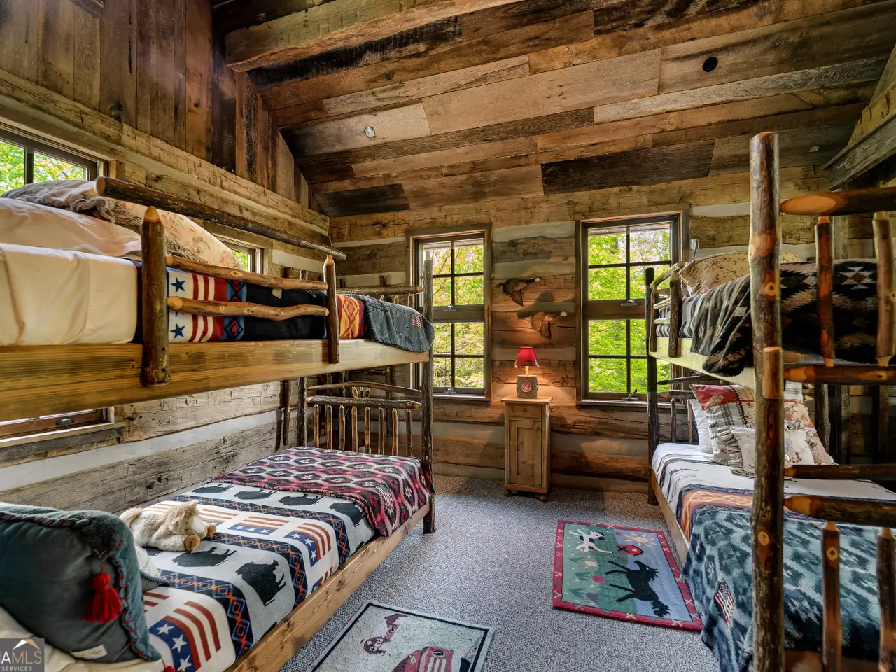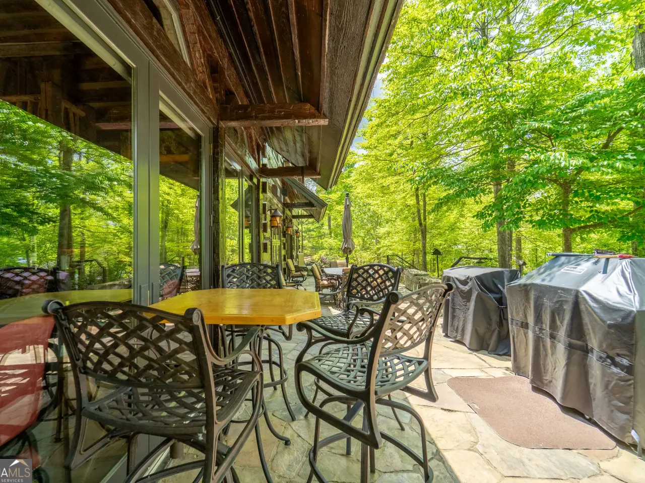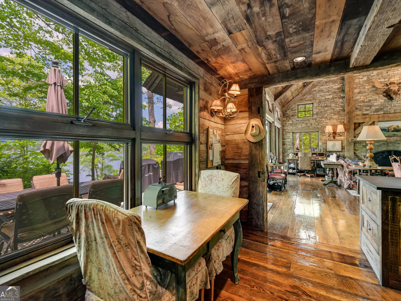 Once-in-a-Lifetime Private Island Estate on Lake Burton Discover the pinnacle of lakeside luxury with this extraordinary 6,186 sqft mountain lodge, perched on its own private island in the heart of Lake Burton's coveted big basin. Offering 360- degree lake and mountain views, total privacy, and Yellowstone-inspired rustic elegance, this one-of-a-kind estate redefines waterfront living. Crafted from reclaimed timbers sourced from Southern cotton mills, the residence exudes old-world craftsmanship and frontier charm. Hand-hewn oak siding with classic chinking, dry stack Tennessee fieldstone, rough-sawn wide plank oak floors, and steel structural supports anchor the home with strength and character. An elegant entry foyer welcomes you from two directions, showcasing east and west views through an open riser staircase with reclaimed treads and flagstone flooring. The soaring great room features lake views from 2 walls, a dramatic cupola, flanking fireplace posts reclaimed from Zachary Taylor Scott's historic home, and a moose antler chandelier complete with a buckshot hole. The chef's kitchen blends style and substance with black soapstone countertops, custom barn wood cabinetry, Viking 6-burner range, dual Bosch dishwashers, refrigerator drawers, custom soapstone sinks and two pantries. The private owner's suite features 3 walls of lake views, a barn wood clad vaulted ceiling and stone fireplace. Each guest bedroom offers unique views and details. The main floor provides 2 guest bedrooms, each with chinked log walls and a private bath. Upstairs, a clever bunk room offers access from 2 separate hallways with a full bath on each end. A large hidden pocket door opens to separate the space into 2 separate bunkrooms when desired. A library with a vaulted ceiling and lake views is currently styled as another guest bedroom upstairs. The terrace level offers a spacious yet cozy media room with a wall of bunk beds against the back wall, a kitchenette with a full fridge/freezer combo, range, sink and dishwasher and laundry room with sink. The gym was designed to mirror the upstairs bunk room, featuring full bathrooms on each end. This space could easily be converted into 2 separate guest bedrooms with the addition of a wall. Outdoors, expansive flagstone patios wrap the home offering views from all directions. Meandering trails of recycled tire wrap the Island, leading to the east wharf and swim dock, putting green, and west side 2-story, 2-stall covered boathouse overlooking one of the most epic sunset views on Lake Burton. Additional Details include: self-contained fire suppression system, copper-clad Kolbe windows, antique terracotta tile, LiteTouch lighting system, extensive security system, 1GB Fiber Optic Internet, slate roof, lightning rods, Generator, central vac. Proof of Funds required before showing. There are security surveillance cameras throughout the island. Do not attempt to access the property without listing agent being present.