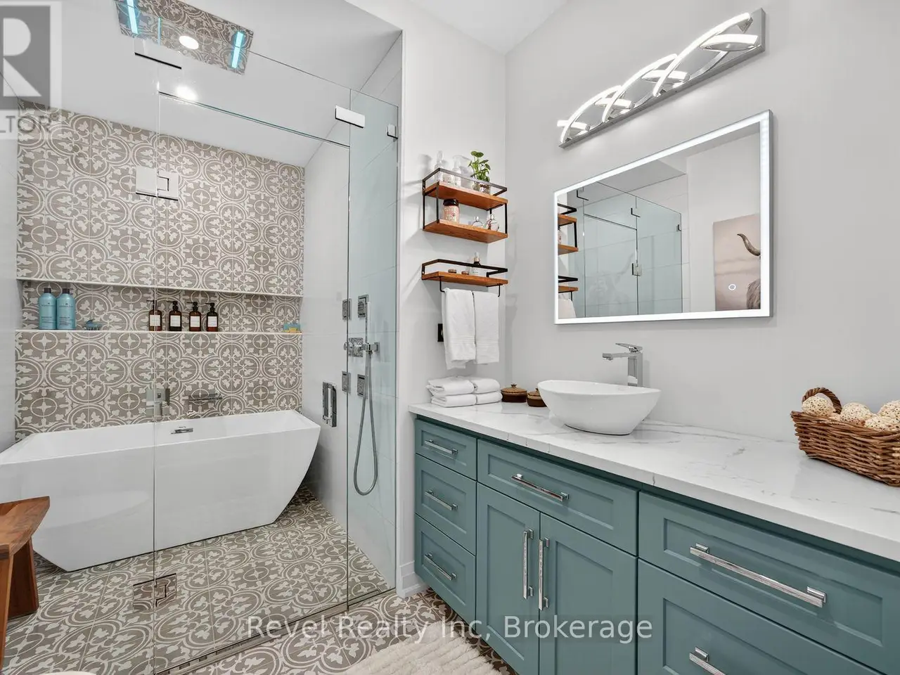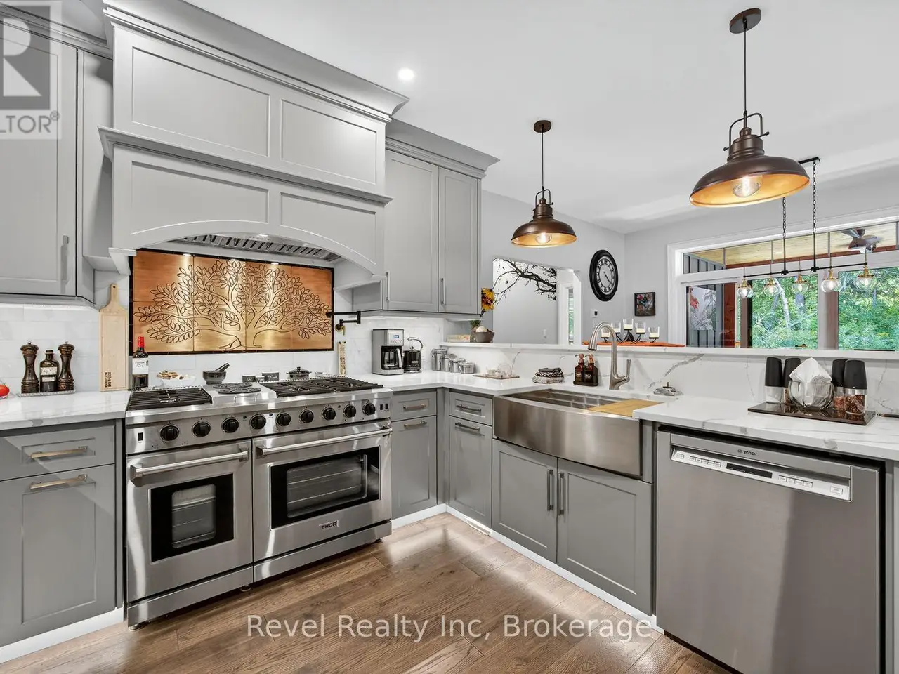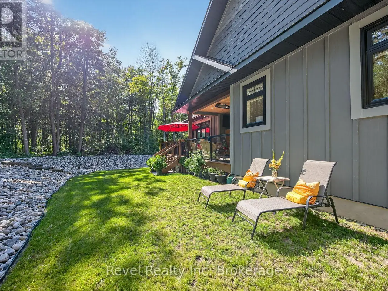 Luxury Living in Exclusive Thunder Beach! Imagine waking up beneath the serene Nipissing Ridge on 1.7 acres of landscaped privacy, with turquoise waters of Georgian Bay just steps away. This nearly new executive bungalow is a rare opportunity to call one of Georgian Bays most prestigious communities home. Every detail of this residence speaks to quality and craftsmanship. Built with ICF foundation and French drains for lasting comfort and energy efficiency, it also showcases rich hardwood floors, custom cabinetry, and spa-inspired bathrooms. The covered porch welcomes you into an airy, open-concept design where a chefs kitchen, featuring a Thor stove, pot filler, walk-in pantry, and multimedia bar, seamlessly connects to the dining area and covered deck. Every window frames tranquil views of trees, never neighbors. The primary suite offers a walk-in closet and a serene ensuite with an oversized glass shower equipped with multiple showerheads for your private spa retreat. Two additional bedrooms and a second full bath complete the main level. The finished lower level extends the lifestyle: radiant in-floor heating, a custom bar, built-in media surround, and oversized windows create a sophisticated entertaining space. Two more bedrooms, a full bathroom, and a walk-up to the heated garage ensure versatility perfect for an in-law suite. Beyond the home, the Thunder Beach lifestyle awaits. Ownership here means more than just a property its belonging to a community. Enjoy access to tennis courts, a private golf club, and a vibrant social scene that has defined this enclave for generations. And as the day closes, watch the horizon light up with sunsets that paint the sky in breathtaking shades of pink and gold. This is not just a home. It is an invitation to live exceptionally where luxury, lifestyle, and Georgian Bays natural beauty come together in perfect harmony. (id:7434)