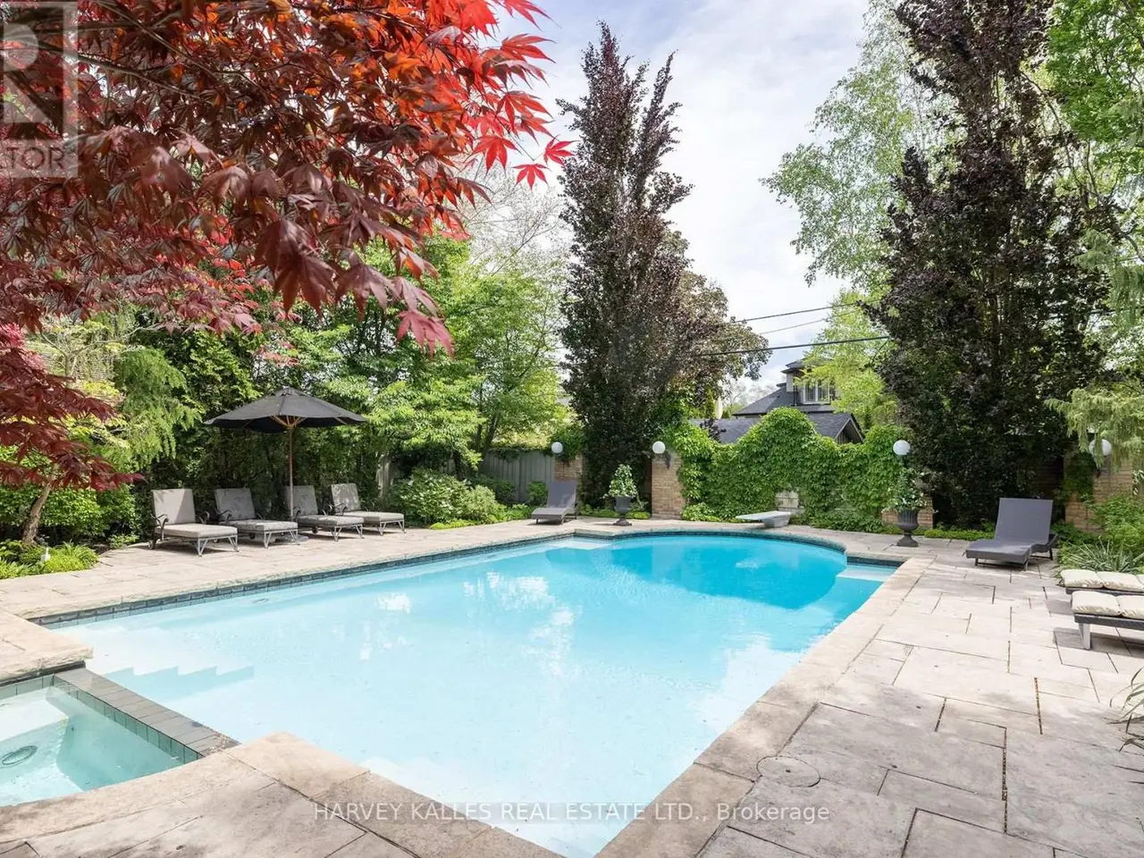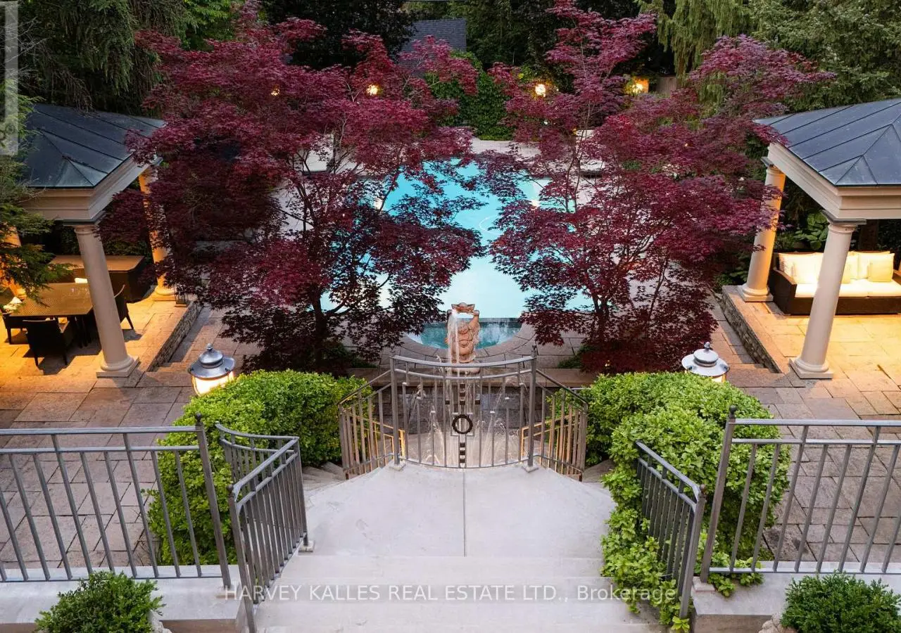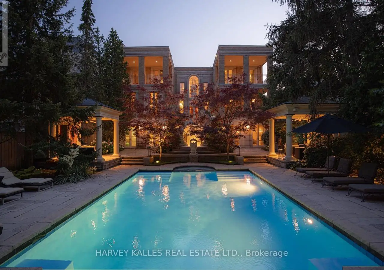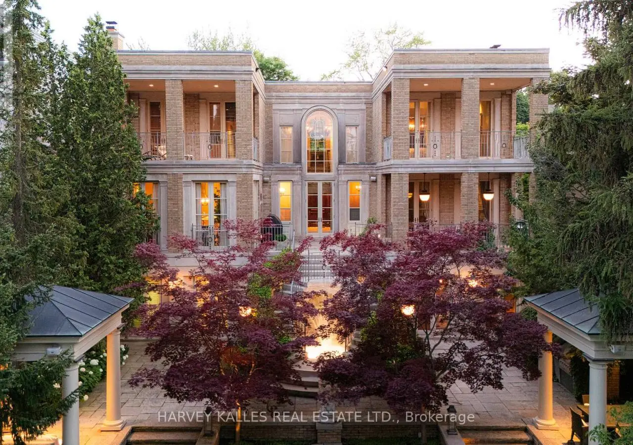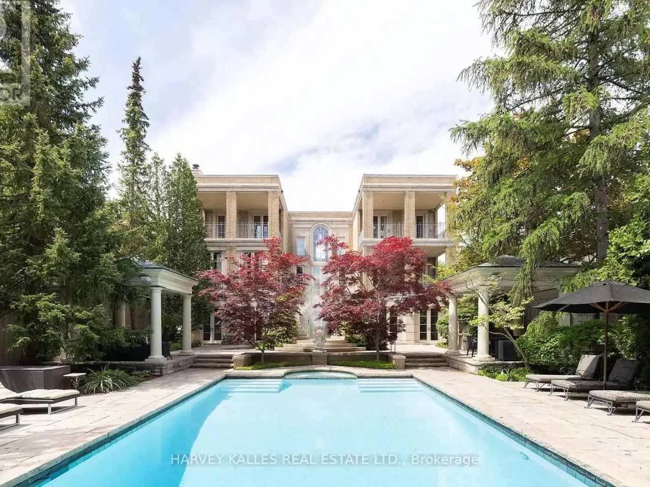 Majestically situated on one of Forest Hills most prestigious streets, this captivating residence masterfully designed by world-renowned architect Gordon Ridgely exemplifies timeless elegance and impeccable craftsmanship. Rooted in classical principles of symmetry, proportion, and balance, the home offers a remarkable blend of grandeur and comfort, ideal for both lavish entertaining and refined everyday living. A wealth of floor-to-ceiling windows, French doors, Juliette balconies, and multiple terraces bathe the interior in natural light, creating an airy, seamless flow throughout the living spaces. Exquisite finishes abound, including wide-plank mahogany hardwood floors and Indiana limestone flooring. The mahogany-paneled library, complete with a wood-burning marble fireplace, offers a warm and sophisticated retreat. A dramatic double staircase leads to the second level, where the serene primary suite features its own fireplace, a spacious walk-in dressing room, and walkout to a private covered terrace. The lower level is a haven for relaxation and recreation, boasting a full spa, entertainment and exercise rooms, and walkouts to beautifully landscaped gardens. Outdoor highlights include a charming gazebo, built-in BBQ, elegant fountain, and a stunning pool all shaded beneath a canopy of mature trees, providing an idyllic and private setting. An incomparable sense of privacy radiates timeless grace and charm, offering a sanctuary in the heart of the city. Perfectly positioned in an enviable location, this distinguished address places you within walking distance of Toronto's finest private and public schools, the boutiques and cafés of Forest Hill Village, premier recreational facilities, and just minutes from downtown and the financial district. (id:6370)