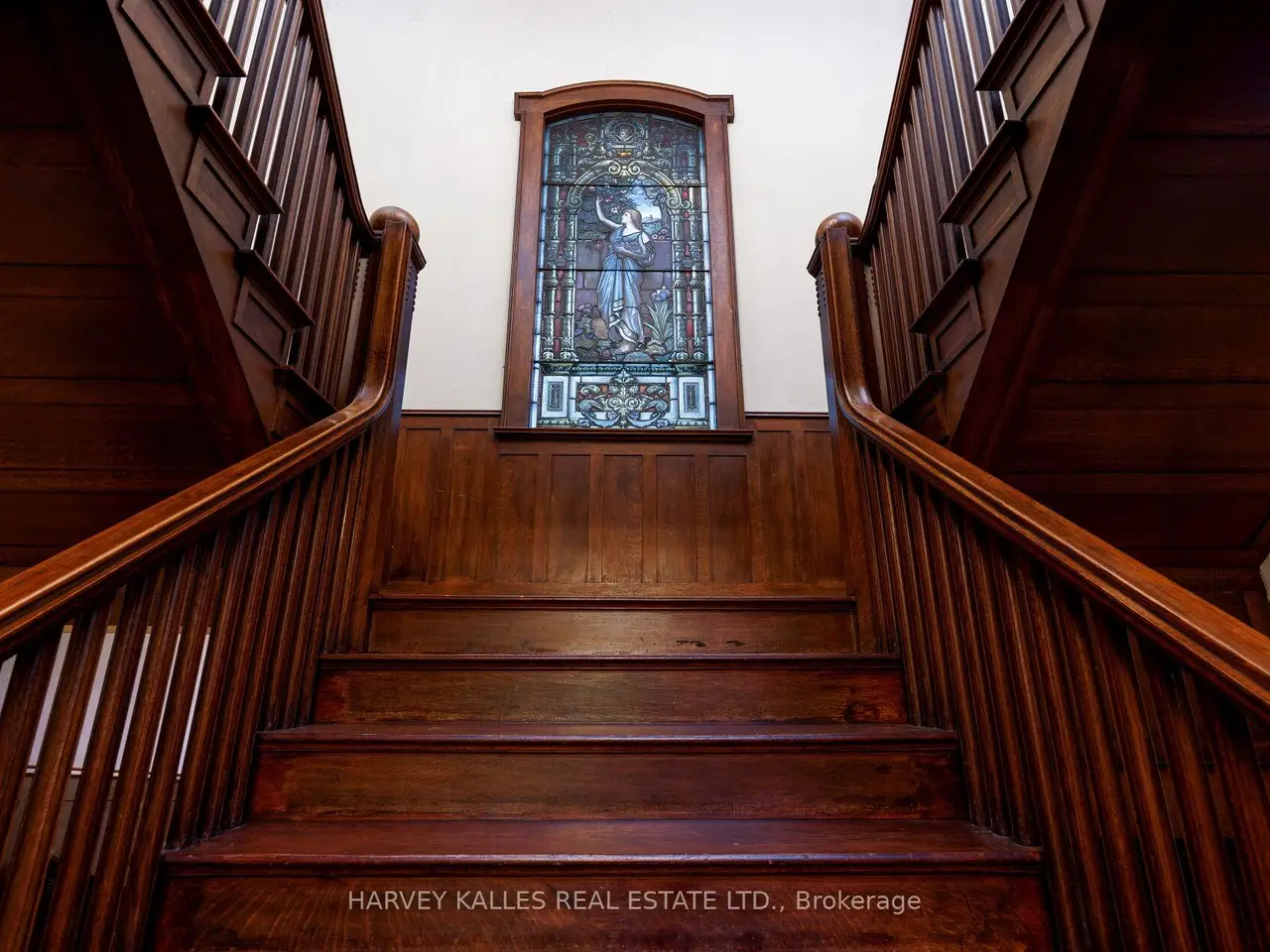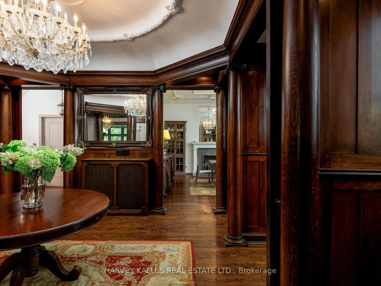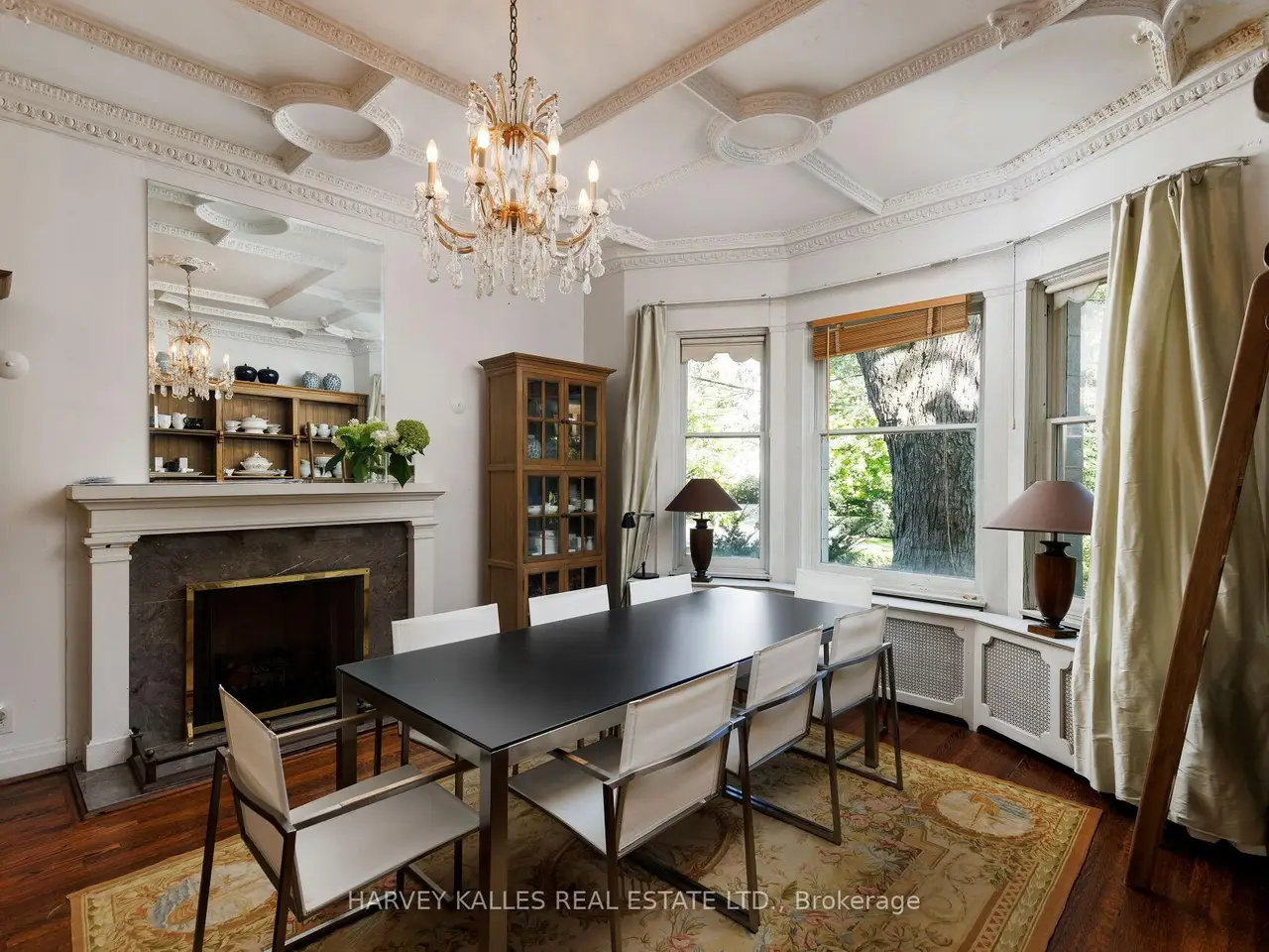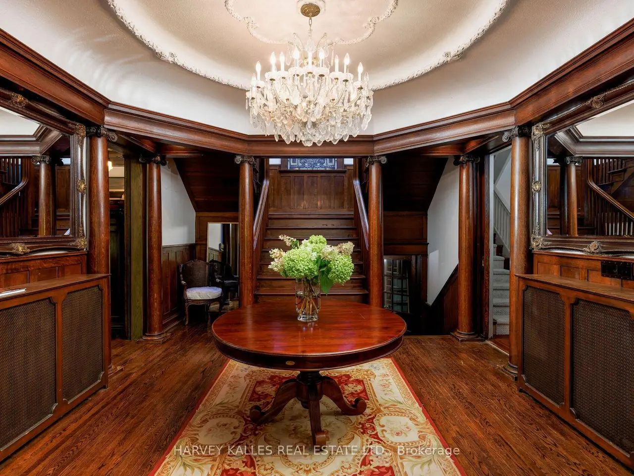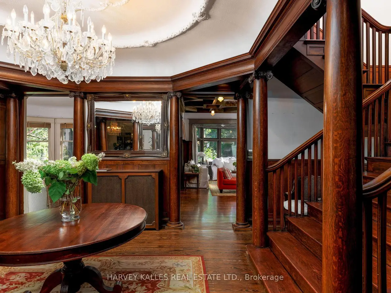 Nestled in Toronto's prestigious Rosedale neighbourhood, this landmark mansion occupies an expansive 100' x 122' estate-sized lot and offers over 7,500 square feet of impeccably designed living spaces. With 7 + 1 generously proportioned bedrooms, 8 bathrooms, and an exceptional third-floor loft, this grand residence seamlessly blends historic architecture with the scale, elegance, and functionality. Originally built circa 1900 for the distinguished Applegate family, the home has been meticulously restored and thoughtfully maintained to preserve it's architectural heritage including a selft portrait stain glass window of Mrs. Applegate herself. Drawing inspiration from the classical traditions of Italian Renaissance architect Andrea Palladiio - most notably his iconic Villa Rotunda in Vicenza, Italy - the home reflects timeless design and exceptional craftmanship. A majestic octagonal central hall, framed by twelve lonic columns, creates an unforgettable first impression and sets the tone for the rest of the residence. Throughout the home, rich period details abound: original oak hardwood floors, finely hand-craved oak mouldings and wainscoting, intricate millwork, and 6 fireplaces with decorative tile and brick hearths. The soaring 10-foot ceilings are adorned with ornate plaster crown mouldings, ceiling medallions, and oak-beamed details that speak to the home's historical significance. Expansive bow windows and beautifully preserved stained glass flood the interior with natural light and highlight the warm, elegant atmosphere. Outside, the property is a private oasis, surrounded by mature trees, lush landscaping, and tranquil gardens that offer rare serenity in the heart of the city. A detached two-car garage and additional parking for three vehicles provide added convenience. This is a once-in-a-generation opportunity to own a truly iconic Rosedale residence - an architectural treasure steeped in history and timeless charm.